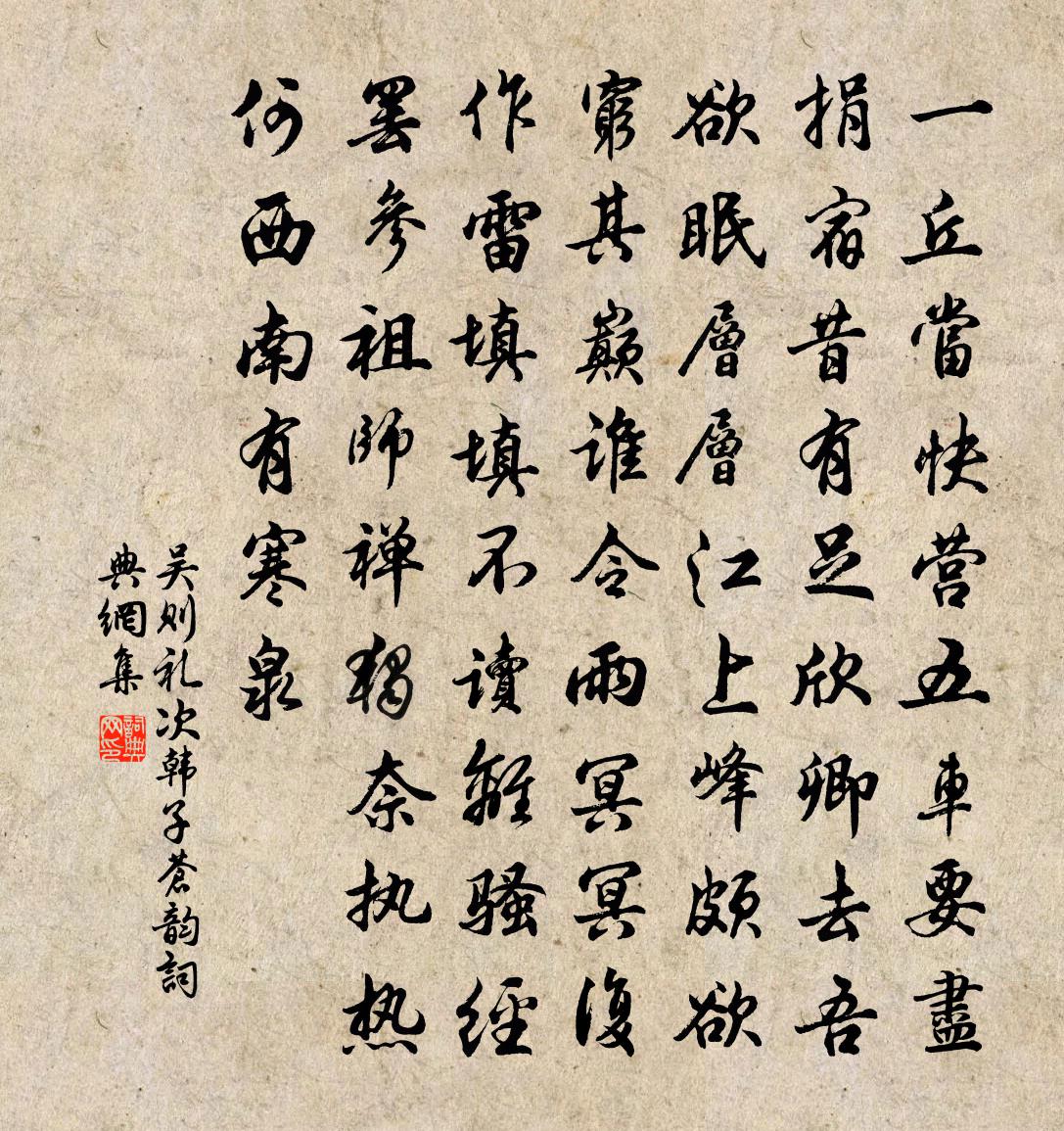 詩詞名句歷史字典書法欣賞書法字典國語詞典說文解字康熙字典古漢語字典標 題 作 者 詩 句 次韓子蒼韻作者:吳則禮 朝代:宋代次韓子蒼韻原文一丘當快營,五車要盡捐。宿昔有足欣,卿去吾欲眠。層層江上峰,頗欲窮其巔。誰令雨冥冥,復作雷填填。不讀離騷經,罷參祖師禪。獨奈執熱何,西南有寒泉。詩詞問答問:次韓子蒼韻的作者是誰?答:吳則禮問:次韓子蒼韻寫於哪個朝代?答:宋代吳則禮次韓子蒼韻書法欣賞次韓子蒼韻書法作品詩詞推薦題永慶壁有雱遺墨數行王安石〔宋代〕永慶招提墨數行,歲時風露每淒傷。殘骸豈久人間世,故有情鍾未可忘。贈淳于公歸養柴成務〔宋代〕九霄析命降絲綸,榮列青宮聽侍親。著□顯通天上籍,循陔重看每邊春。入為鴛鷺行中客,歸作煙霞象外人。一自恭和聞喜宴賜毛自知以下御製魏了翁〔宋代〕雲漢萬章新寵渥,鈞天張樂播和平。微臣置饋申規戒,賢綱雖恢用欲精。書懷陸游〔宋代〕濯錦江頭成昨夢,紫芝山下又新年。久因多病疏雲液,近為長齋進玉延。啼鳥傍檐春寂寂,飛花掠水晚翩翩。支離西江月 贈安靜散人俱守極馬鈺〔元代〕休要尋龍尋虎,不須搜奼搜嬰。勿勞講論汞鉛精。儘是虛名惑恁。只要心中清靜。無為便是功成。慈悲相助氣神凝和李屯田西湖尋春宋祁〔宋代〕把酒同尋湖畔春,賞心何況更良辰。留陰岸雨溥紅杏,送暖汀風惱綠蘋。低寫臥虹橋齒密,小裝文鷁舫頭新。聚星偈釋警玄〔宋代〕夜半烏雞抱鵠卵,天明起來生老鸛。鶴毛鷹觜鷺鸞身,卻共烏鴉為侶伴。高入煙霄,低飛柳岸。向晚歸來子細看,自寬陸游〔宋代〕兀兀空齋靜掩扉,篝爐香細著秋衣。檐頭殘雨晴猶滴,欄角羈雲晚未歸。支枕口和心共語,挑燈形與影相依。卷書題汪季路太丞魏野草堂圖二首楊萬里〔宋代〕汾陰西祀告昇平,四海無波鏡樣清。乞與幽人好風月,萬山里許聽泉聲。題臨川晏子直百花林史彌寧〔宋代〕溪園歌筦日紛分,錦鄉香中扶醉人。斗酒不嫌呼李白,倩渠品藻一林春。春興戲題贈李侯岑參〔唐代〕黃雀始欲銜花來,君家種桃花未開。長安二月眼看盡,寄報春風早為催。慶江檢詳太夫人潛放〔宋代〕誰謂廬陵是富州,反成窮匱省支。壽筵只作家常辦,不學豪奢呈逞異差。句王隨〔宋代〕岩深松半露,石亂水分流。仆自以四十四日自延平歸所寓之南軒積雨陰濕朱槔〔宋代〕蘧蘧飛夢過雲鄉,物色清輝眼界長。閶闔未招金馬士,蓬萊先立玉瀾堂。千尋濯足衣裘冷,六字喔詩筆硯香。當與和孫端叟寺丞農具十五首其三摟種梅堯臣〔宋代〕農人力已勤,要在布嘉種。手持高斗柄,觜瀉三犁壠。月下叱黃犢,原邊過廢冢。安知俠少年,玉食金羈擁。踏莎行(壬午元宵戲呈元汝功參議)侯置〔宋代〕元夕風光,中興時候。東風著意催梅柳。誰家銀字小笙簧,倚闌度曲黃昏後。撥雪張燈,解衣貰酒。觚稜金碧聞依和聖俞春雨王珪〔唐代〕雲飛寒影欲千層,暝雨兼風斷復增。羃羃池台空鎖樹,蕭蕭簾幕更飄燈。歸將春晚花應笑,老入年來酒易凌。溝水山坡羊·北邙山懷古張養浩〔元代〕悲風成陣,荒煙埋恨,碑銘殘缺應難認。知他是漢朝君,晉朝臣?把風雲慶會消磨盡,都做北邙山下塵。便是君,徑山出鄉舟中寄二偈示眾釋鹹傑〔宋代〕三冬水上打鞦韆,百尺竿頭棹釣船。寄語滿堂龍象眾,無勞掘地覓青天。旅況釋文珦〔宋代〕日暮投村館,悽然逆旅情。地荒頻有盜,城遠不聞更。度歲無多日,思鄉是幾程。聽雞還束被,霜月伴晨征。名句推薦有錢道真語,無錢語不真。佚名《增廣賢文·上集》 蕙風如薰,甘露如醴。左思《三都賦》 稱是秦時避世人,勸酒相歡不知老。李白《山人勸酒》 羅幕輕寒,燕子雙飛去。晏殊《蝶戀花·檻菊愁煙蘭泣露》 騁望因高雲外盡,鄉關回首愧煙蘿。石茂華《九月九日登長城關》 上智不教而成,下愚雖教無益,中庸之人,不教不知也。顏之推《顏氏家訓·教子篇》 溪壑可盈,志欲無滿。姚察、姚思廉《梁書·列傳·卷五十三》 綠葉兮素華,芳菲菲兮襲予;屈原《九歌》 凡出言,信為先。詐與妄,奚可焉?李毓秀《弟子規·信》 中秋佳月最端圓。老痴頑。見多番。陳著《江城子·中秋早雨晚晴》