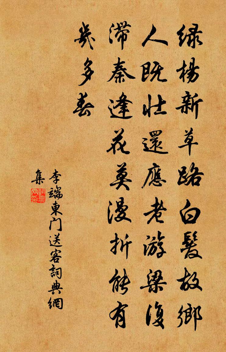 詩詞名句歷史字典書法欣賞書法字典國語詞典說文解字康熙字典古漢語字典標 題 作 者 詩 句 東門送客作者:李端 朝代:唐代東門送客原文綠楊新草路,白髮故鄉人。既壯還應老,游梁復滯秦。逢花莫漫折,能有幾多春。詩詞問答問:東門送客的作者是誰?答:李端問:東門送客寫於哪個朝代?答:唐代問:東門送客是什麼體裁?答:五古李端東門送客書法欣賞東門送客書法作品注釋全唐詩:卷284_26詩詞推薦頌十玄談達本釋印肅〔宋代〕更無一物獻尊堂,剔出銀盆耀雪霜。箭既離弦無退轉,洞山收悔不思量。觀物丘葵〔宋代〕萬物即一物,一物即一身。妙合氣與靈,知覺日以新。物物為過化,性性為存神。踐形者惟肖,其斯之謂人。和文倅侯彥嘉二首王之道〔宋代〕相逢珠玉走佳章,顧我無能更老蒼。嘗鼎固應從指染,沖天行喜見雲翔。向來別恨江同遠,此去詩情日共長。才似同和詠樓前海石榴二首孫逖〔唐代〕客自新亭郡,朝來數物華。傳君妓樓好,初落海榴花。露色珠簾映,香風粉壁遮。更宜林下雨,日晚逐行車。海上繡觀音酬郢州王知錄丹青美人之贈兩絕洪咨夔〔宋代〕十相端嚴具足身,一團楊柳淨瓶春。石城莫與蛾眉看,羞不如人卻妒人。老梅舒岳祥〔宋代〕已經和靖吟半樹,又入花光畫折枝。此語便經三百載,此格又閱景炎時。恭謝慶成詩十闋武衍〔宋代〕大官宣勸禮優寬,中殿刀嬪各盡歡。和氣滿城天色好,不妨直際晚迴鑾。送紫霄女道士四明謝君陸游〔宋代〕一別南充十四年,時時清夢到金泉。山 * 上秋風早,卻見神仙小自然。簡辨老李處權〔宋代〕松杉高下韻笙簫,谷口鐘聲梵海潮。秋氣作陰連蟋蟀,夜寒隨雨上芭蕉。身危甚幸依賢庇,吏隱何須覓句招。直待宮詞張公庠〔宋代〕宿麥葳蕤綠未回,惡風惟解卷法埃。平明瑞雪深三尺,萬歲聲中賀表來。頌古四十五首釋如珙〔宋代〕鐘鳴眾集歸方丈,苦殺堂頭請法人。法法本來無一法,若言無法法纏身。山居十首方岳〔宋代〕我愛山居好,躋攀繚暝煙。偃松低可坐,橫石劣容眠。菊徑重陽酒,梅花雪後天。一筇事事足,與世自無緣。題汪水雲詩卷祝從龍〔宋代〕竹杖芒鞋短後衣,抱琴何處覓鍾期。百年爛醉烏程酒,千首新吟晉宋詩。京洛風塵如昨日,湖山水月此何時。近來青玉案李曾伯〔宋代〕去年曾借梅為壽。轉眼垂弧小春又。一笑巡檐清影瘦。雪邊聊且,收香藏白,少俟融和透。新來東閣高吟就。金鼎山居示靈澈上人皎然〔唐代〕晴明路出山初暖,行踏春蕪看茗歸。乍削柳枝聊代札,時窺雲影學裁衣。身閒始覺隳名是,心了方知苦行非。外物題臥屏十八花芍藥葛立方〔宋代〕沉水飄香透蕊塵,紅燈爍爍一枝春。鼠姑倚檻雖無賴,未肯甘為近侍臣。教授丈作黃字韻詩十首愈出愈奇而有作法孰為趙蕃〔宋代〕苦思髭催白,交馳耳困黃。欣欣貪得侶,落落異殊鄉。顧欲窮余短,安能敵眾長。蒹葭倚玉樹,華袞照龐涼。鷓鴣天·陌上柔桑破嫩芽辛棄疾〔宋代〕陌上柔桑破嫩芽,東鄰蠶種已生些。平岡細草鳴黃犢,斜日寒林點暮鴉。山遠近,路橫斜,青旗沽酒有人家。城中卜居招書侶杜牧〔唐代〕憶昨未知道,臨川每羨魚。世途行處見,人事病來疏。微雨秋栽竹,孤燈夜讀書。憐君亦同志,晚歲傍山居。九字梅花詠明本〔元代〕昨夜西風吹折千林梢,渡口小艇滾入沙灘坳。野橋古梅獨臥寒屋角,疏影橫斜暗上書窗敲。半枯半活幾個擫蓓蕾,名句推薦食者,國之寶也;兵者,國之爪也墨子《墨子·05章 七患》 杏花無處避春愁,也傍野煙發韓元吉《好事近·汴京賜宴聞教坊樂有感》 別日南鴻才北去,今朝北雁又南飛。魚玄機《閨怨》 樹陰滿地日當午,夢覺流鶯時一聲。蘇舜欽《夏意》 雨余溪水掠堤平,閒看村童謝晚晴。陸游《觀村童戲溪上》 昭君拂玉鞍,上馬啼紅頰。李白《王昭君二首》 明月松間照,清泉石上流。王維《山居秋暝》 物是人非事事休,欲語淚先流。李清照《武陵春·春晚》 不挾長,不挾貴,不挾兄弟而友。孟子《孟子·萬章章句下·第三節》 不覺新涼似水,相思兩鬢如霜。劉辰翁《西江月·新秋寫興》