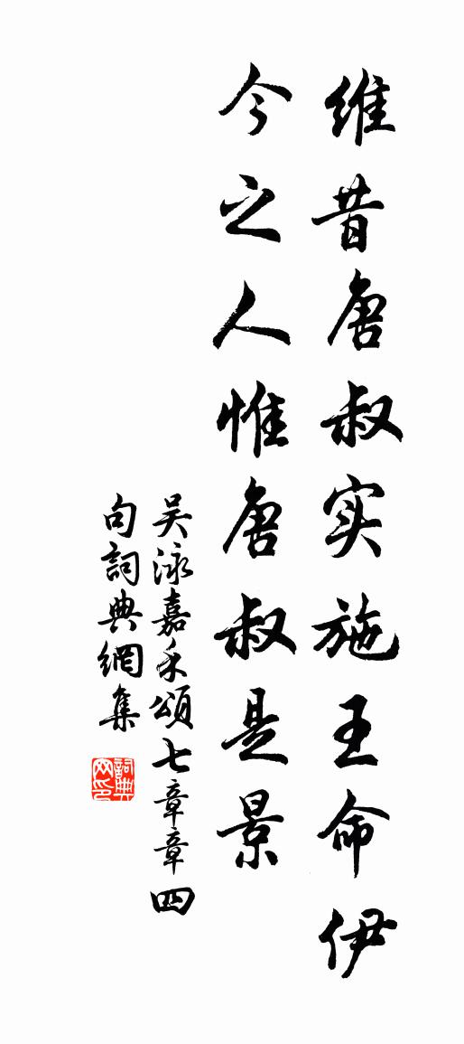 詩詞名句歷史字典書法欣賞書法字典國語詞典說文解字康熙字典古漢語字典標 題 作 者 詩 句 嘉禾頌七章章四句作者:吳泳 朝代:宋代嘉禾頌七章章四句原文維昔唐叔,實施王命。伊今之人,惟唐叔是景。詩詞問答問:嘉禾頌七章章四句的作者是誰?答:吳泳問:嘉禾頌七章章四句寫於哪個朝代?答:宋代吳泳嘉禾頌七章章四句書法欣賞嘉禾頌七章章四句書法作品詩詞推薦燕山亭趙佶〔宋代〕裁翦冰綃,打疊數重,冷淡燕脂勻注。新樣靚妝,艷溢香融,羞殺蕊珠宮女。易得凋零,更多少、無情風雨。愁苦鷓鴣天·晚日寒鴉一片愁辛棄疾〔宋代〕晚日寒鴉一片愁。柳塘新綠卻溫柔。若教眼底無離恨,不信人間有白頭。腸已斷,淚難收。相思重上小紅樓。情知菩薩蠻(鑒止蓮花穿闌乾開)趙師俠〔宋代〕水風葉底波光淺。亭亭翠蓋紅妝面。六月下塘春。平鋪雲錦屏。露涼輕點綴。綠映珍珠袂。渾似太真妃。倚闌嬌困旅中過重陽朱慶餘〔唐代〕一歲重陽至,羈游在異鄉。登高思舊友,滿目是窮荒。草際飛雲片,天涯落雁行。故山籬畔菊,今日為誰黃。琳老惠麩乾隆走筆奉寄毛滂〔宋代〕何 * 鋏苦思魚,食肉而飛亦任渠。誰見東堂病居士,山僧乞食亦分余。湖心亭看雪張岱〔明代〕崇禎五年十二月,余住西湖。大雪三日,湖中人鳥聲俱絕。是日更定矣,余挐一小舟,擁毳衣爐火,獨往湖心亭看一叢花楊無咎〔宋代〕娟娟□月可庭方。窗戶進新涼。美人為我歌新曲,翻身調、韻超出宮商。犀箸細敲,花瓷清響,餘韻繞紅梁。風流北歸度嶺寄子由蘇軾〔宋代〕青松盈尺間香梅,儘是先生去後栽。應笑來時無一物,手攜拄杖卻空回。頌古二十五首釋崇岳〔宋代〕出得出不得,攧落精靈窟。何處不風流,祖師無妙訣。烏夜啼盧祖皋〔宋代〕柳色津頭泫綠,桃花渡口啼紅。一春又負西湖醉,離恨雨聲中。客袂迢迢西塞,餘寒翦翦東風。誰家拂水飛來燕,又溪山堂次韻四首韓元吉〔宋代〕九衢塵土鬢毛蒼,只有溪山意味長。但得楓林供欸乃,猶勝斗博伊涼。足疾陸游〔宋代〕足疾惟妨拜,登臨故自如。深知造物意,遣遂此心初。東塢閒看竹,西溪獨釣魚。暮歸猶未倦,把卷遶前除。郊廟歌辭。禪社首樂章。太和賀知章〔唐代〕昭昭有唐,天俾萬國。列祖應命,四宗順則。申錫無疆,宗我同德。曾孫繼序,享神配極。鷓鴣天(剪彩花送珍省試)劉鼎臣妻〔宋代〕金屋無人夜剪繒。寶釵翻作齒痕輕。臨行執手殷勤送,襯取蕭郎兩鬢青。聽囑付,好看承。千金不抵此時情。明年南峰庵趙不群〔宋代〕庵枕青溪四面山,爐煙未斷日初殘。高僧丈室修然靜,案上楞嚴久不看。題張季良適性齋傅察〔宋代〕揚雄家無儋石儲,閉門作賦擬相如。鄴侯插架多異書,牙籤萬軸吞石渠。吾友張子斯人徒,嗜好酸鹹與眾殊。被褐中元日以春花數種送閻才元左司閻賦二絕句次周必大〔宋代〕韓郎牡丹跡已久,殷七杜鵑名謾新。何以熙熙行闕里,花隨和氣四時春。新亭周師成〔宋代〕昔日新亭今則舊,百年名義只如新。高談坐上無安石,灑淚尊前有伯仁。對面飛來帆影少,傳音吹過羽書頻。青天挽應偉節尊人吳芾〔宋代〕歸來閭里問高年,此日惟公五福全。三世儒科身及見,四經鄉飲眾推先。安時不恨青衫晚,適意還欣彩服鮮。終始乙巳邵武建寧夜坐書呈諸公陳普〔宋代〕深山夭矯老風霜,自是光明好棟樑。不待萬牛托挽去,不如僵柳與枯楊。名句推薦誰向若耶溪上,倩美人西去,麋鹿姑蘇。辛棄疾《漢宮春·會稽蓬萊閣懷古》 獨在異鄉為異客,每逢佳節倍思親。王維《九月九日憶山東兄弟 / 九月九憶山東兄弟》 能者勞而俯怨,何如拙者逸而全真。洪應明《菜根譚·概論》 罰慎其濫,惠戒其偏。罰濫則無以為罰,惠偏則不如無惠沈約《宋書·列傳·卷七十三》 孔雀東南飛,五里一徘徊。佚名《孔雀東南飛 / 古詩為焦仲卿妻作》 慎厥身,修思永。佚名《尚書·虞書·皋陶謨》 多謝月相憐,今宵不忍圓。朱淑真《菩薩蠻·山亭水榭秋方半》 滿載一船秋色,平鋪十里湖光。張孝祥《西江月·阻風山峰下》 乃幽武置大窖中,絕不飲食。天雨雪。班固《蘇武傳(節選)》 朝落暮開空自許,竟無人解知心苦晏幾道《蝶戀花·笑艷秋蓮生綠浦》