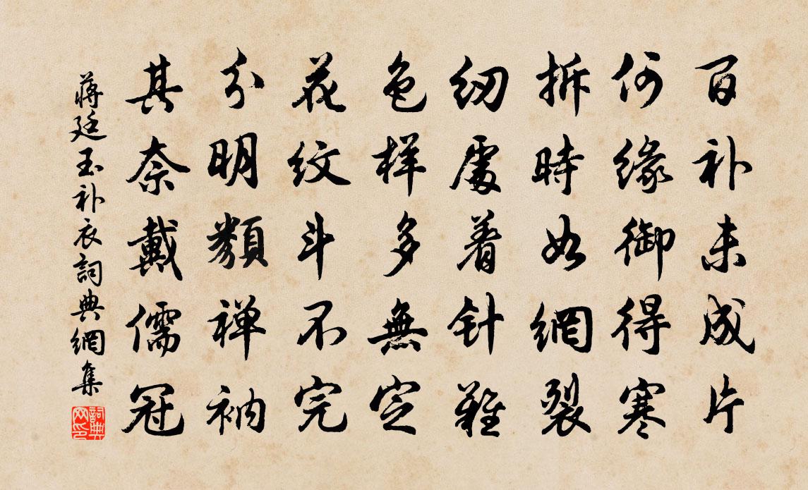 詩詞名句歷史字典書法欣賞書法字典國語詞典說文解字康熙字典古漢語字典標 題 作 者 詩 句 補衣作者:蔣廷玉 朝代:宋代補衣原文百補未成片,何緣御得寒。拆時如網裂,紉處著針難。色樣多無定,花紋斗不完。分明類禪衲,其奈戴儒冠。詩詞問答問:補衣的作者是誰?答:蔣廷玉問:補衣寫於哪個朝代?答:宋代蔣廷玉補衣書法欣賞補衣書法作品詩詞推薦湖南道中三首王阮〔宋代〕萬壑千岩我一家,別來空自鎖煙霞。閒雲不放行人望,故向東南角上遮。減字木蘭花(七勸)沈瀛〔宋代〕酒巡未止。且聽七言餘韻喜。彈到《悲風》。醒酒風吹路必通。休休避酒。末後茶仙來獻壽。七碗休何。不獨茶多枕上陸游〔宋代〕夜雨一再作,燈前獨詠詩。影看孤鶴瘦,吟答斷蛩悲。幽夢悠然覺,清笳何足吹。殘年猶幾日,已矣媿明時。比日風雨甚異山下人云此六月龍會時也中頂有晁說之〔宋代〕西峰掩映東峰明,倏忽起滅令人驚。九野雨足龍上征,六月正乃會琀珩。雷電斷絕風來輕,鼓倡鼙和鈴簫笙。虹霓瑞鶴仙(和丁基仲)佚名〔宋代〕畫樓簾卷翠。正柳約東風,搖盪東霽。緗桃雨才洗。似妝臨寶鏡。脂凝鉛水,雲遍髻子。墜釵梁、羞看燕壘。最堪閱書庫孫應時〔宋代〕寒儒事業趁三餘,細字篝燈手自書。眼底牙籤富連屋,妙年公子意何如。金人捧露盤(梅花)高觀國〔宋代〕念瑤姬,翻瑤佩,下瑤池。冷香夢、吹上南枝。羅浮夢杳,憶曾清曉見仙姿。天寒翠袖,可憐是、倚竹依依。溪痕以空飛本無跡韻為五詩往扣廣微張公戴表元〔宋代〕智有不近名,賢有不踐跡。百年如飄風,誰作遠行客。所要在持久,以道自訊息。吾師豈欺我,白首方學易。程泰之昨有金帶銀章之句十月二十八日乃因押周必大〔宋代〕甚日重黃侍玉鑾,幾時八座佩金寒。殿庭屬目夸新貴,部曲低頭拜舊官。五日尹京非細事,四時仕宦固多般。重行梅花引 荊溪阻雪蔣捷〔宋代〕白鷗問我泊孤舟。是身留。是心留。心若留時、何事鎖眉頭。風拍小簾燈暈舞,對閒影,冷清清,憶舊遊。舊遊舊過餘干吳師中秀才以小詩惠歙硯次韻謝之周必大〔宋代〕舊曾起草向明光,獨與羅文近赭黃。三載瓦池研灶墨,因君聊復夢儀凰。哭女樊元稹〔唐代〕秋天淨綠月分明,何事巴猿不賸鳴。應是一聲腸斷去,不容啼到第三聲。旅館秋思於濆〔唐代〕旅館坐孤寂,出門成苦吟。何事覺歸晚,黃花秋意深。寒蝶戀衰草,軫我離鄉心。更見庭前樹,南枝巢宿禽。至豐城懷溫叟叔異南秀欲題之叔異曲江磯之庵趙蕃〔宋代〕浩浩寒流急,蕭蕭落木高。江山故雙劍,人物欠三豪。客意已愁絕,風聲仍怒號。相思意無極,佇立首頻搔。蟠雪夜登浦金樓遠望西山憶仲靈洒然有邁世之楊蟠〔宋代〕家占西湖島上雲,雪光月色更侵魂。興來爛漫心空老,詩罷蒼茫眼正昏。晉國衣冠何處覓,梁朝殿閣儼猶存。思君述懷陳梅莊〔宋代〕出城忽忽欲昏黃,又了浮生半日忙。侍妾不須燒絳蠟,讓由明月入迴廊。題林同舍初心詩集何夢桂〔宋代〕與君別一世,忽見疑夢境。感往雙淚縣,華發各垂領。青燈對白酒,相勖敦暮景。別後詩逾佳,朗歌竟夜永。西江月馬鈺〔元代〕莫論心肝腎肺。休搜南北東西。勿言震兌坎和離。別有些兒奧旨。吸盡江河淮濟。星辰日月輝輝。精神氣血赴丹池好事近趙可〔元代〕密雪聽窗知,午醉晚來初覺。人與膽瓶梅蕊,共此時蕭索。倚窗閒看六花飛,風輕止還作。個裡有詩誰會,滿疏籬再次韻十首陳造〔宋代〕曲巷才人跡,泥塗沒屐深。未妨沖雨到,要伴掉頭吟。大巧專亭毒,何時掃疹淫。濁醪君莫厭,排悶勉孤斟。名句推薦兩鬢可憐青,只為相思老。晏幾道《生查子·關山魂夢長》 天秋木葉下,月冷莎雞悲。李白《秋思》 新帖繡羅襦,雙雙金鷓鴣。溫庭筠《菩薩蠻·小山重疊金明滅》 善無主於心者不留,行莫辯於身者不立。墨子《墨子·02章 修身》 其進銳者,其退速。孟子《孟子·盡心章句上·第四十四節》 丈夫一言許人,千金不易。司馬光《資治通鑑·唐紀二》 刷羽同搖漾,一舉還故鄉。沈約《詠湖中雁》 男兒西北有神州,莫滴水西橋畔淚。劉克莊《玉樓春·戲林推》 飯疏食飲水,曲肱而枕之,樂亦在其中矣。不義而富且貴,於我如浮雲。孔子弟子《論語·述而篇》 懷舊空吟聞笛賦,到鄉翻似爛柯人。劉禹錫《酬樂天揚州初逢席上見贈》