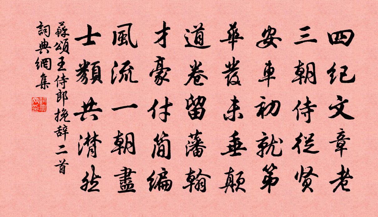 詩詞名句歷史字典書法欣賞書法字典國語詞典說文解字康熙字典古漢語字典標 題 作 者 詩 句 王侍郎輓辭二首作者:蘇頌 朝代:宋代王侍郎輓辭二首原文四紀文章老,三朝侍從賢。安車初就第,華發未垂顛。道卷留藩翰,才豪付簡編。風流一朝盡,士類共潸然。詩詞問答問:王侍郎輓辭二首的作者是誰?答:蘇頌問:王侍郎輓辭二首寫於哪個朝代?答:宋代蘇頌王侍郎輓辭二首書法欣賞王侍郎輓辭二首書法作品詩詞推薦別威德寺陳師道〔宋代〕三宿城隈寺,輕齎類老禪。暫來真偶爾,適去更翛然。笑別留春塢,行尋下瀨船。此身猶斷梗,飄泊且隨緣。斗山子王深父作石屏記為老夫書其文甚佳采記戴復古〔宋代〕細讀石屏記,誠然愧我心。蘭蓀借芳馥,金石假聲音。俗子方騰謗,朋儔合獻箴。分為無用物,白髮委山林。寄范石湖五首王阮〔宋代〕殊庭詔祿佚忠勤,秘殿升班寵舊勛。試向午橋諸第問,有誰別墅得奎文。日晚歸山詞施肩吾〔唐代〕虎跡新逢雨後泥,無人家處洞邊溪。獨行歸客晚山里,賴有鷓鴣臨路岐。題上清法堂壁白玉蟾〔宋代〕秋雨懸天風作寒,冷煙鎖住屋頭山。半岩飛鳥一聲過,峭壁斷雲千古閒。世俗不知幽靜處,神仙隱在有無間。夜來和令狐相公入潼關劉禹錫〔唐代〕寒光照旌節,關路曉無塵。吏謁前丞相,山迎舊主人。東瞻軍府靜,西望敕書頻。心共黃河水,同升天漢津。題曾幼度詩集後二首趙蕃〔宋代〕江南山水盡宜詩,幾欲經營竟不奇。不料此編能到手,意曾關處輒能知。代白頭吟鮑照〔南北朝〕直如朱絲繩。清如玉壺冰。何慚宿昔意。猜恨坐相仍。人情賤恩舊。世議逐衰興。毫髮一為瑕。丘山不可勝。食苗玉堂中賡任宮講希夷惠詩韻汪莘〔宋代〕宮講先生句子香,晦庵衣缽有餘芳。松篁性本參天直,楊柳情仍庇地長。自恨此身真逆旅,不知何日更傳觴。山人和詠梅衛宗武〔宋代〕獨占東風第一籌,孤芳不與眾芳侔。飄零猶待調金鼎,未逐凡花浪蕊休。約圓機不至將出遊雞頭山作二絕句晁說之〔宋代〕君知我亦有柴關,我豈輸君獨自閒。把筆何人鳳尾諾,杖藜望我雞頭山。奉懷養源士特似表李處權〔宋代〕一坐關山百念灰,德鄰詩社許徘徊。靜看林鳥銜花去,寒覺溪風送雨來。小阮有懷應種竹,步兵無事且傳杯。東床戲呈希古張耒〔宋代〕半世辛勤守黃卷,白頭容易過青春。枕前亦覺春晴否,試問東鄰晚起人。楚州張弋〔宋代〕落帆停鼓鸛湖頭,兩度因循到楚州。柳下人家曾識面,笑求新句寫妝樓。明堂觀禮雜詠十三首回龍橋望駕王同祖〔宋代〕兩行衛士錦宮袍,成歲聲長徹九皋。過盡羽旄風細細,彩雲不動御爐高。賀周益公歸休尹直卿〔宋代〕六一先生薄吉州,歸田去作穎昌游。我公不向螺江住,羞殺青原白鷺洲。野興陸游〔宋代〕晨炊畲粟薦園蔬,默計生涯已有餘。舉世方夸稽古力,滿懷空貯活人書。悶呼赤腳行沽酒,出遣蒼頭旋僦驢。不為三月五日過雲南竺湘家舊寓南軒懷朝見陳著〔宋代〕憶昨攜兒寄小軒,兒今何在小軒存。喚爹若有褰裳語,戀母猶多淚席痕。兩樹桃花飛痛血,一山松影護遊魂。銷凝題徑山一覽亭喻良能〔宋代〕歷覽眾峰頂,下視飛鳥背。一身凌紫霞,迥出塵寰外。贈商水連尉同年祖無擇〔宋代〕場屋相知最有情,去年同試便同榮。神仙名籍輪梅福,典冊文章滯馬卿。泣玉淚收休積恨,擲金詞在藹新聲。公卿名句推薦用之在於機,顯之在於勢。姜子牙《六韜·文韜·兵道》 蜀魂飛繞百鳥臣,夜半一聲山竹裂。林景熙《冬青花》 送君歸去愁不盡,又惜空度涼風天。王昌齡《送狄宗亨》 其次致曲。曲能有誠。誠則形。形則著。著則明。明則動。動則變。變則化。唯天下至誠為能化。子思《中庸·第二十三章》 八月秋高風怒號,卷我屋上三重茅。杜甫《茅屋為秋風所破歌》 蜂爭粉蕊蝶分香,不似垂楊惜金縷。溫庭筠《惜春詞》 雨歇梧桐淚乍收,遣懷翻自憶從頭。納蘭性德《浣溪沙·雨歇梧桐淚乍收》 山荒聊可田,錢鎛還易辦。王守仁《謫居糧絕請學於農將田南山詠言寄懷》 朱弦已為佳人絕,青眼聊因美酒橫。黃庭堅《登快閣》 願妾身為紅菡萏。年年生在秋江上。歐陽修《漁家傲·近日門前溪水漲》