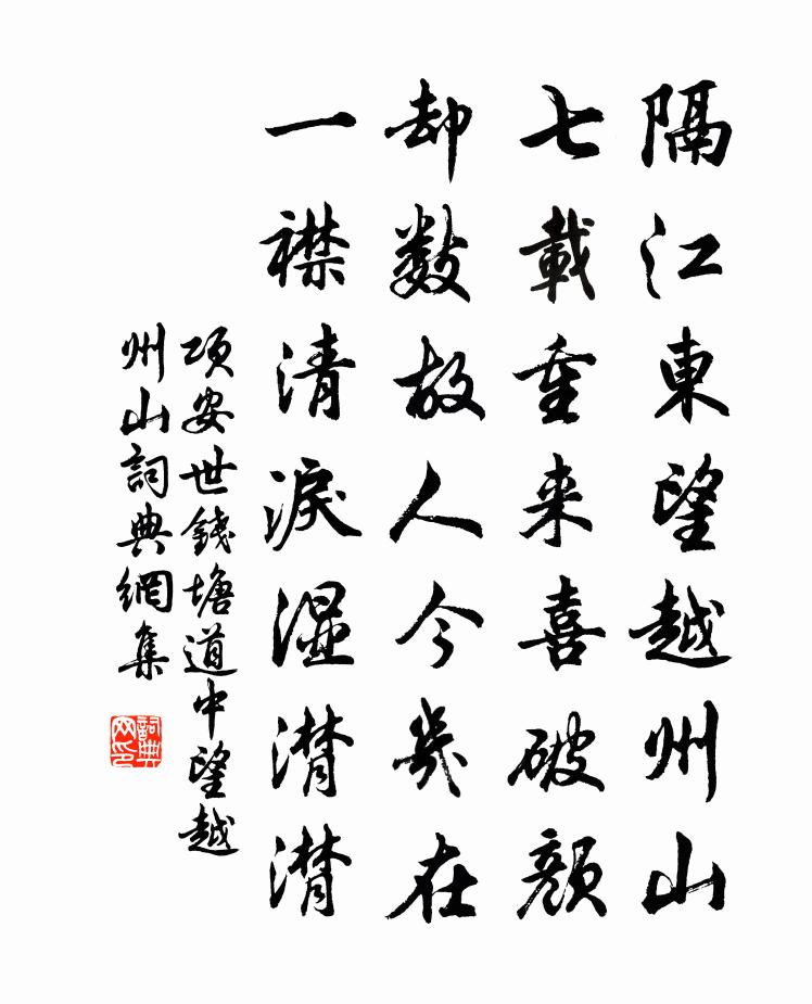 詩詞名句歷史字典書法欣賞書法字典國語詞典說文解字康熙字典古漢語字典標 題 作 者 詩 句 錢塘道中望越州山作者:項安世 朝代:宋代錢塘道中望越州山原文隔江東望越州山,七載重來喜破顏。卻數故人今幾在,一襟清淚濕潸潸。詩詞問答問:錢塘道中望越州山的作者是誰?答:項安世問:錢塘道中望越州山寫於哪個朝代?答:宋代項安世錢塘道中望越州山書法欣賞錢塘道中望越州山書法作品詩詞推薦喜夢得自馮翊歸洛兼呈令公白居易〔唐代〕上客新從左輔回,高陽興助洛陽才。已將四海聲名去,又占三春風景來。甲子等頭憐共老,文章敵手莫相猜。鄒枚次韻朱兵部上已錫宴陳襄〔宋代〕禊飲開天苑,英游綴士林。鹿苹常長養,魚藻遂浮沈。和氣春台暖,恩波曲水深。追隨方外樂,歌吹夢中音。忽起得寶歌佚名〔唐代〕得寶耶,弘農耶?弘農耶,得寶耶?清心鏡馬鈺〔元代〕頭如蓬,面如垢。萬事俱忘,心無塵垢。恣情慵、放肆婪耽,乞殘餘展手。幸知無,寧著有。無無亦無,神丹無漏跋鐘山賦二首周文璞〔宋代〕丁年寫了鐘山賦,舉向禪宮入定僧。僧卻為余言未好,扶行同謁晉諸陵。金剛隨機無盡頌無得無說分第七釋印肅〔宋代〕菩提無定法,一體常周匝。個裹了無言,圓成無縫塔。贈墨二首趙蕃〔宋代〕奚李風流遠,名家得自賢。粗能明款識,不暇別中邊。歲計一丸足,痴人連屋懸。此生能幾屐,茲士信超然。靈岩禪寺蔣允中〔宋代〕曉入靈岩寺,靈蹤一一穿。天聰鑿混沌,龍鼻滴潺湲。不雨山長濕,微風谷競喧。參旗開障日,鰲柱仰擎天。雁異曉登柏子岡回望金陵懷寄鍾山泉禪師賀鑄〔宋代〕晨征念王事,駑駕煩屢叱。既陟崔嵬高,稍辭叢薄密。烏牛沾宿露,白鳥明初日。清川舴艋遲,綠岸浮圖出。緬懷失題羅仲舒〔宋代〕世情落落疏,林樹森森密。乘興一登臨,峭然風景別。飛雲去不停,狂澗流無歇。巢許是何人,萬古豪稱傑。無俗念佚名〔宋代〕參玄齟齬,強鑽研道法,堅如鋼鐵。鳥噪猿啼談不二,切忌隨他分別。喝下明心,杖頭見性,此理固難說。疑團打雜詠一百首陶淵明劉克莊〔宋代〕卜築堪容膝,休官免折腰。寧書處士卒,不踐寄奴朝。上達奚舍人孟郊〔唐代〕北山少日月,草木苦風霜。貧士在重坎,食梅有酸腸。萬俗皆走圓,一身猶學方。常恐眾毀至,春葉成秋黃。大賢次同年王火井不遇之韻洪咨夔〔宋代〕題遍慈恩最上層,青雲塗轍幾人升。一經秋雨禾方穟,未到春風海亦冰。鬧裹功名多目論,淡中氣味獨心朋。蒼苔聞彥執熙仲有辣螺詩聊復有作張九成〔宋代〕乾坤中空繞滄溟,千奇百怪斗露形。鯨鯢黿鼉突相撐,蚶蜃蚌蛤角介獰。是中有物入眼生,羊腸蟻垤紛縱橫。入口寧宗朝享三十五首真宗〔宋代〕王假有廟,四極駿奔。鼎俎宵嚴,虛筷雲屯。積厚流廣,德隆慶蕃。是則是繩,保我子孫。江行夜泊劉滄〔唐代〕白浪連空極渺漫,孤舟此夜泊中灘。岳陽秋霽寺鐘遠,渡口月明漁火殘。綠綺韻高湘女怨,青葭色映水禽寒。鄉遙河傳·柳拖金縷孫光憲〔五代〕柳拖金縷,著煙濃霧,濛濛落絮。鳳皇舟上楚女,妙舞,雷喧波上鼓。龍爭虎戰分中土,人無主,桃葉江南渡。襞南歸題揚州竹西亭曾幾〔宋代〕往歲出蕪城,飄然一客星。又從江北路,重到竹西亭。楚岸寬圍碧,吳山遠借青。聖時還舊觀,歌吹月中聽。醉眠唐庚〔宋代〕山靜似太古,日長如小年。余花猶可醉,好鳥不妨眠。世味門常掩,時光簟已便。夢中頻得句,拈筆又忘筌。名句推薦雪虐風饕愈凜然,花中氣節最高堅。陸游《落梅》 君歌楊叛兒,妾勸新豐酒。李白《楊叛兒》 乃翁知國如知兵,塞垣草木識威名。黃庭堅《送范德孺知慶州》 風回小院庭蕪綠,柳眼春相續。李煜《虞美人·風回小院庭蕪綠》 千古江山,英雄無覓孫仲謀處辛棄疾《永遇樂·京口北固亭懷古》 永懷愁不寐,松月夜窗虛。孟浩然《歲暮歸南山 / 歸故園作 / 歸終南山》 一簞食,一瓢飲,在陋巷,人不堪其憂,回也不改其樂。賢哉,回也!孔子弟子《論語·雍也篇》 中軍置酒飲歸客,胡琴琵琶與羌笛。岑參《白雪歌送武判官歸京》 我與我周旋久,寧作我。劉義慶《世說新語·品藻》 浮雲柳絮無根蒂,天地闊遠隨飛揚。韓愈《聽穎師彈琴》