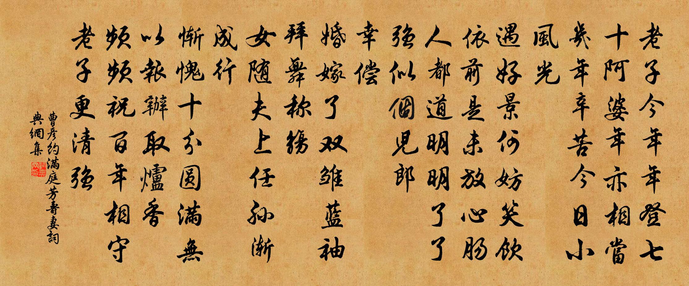 詩詞名句歷史字典書法欣賞書法字典國語詞典說文解字康熙字典古漢語字典標 題 作 者 詩 句 滿庭芳(壽妻)作者:曹彥約 朝代:宋代滿庭芳(壽妻)原文老子今年,年登七十,阿婆年亦相當。幾年辛苦,今日小風光。遇好景,何妨笑飲,依前是、未放心腸。人都道,明明了了,強似個兒郎。幸償。婚嫁了,雙雛藍袖,拜舞稱觴。女隨夫上任,孫漸成行。慚愧十分圓滿,無以報、辦取爐香。頻頻祝,百年相守,老子更清強。詩詞問答問:滿庭芳(壽妻)的作者是誰?答:曹彥約問:滿庭芳(壽妻)寫於哪個朝代?答:宋代問:滿庭芳(壽妻)是什麼體裁?答:詞曹彥約滿庭芳(壽妻)書法欣賞滿庭芳(壽妻)書法作品詩詞推薦言懷張蠙〔唐代〕十載聲沈覺自非,賤身元合衣荷衣。豈能得路陪先達,卻擬還家望少微。戰馬到秋長淚落,傷禽無夜不魂飛。平生九里嶺楊寅〔宋代〕上下各九里,東西只數家。田橫梯齒密,松列雁行斜。分鑣爭嶺道,孤往接天涯。為我謝風景,何路不開花。次韻李參政龍鶴山廬魏了翁〔宋代〕莫使兒輩覺,從渠青紫紛。馬前金罷亞,鳥外玉奫淪。題袁氏別業賀知章〔唐代〕主人不相識,偶坐為林泉。莫漫愁沽酒,囊中自有錢。和宋子京召還學士院晏殊〔宋代〕網索軒窗邃,鑾坡羽衛重。鷁舟還下瀨,星使出飛龍。賦待三英集,詞須五吏供。會看邊燧息,橫霈紫泥封。趙表之送梅並詩次韻四首張嵲〔宋代〕綠蓓繁時春欲暗,曉霜濃處信初來。今朝訊息南枝露,知是微陽九地回。楊柳枝五首·其二牛嶠〔五代〕吳王宮裡色偏深,一簇纖條萬縷金。不憤錢塘蘇小小,引郎松下結同心。游下岩崇封院程公許〔宋代〕鼓枻前春過下岩,空將目力寧雲端。而今真箇岩頭去,領取煙雲潑袂寒。崔司錄宅燕大理李卿高適〔唐代〕多雨殊未已,秋雲更沉沉。洛陽故人初解印,山東小吏來相尋。上卿才大名不朽,早朝至尊暮求友。豁達常推海內宗道者贊釋心月〔宋代〕一雙破草鞋,無跟又無耳。袈裟包不得,拄杖挑不起。只知赤腳下桐城,不免桐城人笑你。乙巳邵武建寧夜坐書呈諸公陳普〔宋代〕一合乾坤貯鬼神,入虛何敢謂無人。暗中射鮒誰知見,繞市青衣說與人。端居二首張耒〔宋代〕余寒羞老木,慘澹氣未平。平國富車馬,士女競新正。風埃息九陌,紈綺艷重城。燈稀夕煙車,斗轉夜寒生。倚楹次韻二首劉克莊〔宋代〕投老參陪杖屨間,頗容摘宋更薰班。端能面我九年壁,不惜分君一半山。絕喜庚桑來畏壘,懶為涑水續君灘。夷居六日雲重有雪意獨酌陸游〔宋代〕遍游藪澤一漁舠,盡歷風霜只縕袍。天為念貧偏與健,人因見嬾誤稱高。地連海澨濤聲近,雲冒山椒雪意豪。偶得春日叢桂書舍偶成二首王炎〔宋代〕芳草青青晝掩關,倦遊心緒嘆重山。寒生怪雨盲風后,春在斜陽暮靄間。杜宇勸人歸小隱,桃花笑我欲蒼顏。腐儒范達夫硯鄭剛中〔宋代〕范郎紫玉餘半圭,翻手作雲雨雹隨。龍蛇起陸孔翟飛,雲收雨霽千首詩。求鳳曲劉克莊〔宋代〕古有輕生士,今無起死醫。可憐茂陵渴,猶畫遠山眉。答友王令〔宋代〕客嘗疑西伯,何至羑里辱。瞽鰥雖父子,尚脫井廩酷。昏主雖聖臣,飛禍安可卜。致命遂其志,雖窮不為戮。倦學劉兼〔唐代〕樂廣亡來冰鏡稀,宓妃嫫母混妍媸。且於霧裡藏玄豹,休向窗中問碧雞。百氏典墳空自苦,一堆螢雪竟誰知。門前山居雜詩九十首曹勛〔宋代〕雲山環所臨,煙景日日異。山作故人接,云為久處計。酒酣一聲笛,梅風四山起。清香剩披拂,參橫伴村醉。名句推薦醉折殘梅一兩枝,不妨桃李自逢時。陸游《落梅》 清明時節雨聲嘩。潮擁渡頭沙。張炎《朝中措·清明時節》 春色滿園關不住,一枝紅杏出牆來。葉紹翁《遊園不值》 馬穿楊柳嘶,人倚鞦韆笑,探鶯花總教春醉倒。王磐《清江引·清明日出遊》 寢興目存形,遺音猶在耳。潘安《悼亡詩三首》 月既不解飲,影徒隨我身。李白《月下獨酌四首·其一》 雨雪自飛千嶂外,榆林只隔數峰西。朱彝尊《出居庸關》 朔方正月雪澌澌,單于策馬至京西沈約《昭君辭》 騁望因高雲外盡,鄉關回首愧煙蘿。石茂華《九月九日登長城關》 閒鷺棲常早,秋花落更遲。錢起《谷口書齋寄楊補闕》