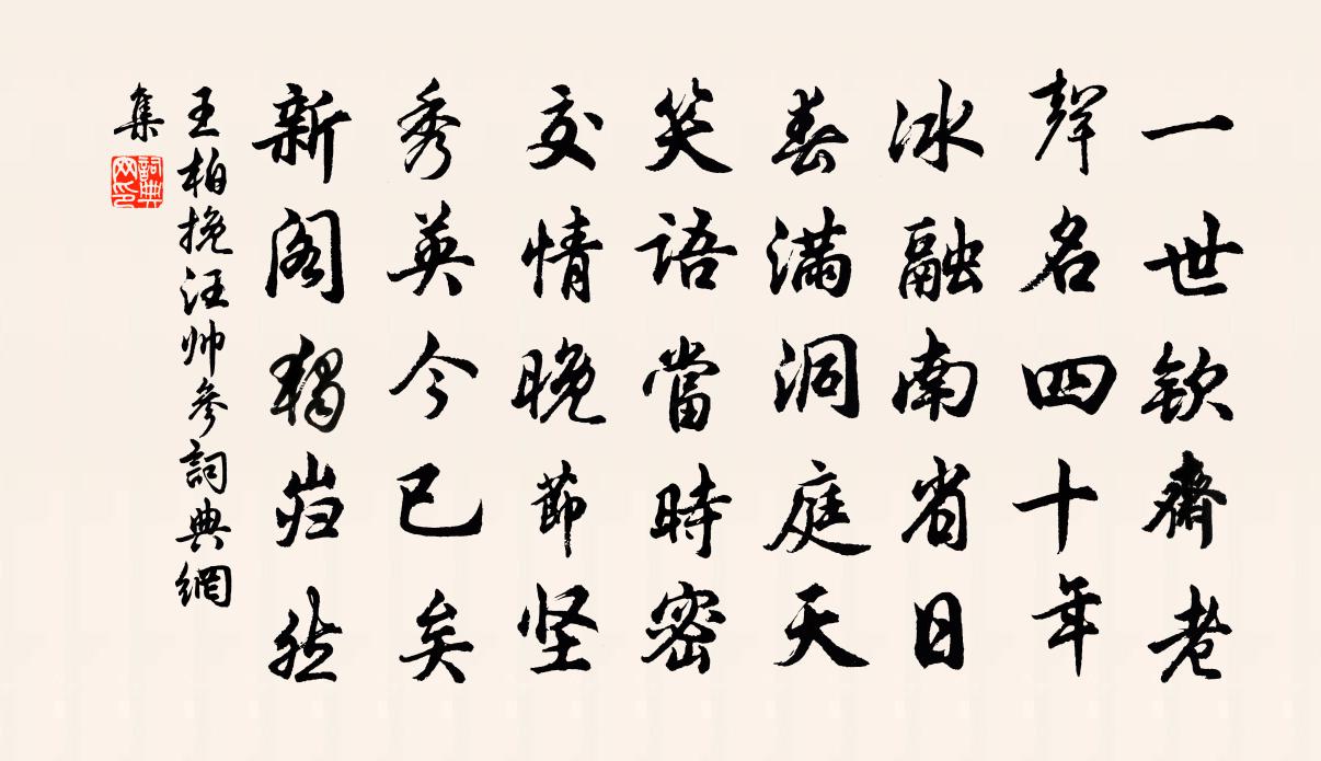 詩詞名句歷史字典書法欣賞書法字典國語詞典說文解字康熙字典古漢語字典標 題 作 者 詩 句 挽汪帥參作者:王柏 朝代:宋代挽汪帥參原文一世欽齋老,聲名四十年。冰融南省日,春滿洞庭天。笑語當時密,交情晚節堅。秀英今已矣,新閣獨巋然。詩詞問答問:挽汪帥參的作者是誰?答:王柏問:挽汪帥參寫於哪個朝代?答:宋代王柏挽汪帥參書法欣賞挽汪帥參書法作品詩詞推薦雁後歸(想娉婷·三之二)賀鑄〔宋代〕鴉背夕陽山映斷,綠楊風掃津亭。月生河影帶疏星。青松巢白鳥,深竹逗流螢。隔水彩舟然絳蠟,碧窗想見娉婷。和韻簡天則上人朱希晦〔元代〕涼風裊裊晚秋天,潮落雙門纜客船。九陌黃塵蓬鬢底,一籬香露菊花邊。故鄉鱸鱠牽歸思,近砌蛩聲攪夜眠。不道句楊徽之〔唐代〕新霜染楓葉,皎月借蘆花。廢宅寒塘水,荒墳宿草煙。浣溪沙 上巳洪翼〔元代〕軟翠冠兒簇海棠。砑羅衫子繡丁香。閒來芳徑踏青陽。風暖有人能作伴,日長無事可思量。水流花落任匆忙。自和李曾伯〔宋代〕 * 頭著此亭,東皇幻化一何神。相將蓮炬催芳夕,來俾梅花作好春。自臘月前尤可喜,覺西風外已無塵。銜枚再游鳳凰山寺程公許〔宋代〕人生出處豈前謀,歲一星周再此游。世故鼎來憂似海,壯心空在鬢先秋。戎車擁路抽身去,僧缽分香勸我留。擾擾謁金門(用趙帳乾韻)程珌〔宋代〕煙漠漠。醉里看春都錯。過了清明遲一著。牡丹重約摸。曉日漸明檐角。天與芳辰難卻。駐得韶華元有藥。桃源誰平陽民杜裕民因買薪得紫石於薪中石有黝理自李復〔宋代〕至心不可求,虛明曠無跡。應物乃現形,遺影留茲石。若以色見我,洋海塵三尺。諸像皆非相,於茲何所得。英宗皇帝輓詞五首朱長文〔唐代〕鳳翣行將遠,龍髯斷莫尋。白雲留穆御,黃屋豈堯心。雖享天齡淺,終成睿算深。垂鴻須萬祀,累葉奉姜任。皇帝上平上皇帝壽樂曲再舉酒用大椿之曲崔敦詩〔宋代〕培植自古,質淳以全。凌傲霜雹,盤薄風煙。朝菌焉識,楚蓂詎肩。聳柯擢乾,終古蒼然。幽事絕句陸游〔宋代〕新傳服氣訣,舊喜步虛吟。兒女不難棄,雲山何處深?禪師塔次韻劉曈〔宋代〕皓月孤懸處,知師幾駐筇。鐵鞋雖踏破,只履覓無從。傳法燈燈火,聞經處處龍。可憐狂醉客,夜坐謾搥鍾。頌古十六首釋道寧〔宋代〕火號更深喝道來,普門關棙一時開。圓通大師呵呵笑,不是峨嵋與五台。挽任諫議詞二首韓元吉〔宋代〕凜凜諍臣節,恂恂循吏名。世嗟陽諫議。人憶謝宣城。優詔才三接,嘉言未一行。清霜數行淚,豈為故人傾。張太素之邠幕梅堯臣〔宋代〕應幕酒向豳郊,酒晨裝辭郟酒鄏。長亭酒欲少留,飛鵠初成曲。魯酒上離顏,行塵生驥足。悠悠關戍遙,黤黤煙雲清心鏡 贈韋先生 拆韋字起馬鈺〔元代〕公清,火戲虛。寂寂虎隨憩。蓮綻、勝似群花,緣行周濟。悟回頭,真自喜。訣無為清淨,自然通秘。自得、休別簡夫北墅鄭獬〔宋代〕先生已到舍,稚子未歸樵。草晚牛羊病,場登雀鼠驕。孔顏雖困魯,夔契未忘堯。自笑非逋客,煩君重見招。句李若水〔宋代〕東風無跡秀芳草,野鳥不言銜落花。天津感事二十六首邵雍〔宋代〕雲無一縷乾明月,橋有千尋臥淥波。料得人間無此景,中秋對月興如何。洞仙歌(重九藥市)京鏜〔宋代〕三年錦里,見重陽藥市。車馬喧闐管弦沸。笑籬邊孤寂,台上疏狂,爭得似,此日西南都會。痴兒官事了,樂與民名句推薦雪中何以贈君別,惟有青青松樹枝。岑參《天山雪歌送蕭治歸京》 冬宜密雪,有碎玉聲。王禹偁《黃岡竹樓記》 守身不敢妄為,恐貽羞於父母王永彬《圍爐夜話·第三四則》 靡不有初,鮮克有終。佚名《盪》 思歸若汾水,無日不悠悠。李白《太原早秋》 竹外一枝斜,想佳人,天寒日暮。曹組《驀山溪·梅》 映階碧草自春色,隔葉黃鸝空好音。杜甫《蜀相》 跬步而不休,跛鱉千里;累土而不輟,丘山崇成。荀子《荀子·修身》 春未老,風細柳斜斜。蘇軾《望江南·超然台作》 務本節用財無極。荀子《荀子·成相》
