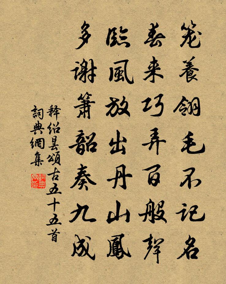 詩詞名句歷史字典書法欣賞書法字典國語詞典說文解字康熙字典古漢語字典標 題 作 者 詩 句 頌古五十五首作者:釋紹曇 朝代:宋代頌古五十五首原文籠養翎毛不記名,春來巧弄百般聲。臨風放出丹山鳳,多謝簫韶奏九成。詩詞問答問:頌古五十五首的作者是誰?答:釋紹曇問:頌古五十五首寫於哪個朝代?答:宋代釋紹曇頌古五十五首書法欣賞頌古五十五首書法作品詩詞推薦望夫山梅堯臣〔宋代〕亭亭千古質,曾是念征夫。一作山頭石,畏看天際途。猶如托蘿蔓,不似采蘼蕪。時有江雲近,僊衣掛六銖。題禹廟二首張鎡〔宋代〕為人心切屢忘家,力量方知有等差。莫信空山葬冠劍,且吟古屋畫龍蛇。句潘牥〔宋代〕竹才生便直,梅到死猶香。同兒曹賦蘆花吳激〔金代〕天接蒼蒼渚,江涵裊裊花。秋聲風似雨,夜色月如沙。澤國幾千里,漁村三兩家。翻思杏園路,鞭裊帽檐斜。偈頌七十六首釋師觀〔宋代〕動弦別曲,葉落知秋。風生大野,水向東流。次韻答學者四首陳師道〔宋代〕暗中摸索不難佑,眼裡輪囷郤見稀。行地徑須先八駿,刺天終不羨群飛。十二月中旬書戴溪亭王銍〔宋代〕天上東風轉斗星,天涯羇客尚飄萍。道塗況復經殘歲,風雪那堪宿旅亭。春到怯添雙鬢白,夜寒愁對一燈青。殘年頌古四首釋鼎需〔宋代〕入息未嘗居陰界,出息何曾涉萬緣。一聲漁笛離南浦,依舊蘆花深處眠。贈張繪秘教九題詩魔林逋〔宋代〕花露濕晴春,秋燈落燼頻。祇緣吟有味,不覺坐勞神。寄遠情無極,搜奇事轉新。此魔降不到,珍重五天人。偈頌一百六十首釋宗杲〔宋代〕善法堂前瑞氣新,天書來自九重城。唯憑一句無私語,上祝吾皇億萬春。櫂歌九章寄彭鶴林白玉蟾〔宋代〕岸上酒旗舞,寒蕪生秋風。誰家六七童,手持金芙蓉。送開封盧少府韋應物〔唐代〕雄藩車馬地,作尉有光輝。滿席賓常侍,闐街燭夜歸。關河征旆遠,煙樹夕陽微。到處無留滯,梁園花欲稀。野望梅堯臣〔宋代〕新晴宜野望,最愛是山前。遠近花兼竹,高低水拍田。呼名鳥無數,問姓客多年。此地春耕晚,吳牛樹底眠。金縷歌 壽胡澗泉憲僉二月七日程文海〔元代〕八桂歸來後,又十年、泉紅澗碧,蟠桃春曉。老子精神真滿腹,合借福星當道。怎長寄、東皋舒嘯。是則顛崖人渴嘉泰開樂日殿岩涇原郭季端邀游鳳山自來美堂劉過〔宋代〕結束戰袍騎戰馬,冠軍將軍宛如畫。前呵小駐來美堂,箭去弓鳴飛鳥下。青林路轉入岧嶢,湖亭海觀爭為高。誰知次韻師厚答馬著作屢贈詩黃庭堅〔宋代〕嘗聞馬南郡,少有拔俗韻。寒灰幾見溺,鎩翮常思奮。桐薪鳴灶間,劍氣吐吳分。多言世益嗤,當律心自隱。家雖凝祥三首張耒〔宋代〕已隨芳草藉杯盤,更任垂楊拂馬鞍。斜日兩竿眠犢晚,春波一眼去鳧寒。金陵雜興二百首蘇泂〔宋代〕綠陰黃鳥半山園,謝字王名宛若存。試問時人兩安石,卻推翁仲不能言。宿漁浦陸游〔宋代〕東歸剡曲只三程,旅泊還如萬里行。燈影動搖風不定,船聲鼞鞳浪初生。曳裾非復白頭事,瞑目那求青史名。歸去偈頌一百三十六首釋惟一〔宋代〕心不是佛,智不是道。拋卻深村,又入荒草。只如以一重,不知轉交涉轉料掉。名句推薦敗垣芳草,空廊落葉,深砌蒼苔。徐再思《人月圓·甘露懷古》 故山知好在,孤客自悲涼。蘇軾《臨江仙·送王緘》 安上在於悅下,為己存乎利人。房玄齡《晉書·列傳·第二十四章》 此馬非凡馬,房星本是星。李賀《馬詩二十三首·其四》 沅水通波接武岡,送君不覺有離傷。王昌齡《送柴侍御》 書中自有黃金屋,書中自有顏如玉趙恆《勸學詩》 花紅易衰似郎意,水流無限似儂愁。劉禹錫《竹枝詞·山桃紅花滿上頭》 身似浮雲,心如飛絮,氣若遊絲。徐再思《折桂令·春情》 疏籬曲徑田家小。雲樹開清曉。周邦彥《虞美人·疏籬曲徑田家小》 高或入於虛,華或入於浮,而虛浮之士,究難指為高華。王永彬《圍爐夜話·第一一O則》