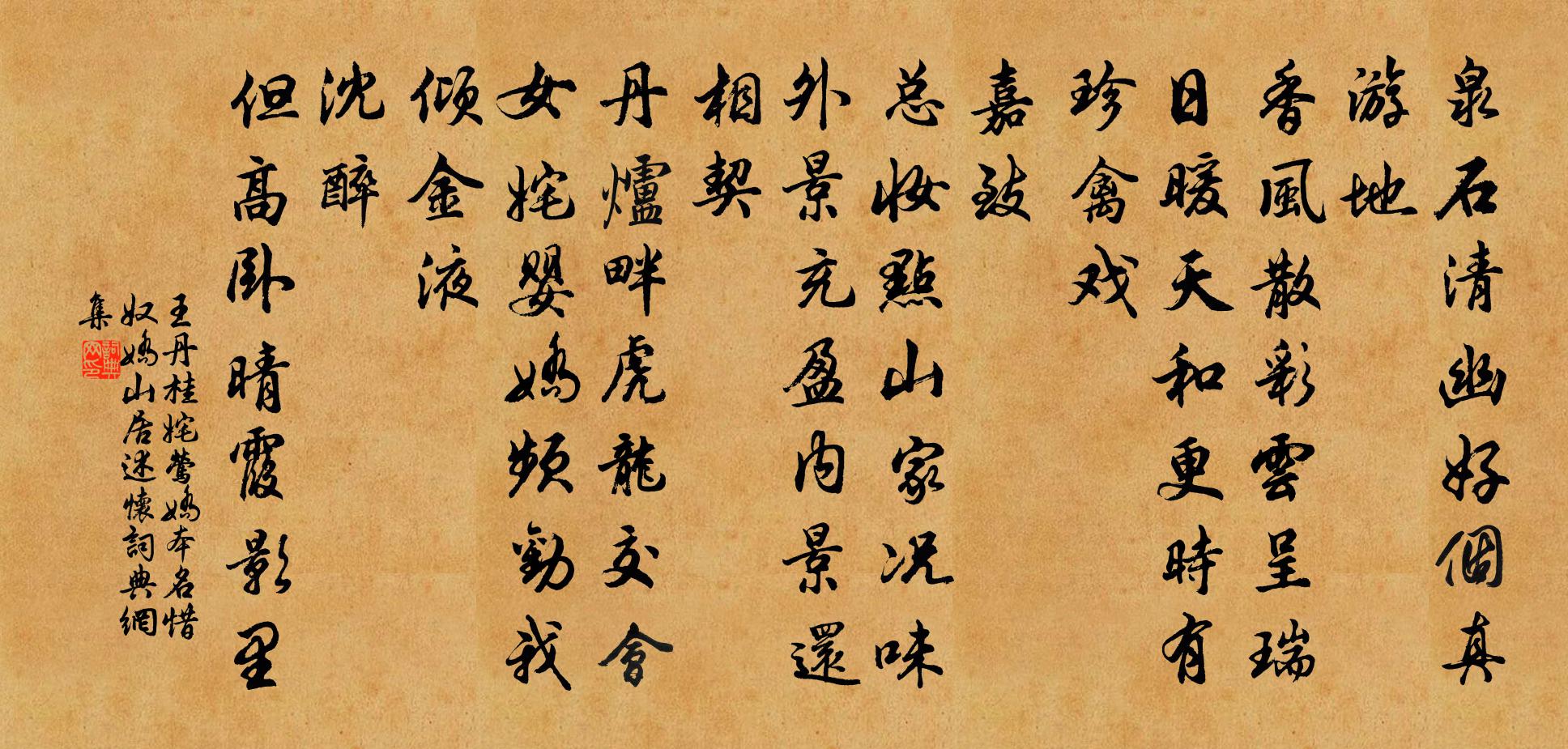 詩詞名句歷史字典書法欣賞書法字典國語詞典說文解字康熙字典古漢語字典標 題 作 者 詩 句 奼鶯嬌 本名惜奴嬌 山居述懷作者:王丹桂 朝代:元代原文泉石清幽,好個真游地。香風散、彩雲呈瑞。日暖天和,更時有珍禽戲。嘉致。總妝點、山家況味。外景充盈,內景還相契。丹爐畔、虎龍交會。女奼嬰嬌,頻勸我、傾金液。沈醉。但高臥、晴霞影里。詩詞問答問:《奼鶯嬌 本名惜奴嬌 山居述懷》的作者是誰?答:王丹桂問:該詩寫於哪個朝代?答:元代問:該詩是什麼體裁?答:詞書法欣賞奼鶯嬌 本名惜奴嬌 山居述懷書法作品詩詞推薦倉使和詩出奇不窮再次韻四首劉克莊〔宋代〕公似長松特秀冬,青藁安敢與松同。高於岱頂誰曾覽,遠若河源未易窮。歷塊豈無追電駿,步虛疑有架天虹。吾詩鎖宿余半月得讀書喜而有賦程公許〔宋代〕日月疾跳丸,簡篇浩煙海。弓旌誤誘去,歡息可中悔。絕句二首蘇軾〔宋代〕峨峨疊石立何孤,賴有蕭蕭翠竹俱。日暮無人鷗鳥散,空留野水伴寒蘆。酬南園新亭宴會璩新第慰慶之作,時任賓客權德輿〔唐代〕南宮煙景濃,平視中南峰。官閒似休沐,盡室來相從。日抱漢陰瓮,或成蝴蝶夢。樹老欲連雲,竹深疑入洞。歡言閨怨姜特立〔宋代〕別恨迢迢千里余,天涯何處覓音書。花間羞見雙雙蝶,水上愁尋六六魚。贈兵部尚書魯肅簡公輓詞三首宋庠〔宋代〕應運推邦直,乘時講化源。不冠嘗可奏,問樹本無言。亮節裨初載,清風裕後昆。忽嗟梁木壞,褒冊賁忠魂。酬信仲見和二首胡寅〔宋代〕不作悲秋賦,猶牽夢雨情。人心空懇迫,天聽自昭明。驟豈風能靡,和非雹與並。霤懸廬阜瀑,山映羽林兵。已灑泛舟呈元制照老李流謙〔宋代〕扁舟載我去,身世兩悠然。暝靄無窮樹,春江不盡天。阮嵇真酒伴,李郭即神仙。孤唱君須和,風流漢晉前。試院書事呈同僚諸公孔武仲〔宋代〕九衢奔走厭紅塵,官舍連朝得閉門。瑩靜軒窗移白日,青熒燈火送黃昏。披衣已愛星辰爛,奉御方瞻斗極尊。早晚水龍吟(賦酴醿)盧祖皋〔宋代〕盪紅流水無聲,暮煙細草黏天遠。低回倦蝶,往來忙燕,芳期頓懶。綠霧迷牆,翠虬騰架,雪明香暖。笑依依欲挽瑞鶴仙元好問〔金代〕四山秋氣爽。正雲淡、銀河露零仙掌。輕煙瑞屏嶂。有文星一點,□從天上。襟懷倜儻。笑談間、光焰萬丈。向玉郊廟歌辭。享太廟樂章。歆和佚名〔唐代〕崇禋已備,粢盛聿修。潔誠斯展,鍾石方遒。奉和聖制暇日與兄弟同遊興慶宮作應制張說〔唐代〕漢武橫汾日,周王宴鎬年。何如造區夏,復此睦親賢。巢鳳新成閣,飛龍舊躍泉。棣華歌尚在,桐葉戲仍傳。禁籞寄雲泉僧永頤周弼〔宋代〕頌罷南華誰得聞,兩川寒玉一禪身。松邊彈舌低聲念,莫引龍來變作人。又次韻二首周必大〔宋代〕川流元滾滾,客至喜津津。卜築新形勢,逢迎舊主人。酒杯容我醉,詩句味君醇。大隱聊城市,岩耕笑子真。龍池春草李洞〔唐代〕龍池清禁里,芳草傍池春。旋長方遮岸,全生不染塵。和風輕動色,湛露靜流津。淺得承天步,深疑繞御輪。魚尋十月二十六日夜夢行南鄭道中既覺恍然攬筆作陸游〔宋代〕孤雲兩角不可行,望雲九井不可渡。嶓冢之山高插天,漢水滔滔日東去。高皇試劍石為分,草沒苔封猶故處。將壇次韻夏日陳師道〔宋代〕江上雙峰一草堂,門閒心靜自清涼。詩書發冢功名薄,麋鹿同群歲月長。句里江山隨指顧,舌端幽眇致張皇。莫欺九日宜春道中趙蕃〔宋代〕勿雲秋意漫生悲,可欠重陽一首詩。瘦馬嘶風紅葉樹,村簾沽酒菊花枝。壺觴徵逐紛皆是,人物風流眇莫追。獨立送王龜齡得請還鄉吳芾〔宋代〕和氣融融動白苹,歡傳千里政方新。若為擺落游珍館,不顧悲啼擁畫輪。鯨海無津堪縱目,雁山如舊足怡神。願言名句推薦見出以知入,觀往以知來列子及其弟子《列子·說符》 已駕七香車,心心待曉霞。李商隱《壬申七夕》 暗塵隨馬去,明月逐人來。蘇味道《正月十五夜》 矜偽不長,蓋虛不久。韓非及後人《韓非子·難一》 太乙近天都,連山接海隅王維《終南山》 博學之,審問之,慎思之,明辨之,篤行之。子思《中庸·第二十章》 君看獲稻時,粒粒脂膏香。黃燮清《秋日田家雜詠》 與肩挑貿易,毋占便宜;見貧苦親鄰,須加溫恤。朱柏廬《朱子家訓·全文》 釣罷歸來不繫船,江村月落正堪眠。司空曙《江村即事》 行有不得者,皆反求諸己,其身正而天下歸之。孟子《孟子·離婁章句上·第四節》