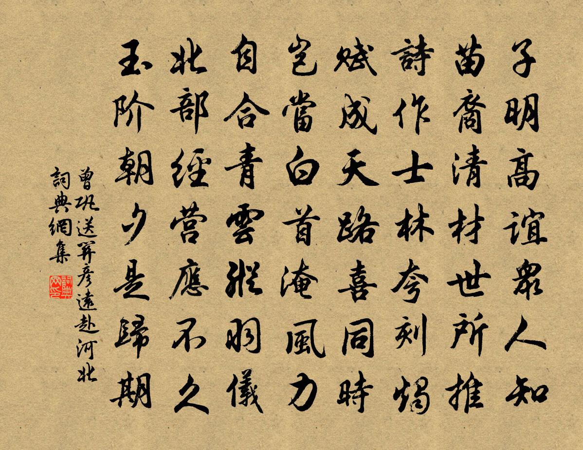 詩詞名句歷史字典書法欣賞書法字典國語詞典說文解字康熙字典古漢語字典標 題 作 者 詩 句 送關彥遠赴河北作者:曾鞏 朝代:宋代送關彥遠赴河北原文子明高誼眾人知,苗裔清材世所推。詩作士林夸刻燭,賦成天路喜同時。豈當白首淹風力,自合青雲縱羽儀。北部經營應不久,玉階朝夕是歸期。詩詞問答問:送關彥遠赴河北的作者是誰?答:曾鞏問:送關彥遠赴河北寫於哪個朝代?答:宋代曾鞏送關彥遠赴河北書法欣賞送關彥遠赴河北書法作品詩詞推薦玉漏遲劉子寰〔宋代〕暮天初過。雨淒清,頓覺今年秋早。夜景虛明,仿佛露華清曉。蕙草繁花競吐,向暗裡、幽香縹緲。酬常丞見和虞儔〔宋代〕周南留滯玉堂仙,千騎那教下蜀川。樑上幾看明月夜,江東空想暮雲天。五年契闊音書斷,萬里歸來語笑鮮。喜有乘舟阻風張嵲〔宋代〕澤國天低星斗澤,疾風吹波作山立。岸頭草木皆震動,雞犬鳴吠紛相及。通宵萬竅無停聲,平明更作春濤驚。青天積雨小霽,暮立卷書亭前二首楊萬里〔宋代〕報晴底用暮寒為,薄薄春衫橫見欺。似有如無風細甚,柳絲無賴恰先知。歲晚陸游〔宋代〕小岫嶙峋炷寶熏,卷書閒對一窗雲。雁聲忽向天邊過,起立中庭看斷群。洪氏浴室院陸楠〔宋代〕我聞色相本來空,人鏡須知在箇中。已把太虛為丈室,卻將明月照心宮。浮雲翳掃三更後,素彩光流萬里同。休詫還丹可成詩聯句皎然〔唐代〕羽化自仙骨,延年資養生。 ——皎然金經啟靈秘,玉液流至精。 ——潘述八石思共煉,九丹知可成。 ——湯築城謠方回〔宋代〕從軍去築城,不如困長征。從軍去掘暫,不如鏖血戰。古今征戰立奇功,貂蟬多出兜鍪中。徒教力盡鍤與杵,主將感遇之廿九陳子昂〔唐代〕丁亥歲雲暮。西山事甲兵。贏糧匝邛道。荷戟爭羌城。嚴冬陰風勁。窮岫泄雲生。昏噎無晝夜。羽檄復相驚。拳跼贈筆工趙蕃〔宋代〕食肉既無相,良工徒苦心。吁嗟君類我,何處覓知音。四用韻十首楊公遠〔宋代〕小醉初醒後,沖寒作興游。宿雲山頂散,殘雪樹根留。檐溜懸冰柱,風威凍玉樓。欲吟吟未穩,歸擁地爐休。草具屈邦衡侍郎蒙賦即事新詩次韻皆敘坐上語周必大〔宋代〕舊第閒梅塢,新知泥柳橋。情先春色動,節後歲寒凋。久矣承三接,宜然冠百僚。不須驚鶴髮,未礙插蟬貂。風入松周紫芝〔宋代〕禁菸過後落花天。無奈輕寒。東風不管春歸去,共殘紅、飛上鞦韆。看盡天涯芳草,春愁堆在闌乾。楚江橫斷夕陽偶題陳造〔宋代〕霧紅煙白忽橫陳,雨後風光聖得新。說似遊人須著便,陰寒已破一分春。人月圓·甘露懷古徐再思〔元代〕江皋樓觀前朝寺,秋色入秦淮。敗垣芳草,空廊落葉,深砌蒼苔。遠人南去,夕陽西下,江水東來。木蘭花在,山平山堂寄歐陽公王令〔宋代〕廢苑繁華未可尋,孤城西北路嶔崟。檐邊月過峰巒頂,柱下雲回草樹陰。賓客日隨千騎樂,管弦風入萬家深。知公游北苑寺似主僧漢仲章陳著〔宋代〕隨人入寶坊,一坐到斜陽。僧老話多古,春來山自香。放吟聊走筆,乘興不論觴。今日是何日,悠然何有鄉。禪人並化主寫真求贊釋正覺〔宋代〕識得本真,不隨生滅。霽雲磨空,秋波濯月。寄題李舍人蒲中新齋司馬光〔宋代〕隴上家聲勇氣殊,邊亭臥鼓欲安居。非同王翦私求宅,更似甘寧晚好書。劍倚寒窗風淅瀝,門無雜客柳蕭疏。蒲州春怨王令〔宋代〕掃地待花落,惜花輕眷塵。遊人空眷戀,踏去卻尋春。名句推薦酹酒蒼茫,倚歌平遠,亭上玉虹腰冷。吳文英《十二郎·垂虹橋》 情人怨遙夜,竟夕起相思。張九齡《望月懷遠》 愛臣太親,必危其身;人臣太貴,必易主位。韓非及後人《韓非子·愛臣》 無端聽畫角,枕畔紅冰薄。納蘭性德《菩薩蠻·朔風吹散三更雪》 最愛湖東行不足,綠楊陰裏白沙堤。白居易《錢塘湖春行》 一切都是命,半點不由人。佚名《增廣賢文·上集》 鳳簫聲動,玉壺光轉,一夜魚龍舞。辛棄疾《青玉案·元夕》 其交也以道,其接也以禮孟子《孟子·萬章章句下·第四節》 夜聞歸雁生鄉思,病入新年感物華。歐陽修《戲答元珍》 功被天下,守之以讓。荀子《荀子·宥坐》