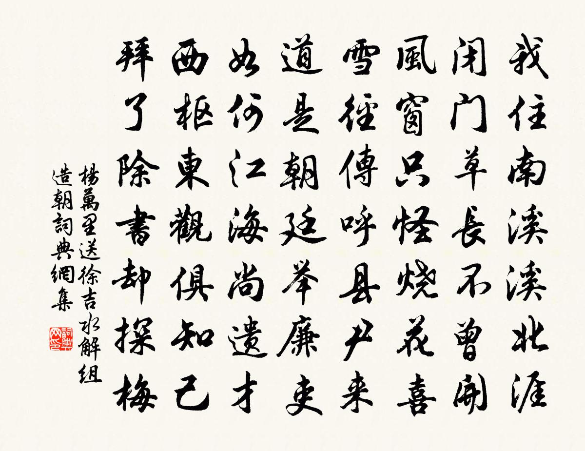 詩詞名句歷史字典書法欣賞書法字典國語詞典說文解字康熙字典古漢語字典標 題 作 者 詩 句 送徐吉水解組造朝作者:楊萬里 朝代:宋代送徐吉水解組造朝原文我住南溪溪北涯,閉門草長不曾開。風窗只怪燒花喜,雪徑傳呼縣尹來。道是朝廷舉廉吏,如何江海尚遺才?西樞東觀俱知己,拜了除書卻探梅。詩詞問答問:送徐吉水解組造朝的作者是誰?答:楊萬里問:送徐吉水解組造朝寫於哪個朝代?答:宋代問:楊萬里的名句有哪些?答:楊萬里名句大全楊萬里送徐吉水解組造朝書法欣賞送徐吉水解組造朝書法作品詩詞推薦春遊釋行海〔宋代〕芳菲時節思悠悠,快與風光汗漫遊。萬物不如花富貴,一春唯有蝶風流。仙曾許我黃金骨,天下饒君白雪頭。隨處晚日程公許〔宋代〕西崦落照暈金鉦,斂退痴雲作嫩晴。忽忽暝煙行十里,前頭燈火是鵑城。偈頌八十五首釋妙倫〔宋代〕來住瑞峰,去住瑞岩。未操雪曲,且打鄉談,天上人間一十三。嚴陵待鎖方岳〔宋代〕關卻疏篷只恁休,莫留霜月孤伴舟。津亭萬一商分數,鎖到明朝何處求。賀新郎 題西湖官驛水閣 松江府志卷十九,注佚名〔宋代〕倩來管鸞傳語。管問陸家兄管弟翩翩,今歸何處。留下管藏萬壑,時作雲煙吞吐。謾徙倚、朱蘭凝佇。蘭外瑁湖誰雜詠一百首漆室女劉克莊〔宋代〕舉國聽桓子,呼天誄孔丘。可憐倚楹女,徒為魯君憂。好事近·湓口放船歸陸游〔宋代〕湓口放船歸,薄暮散花洲宿。兩岸白苹紅蓼,映一蓑新綠。有沽酒處便為家,菱芡四時足。明日又乘風去,任江南漁父詞宋高宗〔宋代〕春入渭陽花氣多,春歸時節自清和。沖曉霧,弄滄波,載與俱歸又若何。喜雪徐凝〔唐代〕長愛謝家能詠雪,今朝見雪亦狂歌。楊花道即偷人句,不那楊花似雪何。禪人並化主寫真求贊釋正覺〔宋代〕慧而能定,定而能應。空有短長,初無欠剩。定慧力莊嚴,性相心齊證。妙觀察智照非功,成所作智同圓鏡。有懷參政范公因書桂隱近事奉寄二首張鎡〔宋代〕迂隣尋阿作治中,閒事歸來卻不慵。曉炷佛香聊作觀,晚投社飽亦稱儂。荷花制就身宜著,菰米收成手自舂。最是偶觀竹林七賢畫像宋庠〔宋代〕七子高風拂混茫,丹青遺影尚琳琅。山王偶爾兼榮遇,不得延年贈短章。封丘縣高適〔唐代〕我本漁樵孟諸野,一生自是悠悠者。乍可狂歌草澤中,寧堪作吏風塵下。只言小邑無所為,公門百事皆有期。拜迎和王介甫寄安豐知縣修芍陂陳舜俞〔宋代〕雩婁陂水舊風煙,可喜斯民得繼傳。萬頃稻粱追漢日,五門疏鑿似齊年。才高欲獻營田策,公暇還來泛酒船。稱與謝李元德郎中餉家釀二首楊萬里〔宋代〕長史銜杯太白醺,詼詞笑殺古來人。至今太白一船酒,不飲還將飲子云。頌古五十五首釋紹曇〔宋代〕霜拂金鞍玉墜腰,雞聲催入紫宸朝。何如雲壑飽清夢,殘月半窗松影搖。達生劉克莊〔宋代〕無二客穿冢殉,有一奴荷鍤從。勿煩作者諛墓,莫管鄰人相舂。郊墅鄭谷〔唐代〕韋曲樊川雨半晴,竹莊花院遍題名。畫成煙景垂楊色,滴破春愁壓酒聲。滿野紅塵誰得路,連天紫閣獨關情。渼陂夏日閒居作四聲詩寄襲美平入聲陸龜蒙〔唐代〕端居愁無涯,一夕發欲白。因為鸞章吟,忽憶鶴骨客。手披丹台文,腳著赤玉舄。如蒙清音酬,若渴吸月液。減字木蘭花程垓〔宋代〕雙雙相併。一點紅邊偏照映。玉翦雲裁。不比浮花共蒂開。幾回心曲。選勝摘來情自足。插向雲鬟。要與仙郎比並名句推薦帝鄉三千里,杳在碧雲間。李白《登敬亭北二小山余時送客逢崔侍御並登此地》 去年東武今夕,明月不勝愁。蘇轍《水調歌頭·徐州中秋》 少年射虎名豪,等閒赤羽千夫膳元好問《水龍吟·從商帥國器獵於南陽同仲澤鼎玉賦此》 尚想舊情憐婢僕,也曾因夢送錢財。元稹《遣悲懷三首·其二》 民力盡於無用,財寶虛於待客。墨子《墨子·05章 七患》 笑別廬山遠,何煩過虎溪。李白《別東林寺僧》 老柘葉黃如嫩樹,寒櫻枝白是狂花。白居易《早冬》 用舍由時,行藏在我,袖手何妨閒處看。蘇軾《沁園春·孤館燈青》 但使情親千里近,須信。無情對面是山河。辛棄疾《定風波·席上送范廓之游建康》 夜雨滴空階,孤館夢回,情緒蕭索。柳永《尾犯·夜雨滴空階》