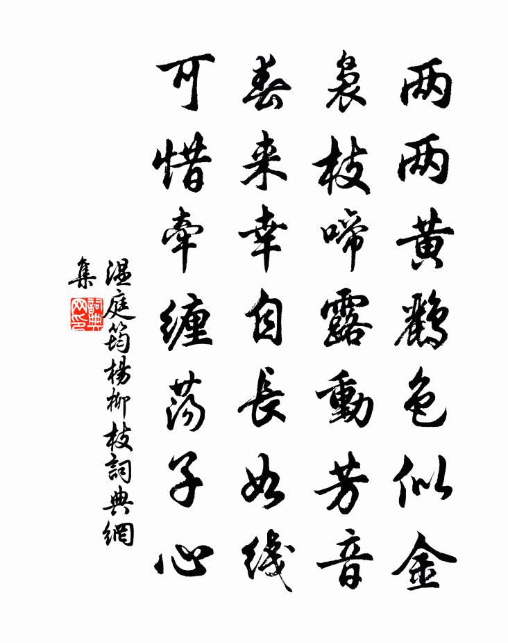 兩兩黃鸝色似金,裊枝啼露動芳音。春來幸自長如線,可惜牽纏盪子心。