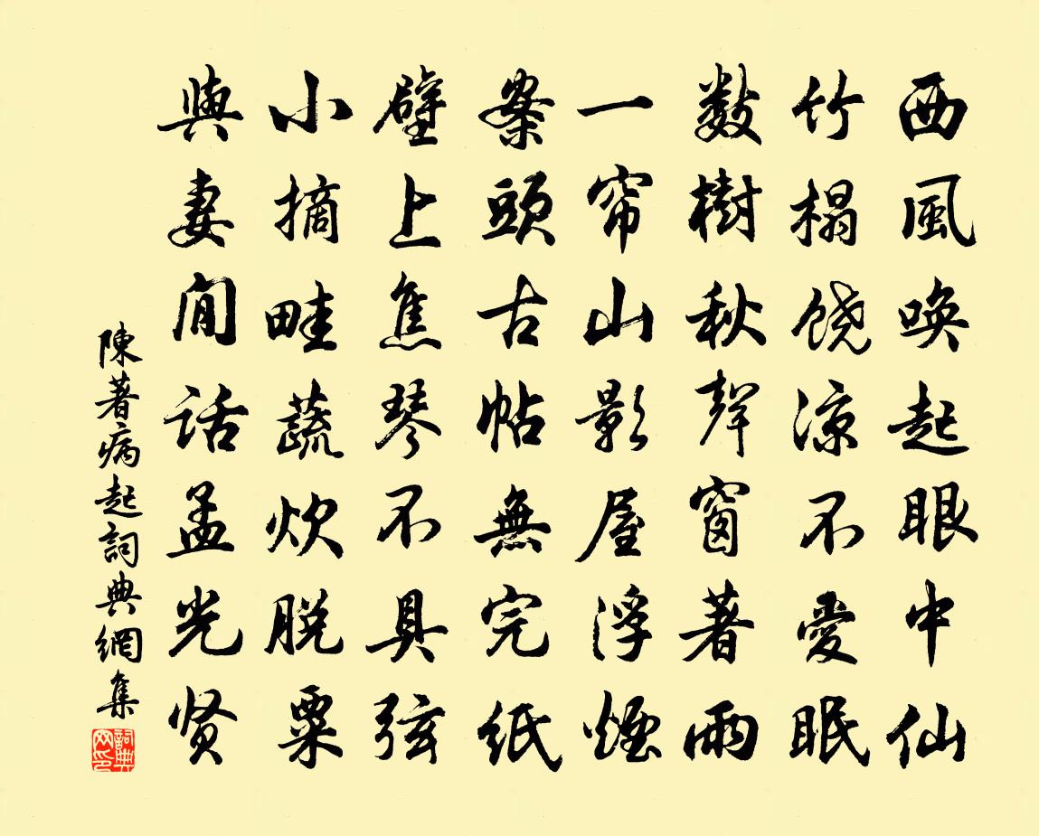 詩詞名句歷史字典書法欣賞書法字典國語詞典說文解字康熙字典古漢語字典標 題 作 者 詩 句 病起作者:陳著 朝代:宋代病起原文西風喚起眼中仙,竹榻饒涼不愛眠。數樹秋聲窗著雨,一簾山影屋浮煙。案頭古帖無完紙,壁上焦琴不具弦。小摘畦蔬炊脫粟,與妻閒話孟光賢。詩詞問答問:病起的作者是誰?答:陳著問:病起寫於哪個朝代?答:宋代陳著病起書法欣賞病起書法作品詩詞推薦送鍾德林郎中學士赴東府詩。得酒徐鉉〔唐代〕酌此杯中物,茱萸滿把秋。今朝將送別,他日是忘憂。世亂方多事,年加易得愁。政成頻一醉,亦未減風流。朝二首杜甫〔唐代〕清旭楚宮南,霜空萬嶺含。野人時獨往,雲木曉相參。俊鶻無聲過,飢烏下食貪。病身終不動,搖落任江潭。浦帆翠光岩鄭得彝〔宋代〕一棹巨川舟,相隨物外游。芳塵曾未逐,春興若為酬。酌石花陰濕,題岩蘚墨浮。沙鷗應笑我,留住瀫溪頭。晨起眺望張耒〔宋代〕眾木交陰園徑荒,獨尋細徑上東岡。山頭秀插垂雲處,江面平分浴日光。沙際離離橫水鳥,林端歷歷過風檣。登臨題江心寺蒲壽宬〔宋代〕聞說東甌勝,茲游心頗降。江心浮一寺,水面立雙幢。路絕帆當戶,潮回月漾窗。悠悠懷古思,把酒酹漁釭。十月旦日至近村陸游〔宋代〕鴨腳葉黃烏臼丹,草煙小店風雨寒。荒年人家雞黍迮,芋羹豆飯供時節。村童上牛踏牛鼻,吹笛聲長入雲際。今年丙申八月作王安石〔宋代〕秋風摧剝利如刀,漠漠昏煙玩日高。眼看南山露崖窾,心隨東水轉波濤。歸期正自憑蓍蔡,生理應須問酒醪。還有至後承元煇見和複次韻書病中近況十首方回〔宋代〕閒居已三載,不憶舊專城。未暇憂飢凍,唯便免送迎。飛花棋上落,幽鳥枕前鳴。寒極如春月,新篘綠酒成。曉過羅江縣程公許〔宋代〕霽雲破曉涌金盤,夙駕馳驅萬古安。雲蓋展開山色潤,羅紋蹙動水光寒。周遭曲港柳彫碧,點綴遙林楓渥彤。遊子錦江思李新〔宋代〕獨詠滄浪古岸邊,牽風柳帶綠凝煙。得魚且斫金絲鱠,醉折桃花倚釣船。述九頌固屏程公許〔宋代〕蚩尤兮飛炱,天狗墮兮隱雷。天運兮日蹙,目漲兮氣埃。一失兮一行,熟強兮孰弱。莽三垂兮骨縱橫,恣強敵兮橫送王孝廉覲省李白〔唐代〕彭蠡將天合,姑蘇在日邊。寧親候海色,欲動孝廉船。窈窕晴江轉,參差遠岫連。相思無晝夜,東泣似長川。水調歌頭(擬饒州法曹掾作)毛滂〔宋代〕金馬空故事,方朔漫多端。三千牘在,玉殿何日賜清閒。難戀長安鍾漏,誰借青雲咳唾,拂袖且東還。笑殺長纓使宮詞王珪〔唐代〕太尉岷洮破敵回,腰垂金帶入關來。殿前獻壽天顏喜,花覆千官拱御杯。離廣平蘇頌〔宋代〕歸騎駸駸踏去塵,數朝晴日暖如春。向陽漸喜聞南雁,炙背何妨問野人。度漠兼程閒鼠褐,據鞍濃睡側烏巾。窮冬秋夜玩月陳淳〔宋代〕月出已林杪,夜深光更佳。可愛滿地陰,扶疎漏瓊花。興來不有寐,庭除步百回。微吟弄清輝,幽意誰會哉。瞌睡詩羅椅〔宋代〕瞌睡從何來,譬若風雨至。曲幾不待憑,虛欞那暇寄。應人眉強撐,伸手扇已墜。徑游華胥國,欲見混沌帝。齁齁【雙調】湘妃怨_楚天空闊楚阿魯威〔元代〕楚天空闊楚天長,一度懷人一斷腸。此心只在肩輿上,倩東風過武昌,助離愁煙水茫茫。竹上雨湘妃淚,樹中禽蜀風入松 春晚泛舟碧瀾湖上,遇雨,宿蕊感方張可久〔元代〕碧淵湖上小崆峒。人在水精宮。提壺莫惜鶯邊醉,蝶困花、來往匆匆。一餉顛風狂雨,滿山怨紫愁紅。仙翁來憩白寄益謙李處權〔宋代〕青鬢追隨到白頭,中間憂患兩悠悠。異時果有臧倉沮,他日寧無雍齒侯。舊隱重過三徑菊,昔賢何在五湖舟。一杯名句推薦己不自信,何以信於人?張廷玉《明史·列傳·卷四十九》 亦余心之所善兮,雖九死其猶未悔。屈原《離騷》 秋風吹地百草乾,華容碧影生晚寒。李賀《開愁歌》 同是天涯淪落人,相逢何必曾相識!白居易《琵琶行 / 琵琶引》 斷送一生憔悴,只銷幾個黃昏。趙令畤《清平樂·春風依舊》 油壁香車不再逢,峽雲無跡任西東。晏殊《無題·油壁香車不再逢》 隋堤三月水溶溶。背歸鴻,去吳中。蘇軾《江神子·恨別》 夫君子之行,靜以修身,儉以養德。諸葛亮《誡子書》 相馬失之瘦,相士失之貧。司馬遷《史記·滑稽列傳》 幸災不仁,乘危不武張廷玉《明史·列傳·卷一百三十六》