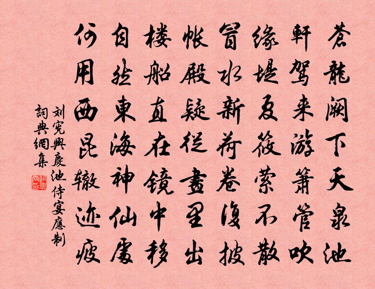 詩詞名句歷史字典書法欣賞書法字典國語詞典說文解字康熙字典古漢語字典標 題 作 者 詩 句 興慶池侍宴應制作者:劉憲 朝代:唐代興慶池侍宴應制原文蒼龍闕下天泉池,軒駕來游簫管吹。緣堤夏筱縈不散,冒水新荷卷復披。帳殿疑從畫裡出,樓船直在鏡中移。自然東海神仙處,何用西崑轍跡疲。詩詞問答問:興慶池侍宴應制的作者是誰?答:劉憲問:興慶池侍宴應制寫於哪個朝代?答:唐代問:興慶池侍宴應制是什麼體裁?答:七律劉憲興慶池侍宴應制書法欣賞興慶池侍宴應制書法作品注釋全唐詩:卷71_14詩詞推薦凝祥三首張耒〔宋代〕齋祠太一館清真,望秩名山固有神。斜日苑門人不到,靈風自掃石床塵。過永福精舍有懷仲白二首劉克莊〔宋代〕求福招提小步廊,憶攜詩卷共追涼。年來行處常迂路,才近君家即斷腸。洞庭驛樓雪夜宴集,奉贈前湘州張員外李群玉〔唐代〕昔與張湘州,閒登岳陽樓。目窮衡巫表,興盡荊吳秋。擲筆落郢曲,巴人不能酬。是時簪裾會,景物窮冥搜。誤忝題終南翠微寺空上人房孟浩然〔唐代〕一作題終南翠微寺翠微終南里,雨後宜返照。閉關久沈冥,杖策一登眺。遂造幽人室,始知靜者妙。儒道雖異門,酪羹司馬光〔宋代〕軍廚重羊酪,饗土舊風傳。不數紫蓴滑,徒夸素鮪鮮。{左火右鼎}蠡煩挏取,勺藥助烹煎。莫與吳兒說,還令笑子陵姜特立〔宋代〕不為故人屈,清名日月高。當時若相漢,不過比元侯。元侯功易歇,子陵名不滅。所以想孤風,猶如隔前日。盧卓山人畫水方乾〔唐代〕常聞畫石不畫水,畫水至難君得名。海色未將藍汁染,筆鋒猶傍墨花行。散吞高下應無岸,斜蹙東南勢欲傾。坐久送僧釋重顯〔宋代〕松風清未休,水月淡相對。去來非等閒,必許孤雲會。寓京口四首答湯菊莊兼簡分司鄭料院甘露寺武衍〔宋代〕二雄曾向此般還,鼎立功名各未安。留得坐時頑石在,至今人尚說曹瞞。駐馬聽·舞白樸〔元代〕鳳髻蟠空,裊娜腰肢溫更柔。輕移蓮步,漢宮飛燕舊風流。謾催鼉鼓品梁州,鷓鴣飛起春羅袖。錦纏頭,劉郎錯認明進士北齋避暑貫休〔唐代〕相訪多衝雨,由來德有鄰。捲簾繁暑退,濕樹一蟬新。道在誰為主,吾衰自有因。只應江海上,還作狎鷗人。贈別盧司直之閩中劉長卿〔唐代〕爾來多不見,此去又何之。華發同今日,流芳似舊時。洲長春色遍,漢廣夕陽遲。歲歲王孫草,空憐無處期。晉陽郡君輓詞強至〔宋代〕夫賢微子後,身貴畢公孫。獨棄斑衣養,空餘象服尊。悲風纏挽鐸,苦霧濕銘旛。誰謂靈香驗,何曾見反魂。出越城訪歸隱庵主人釋文珦〔宋代〕何事相尋向此游,入城不似出城幽。山於屋外參差見,水到門前款曲流。樹腹半空棲伏翼,竹梢初動蔓牽牛。分明壽周提刑二首吳泳〔宋代〕自乞銀符守漢嘉,就持漢節問梅花。庭扉訟少閒微棘,堰水流多漚紵麻。論擊回邪羝觸角,化銷 * 鼠無牙。更看石魚樓楊簡〔宋代〕多謝天工意已勤,四時換樣示吾人。碧桃丹杏分明了,綠艾紅榴次第陳。秋雁聲中休鹵莽,雪梅枝上莫因循。機關除夜防楊此齋王柏〔宋代〕一別癯仙已八年,伶俜鶴骨尚彈冠。相逢逆旅歡然處,各著精神子細看。法曲(散序·道情)曹勛〔宋代〕飛金走玉常賓士。日上還西。自古待著長繩系。算塵心、謾勞役堪悲。盤古到此際。桑田變海,海復成陸高低。噫雨後道間見紅梅施樞〔宋代〕玄都境界玉堂身,輕裊湘裙步曉阻。昨夜雨肥添酒暈,紅情染得十分深。醉桃源 祿存文曲王吉昌〔元代〕祿存文曲附神光。驅驅逐色忙。昧禪徒亂角和商。如何作道場。雙簾掩,瑣明堂。仙童奪正陽。神功機在性昭彰。名句推薦夫民勞則思,思則善心生;逸則淫,淫則忘善,忘善之噁心生。左丘明《國語·魯語·公父文伯之母論勞逸》 春至花如錦,夏近葉成帷。李爽《芳樹》 憶共錦衾無半縫,郎似桐花,妾似桐花鳳。王士禎《蝶戀花·和漱玉詞》 欲寄書如天遠,難銷夜似年長。賀鑄《西江月·攜手看花深徑》 曾與美人橋上別,恨無訊息到今朝。劉禹錫《楊柳枝 / 柳枝詞》 江上往來人,但愛鱸魚美范仲淹《江上漁者》 生當復來歸,死當長相思。蘇武《留別妻》 煢煢孑立,形影相弔。西晉·李密《陳情表》 人攀明月不可得,月行卻與人相隨。李白《把酒問月·故人賈淳令予問之》 算韶華,又因循過了,清明時候。王雱《倦尋芳慢·露晞向晚》