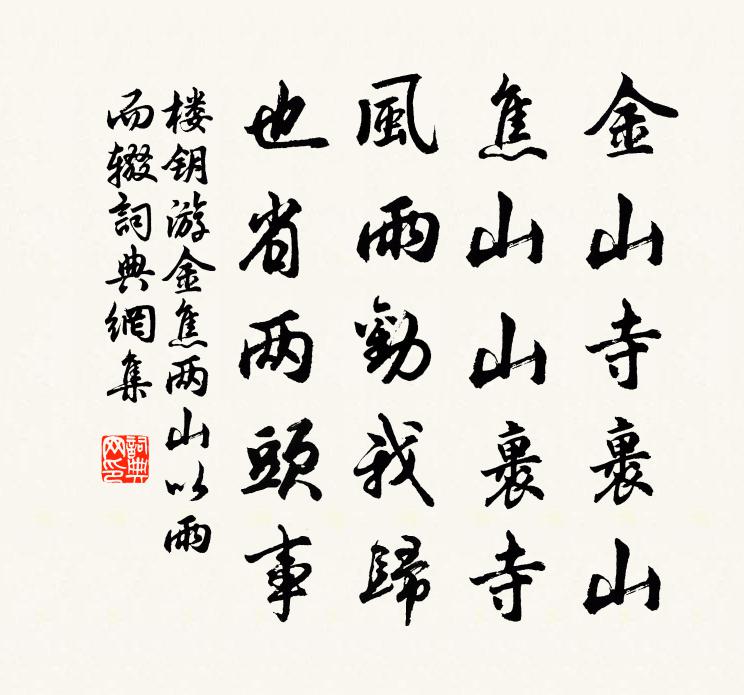 詩詞名句歷史字典書法欣賞書法字典國語詞典說文解字康熙字典古漢語字典標 題 作 者 詩 句 游金焦兩山以雨而輟作者:樓鑰 朝代:宋代游金焦兩山以雨而輟原文金山寺裹山,焦山山裹寺。風雨勸我歸,也省兩頭事。詩詞問答問:游金焦兩山以雨而輟的作者是誰?答:樓鑰問:游金焦兩山以雨而輟寫於哪個朝代?答:宋代樓鑰游金焦兩山以雨而輟書法欣賞游金焦兩山以雨而輟書法作品詩詞推薦書上元夜遊蘇軾〔宋代〕 己卯上元,予在儋州,有老書生數人來過,曰:“良月嘉夜,先生能一出乎?”予欣然從之。步城西,入僧舍次韻子瞻子由題憩寂圖二首黃庭堅〔宋代〕龍眠不似虎頭痴,筆妙天機可並時。蘇仙漱墨作蒼石,應解種花開此詩。次韻寄謝楊制機項安世〔宋代〕把卷愴然不自勝,古來離合豈人能。未應鬻髢尤窮髮,暫喜餐蔬得枕肱。身逐南雲親色養,夢尋巴瘴隔心朋。囊中艮岳李龍高〔宋代〕鹿銜花去彩雲氣,萬歲山前夢已迷。萼綠仙人何許覓,斷崖枯樹夜烏啼。次韻京口叔祖見寄四首張鎡〔宋代〕汲古無初不讀書,屠蘇新制帖僧廬。痴禪晝夜 * 上,貪睡猶勝學宰予。送知己赴濮州李洞〔唐代〕中路行僧謁,郵亭話海濤。劍搖林狖落,旗閃岳禽高。苔長空州獄,花開夢省曹。濮陽流政化,一半布風騷。依韻和原甫昭君辭梅堯臣〔宋代〕武帝常勒兵,北登單于台。始欲以威服,竟亦慚懷來。徒令出塞師,萬里求龍媒。未弭後世患,玉顏困黃埃。丹青鷓鴣天(六十日再賦)魏了翁〔宋代〕兩便星前秉燭游。滔滔車馬九河流。耳聽宣政昇平曲,目斷炎興未復州。聞鼓吹,強歡謳。被人嗺送作遨頭。憑誰雪封寺二首李昴英〔宋代〕征輿六月度梅關,大地清涼樹影班。行客不須梅止渴,流泉到耳冷潺潺。周宣王時童謠佚名〔先秦〕檿弧箕服。實亡周國。宿北山王諶〔宋代〕四壁靜無人,悠然夜不驚。龕燈光焰薄,紙帳夢魂清。有月山猶暗,無風松自鳴。結茅終隱此,高枕待昇平。寒食夜對月項安世〔宋代〕朱公自有五湖天,介子何須九縣田。無限東風原上淚,盡輸西子月中舩。梨花自怯嫦娥白,秋影終隨永夜偏。江海欲到東洛得楊使君書因以此報白居易〔唐代〕向公心切向財疏,淮上休官洛下居。三郡政能從獨步,十年生計復何如?使君灘上久分手,別駕渡頭先得書。且喜皇帝上平上皇帝壽樂曲三舉酒用瑞鶴之曲崔敦詩〔宋代〕彼肅者羽,名紀仙經。芝田下啄,容止安停。引吭警露,響徹青冥。聖德格物,來儀帝庭。晨光次季承韻趙蕃〔宋代〕薄霧收殘雨,疏雲漏曉暾。泥行從上下,歸近得欣奔。近作要重錄,舊書仍再溫。平生屏居趣,畢世願衡門。霅山和丹岩晚春韻衛宗武〔宋代〕密依林谷遠風埃,貞色幽姿不假裁。九畹久殘猶有蕙,光風拂拂轉香來。驀山溪沈蔚〔宋代〕想伊不住。船在藍橋路。別語未甘聽,更擬問、而今是去。門前楊柳,幾日轉西風,將行色,欲留心,忽忽城頭鼓漁父詞一十八首延壽呂岩〔唐代〕子午常餐日月精,玄關門戶啟還扃。長如此,過平生,且把陰陽子細烹。董行成佚名〔宋代〕唐懷州河內縣董行成能策賊。有一人從河陽長店,盜行人驢一頭並皮袋。天欲曉,至懷州。行成至街中,見之,叱示徒釋原妙〔宋代〕學道如初莫變心,千魔萬難愈惺惺。直須敲出虛空髓,拔卻金剛腦後釘。名句推薦昨日入城市,歸來淚滿巾。張俞《蠶婦》 誰知萬里客,懷古正躊躕。陳子昂《峴山懷古》 聞道皇華使,方隨皂蓋臣。王維《送李判官赴東江》 恨舊愁新。有淚無言對晚春。淮上女《減字木蘭花·淮山隱隱》 梅花散彩向空山,雪花隨意穿簾幕。王旭《踏莎行·雪中看梅花》 數回細寫愁仍破,萬顆勻圓訝許同杜甫《野人送朱櫻》 泛樓船兮濟汾河,橫中流兮揚素波。劉徹《秋風辭》 惶恐灘頭說惶恐,零丁洋里嘆零丁。文天祥《過零丁洋》 千古江山,英雄無覓孫仲謀處辛棄疾《永遇樂·京口北固亭懷古》 帳底吹笙香吐麝,更無一點塵隨馬。蘇軾《蝶戀花·密州上元》