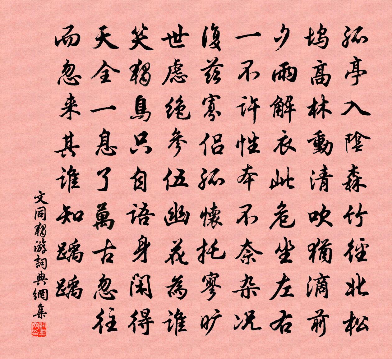 詩詞名句歷史字典書法欣賞書法字典國語詞典說文解字康熙字典古漢語字典標 題 作 者 詩 句 獨游作者:文同 朝代:宋代獨游原文孤亭入陰森,竹徑北松塢。高林動清吹,猶滴前夕雨。解衣此危坐,左右一不許。性本不奈雜,況復茲寡侶。孤懷托寥曠,世慮絕參伍。幽花為誰笑,獨鳥只自語。身閒得天全,一息了萬古。忽往而忽來,其誰知踽踽。詩詞問答問:獨游的作者是誰?答:文同問:獨游寫於哪個朝代?答:宋代文同獨游書法欣賞獨游書法作品詩詞推薦回至瓜洲獻侍中徐鉉〔唐代〕紫微垣里舊賓從,來向吳門謁府公。奉使謬持嚴助節,登讓初識魯王宮。笙歌隱隱違離後,煙水茫茫悵望中。日暮戊申春登平山谷林二堂時茂世應時同行追錄之李處權〔宋代〕已過平山又谷林,登高能賦興何深。群峰雪後皆浮玉,萬竹風前亦碎金。尚喜日聞黃屋信,可堪時動白頭吟。載游送呂欽問監酒受代歸陳與義〔宋代〕以我千金帚,逢君萬斛船。要知窮有自,未覺懶相先。盆盎三年夢,篇章四海傳。匆匆秣歸馬,離恨滿霜天。次韻希父見寄二首林季仲〔宋代〕臘前牆角見梅花,雪後牆頭見月華。滿引濁醪無一事,盡收好處入吾家。結廬君待歸安固,抱翁儂今老永嘉。莫道燭影搖紅(丙子中秋泛月)劉辰翁〔宋代〕明月如冰,亂雲飛下斜河去。旋呼艇子載簫聲,風景還如故。裊裊余懷何許。聽尊前、嗚嗚似訴。近年潮信,萬里客中守歲白居易〔唐代〕守歲尊無酒,思鄉淚滿巾。始知為客苦,不及在家貧。畏老偏驚節,防愁預惡春。故園今夜裡,應念未歸人。喜雨黃公度〔宋代〕皇天嗇甘澤,為農生理休。哀哉桑麻瘁,得意蓬蒿稠。一夜溜檐雨,曉屋喧鳴鳩。驚濤注空壑,秀色溢平疇。田舍山行方岳〔宋代〕人情何翅抵黃間,鴥彼鴻冥杳莫攀。寵辱可驚浮世事,是非不到好溪山。怒鵬已較三千里,老馬寧思十二閒。丘壑戲作簡朱天球吳則禮〔宋代〕江頭雪花一尺圍,不妨屋角梅垂垂。江頭三日浪簸船,不妨老子被底眠。權奇突兀眾所嗔,大是箇中英特人。何曾哀陳夫子王之道〔宋代〕去矣君何速,聞之我重悲。席塵埋古鼎,書蠹入新詩。鴻雁嗟安仰,枌榆痛莫追。木瓜慚未報,臨紙涕漣洏。呈萬菴十章沐浴白玉蟾〔宋代〕藥爐丹鼎火炎炎,六賊三屍怕令嚴。無去無來無進退,不增不減不抽添。愛河浪靜浮朱雀,覺海波深浸白蟾。一自送宋中道朝陵仍於西都省親梅堯臣〔宋代〕西出虎牢關,南瞻園廟戟。漢殿拜衣冠,魏台嚴帳帟。春風石闕冷,曉氣田塗白。早晚下朱陵,先過洛陽陌。送人游杭石延年〔宋代〕激激霜風吹墨貂,男兒醉彆氣飄飄。五湖載酒期吳客,六代成詩倍楚橋。水荇漸青含晚意,江雲初白向春嬌。前秋舟還江南阻風有懷伯兄王安石〔宋代〕幾時重接汝南評,兩漿留連不計程。白浪黏天無限斷,玄雲垂野少晴明。平皋望望欲何向,薄宦嗟嗟空此行。會有寄懷孫處士許彬〔唐代〕生平酌與吟,誰是見君心?上國一歸去,滄波閒至今。鍾繁秋寺遠,岸闊晚濤深。疏放長如此,何人更得尋?贈令狐使趙郡守〔宋代〕□城昔有山,登臨倚空闊。震凌誰負舟,荊榛披雉堞。朅來亦期年,每每念陣跡。雖當補苴時,忍使勝覽絕。度材三橋詩右宜遠歐陽修〔宋代〕朱欄明綠水,古柳照斜陽。何處偏宜望,清漣對女郎。橫舟盧會龍〔宋代〕漫浪江湖萬里天,苹花蘆葉飽風煙。五更驚覺家山夢,撇棹歸來月底眠。荷池小立楊萬里〔宋代〕池小泉多強欲留,留他不住恣他流。荷盤不放荷尖出,穿破盤來卻又休。搆得陳必復〔宋代〕搆得數檐椽,閒身與靜便。半簾花影碎,一樹鳥聲圓。吟苦瘦於舊,春寒多似前。閉門無客過,心事付琴過。名句推薦往年同在鸞橋上,見倚朱闌詠柳綿。韓偓《寒食日重遊李氏園亭有懷》 離情被橫笛,吹過亂山東。王安石《江上》 易挑錦婦機中字。難得玉人心下事。劉克莊《玉樓春·戲林推》 采菱人語隔秋煙,波靜如橫練。王惲《平湖樂·采菱人語隔秋煙》 將壇醇酒冰漿細,元夜邀賓燈火新。趙時春《元宵飲陶總戎家二首》 君子博學而日參省乎己,則知明而行無過矣。荀子《荀子·勸學》 誰言千里自今夕,離夢杳如關塞長。薛濤《送友人》 草木雖無情,因依尚可生李白《樹中草》 夜來城外一尺雪,曉駕炭車輾冰轍。白居易《賣炭翁》 無限旱苗枯欲盡,悠悠閒處作奇峰。來鵠《雲》