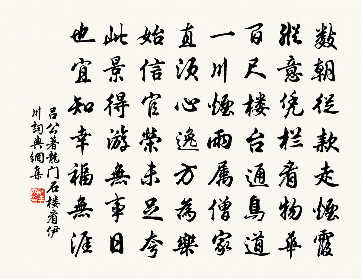 詩詞名句歷史字典書法欣賞書法字典國語詞典說文解字康熙字典古漢語字典標 題 作 者 詩 句 龍門石樓看伊川作者:呂公著 朝代:宋代龍門石樓看伊川原文數朝從款走煙霞,縱意憑欄看物華。百尺樓台通鳥道,一川煙雨屬僧家。直須心逸方為樂,始信官榮未足夸。此景得游無事日,也宜知幸福無涯。詩詞問答問:龍門石樓看伊川的作者是誰?答:呂公著問:龍門石樓看伊川寫於哪個朝代?答:宋代呂公著龍門石樓看伊川書法欣賞龍門石樓看伊川書法作品詩詞推薦宿別瀑上二首劉克莊〔宋代〕十里荒荊手共開,屐痕歷歷在青苔。山中猿鳥愁予去,爭問先生幾日回。偈頌八首釋宗印〔宋代〕多子塔前,風行草偃。育王門一,正令重行。掀翻舊日規模,從教佛祖乞命。不是第一句,亦非格外機。寸釘才入晚步舍東陸游〔宋代〕籬槿花開柿葉丹,土溝東去過牛欄。草煙漠漠天將暮,布褐蕭蕭客正寒。法雲寺陸游〔宋代〕不到法雲久,秋高初一來。廚供菰白美,池蘸水紅開。橋畔逢游衲,雲邊數過桅。同游恨歸早,珍重約尋梅。贈孫花翁翁甫〔宋代〕我生頭髮未燥時,花間已歌花翁詩。我發既長今漸白,猶見花翁好顏色。舉酒祝翁壽百年,我為詩孫戲翁邊。再和姜特立〔宋代〕合居瑣闥蔭庭槐,底事康衢走俗埃。莫買漁舟便歸去,好提鴻筆記方來。湖山剩有詩神助,事業寧須官鬼催。知道自黔中東歸旅次淮上李頻〔唐代〕行旅本同愁,黔吳復阻修。半年方中路,窮節到孤舟。夕靄垂陰野,晨光動積流。家山一夜夢,便是昔年游。贈聞人子進曹勛〔宋代〕丹地清江若有期,卜居仍俯小漣漪。頗憐松竹無多地,只頓琴書已近籬。久雨不妨田要潤,暫涼真與病相宜。何當病起登疊嶂樓張耒〔宋代〕病來久不上層台,窗有蜘蛛徑有苔。多少山茶梅子樹,未開齊待主人來。冬日遙和盧使君幼平、綦毋居士游法華寺高頂皎然〔唐代〕仁坊花標絕境,花廉守躡高花蹤。天曉花才分剎,風傳欲盡鍾。城中歸路遠,湖上碧山重。水照千花界,雲開七葉過安陸舊居鄰里相送宋祁〔宋代〕綠楊枝外斗闌乾,出客雞鳴過近關。豈有車徒休汝上,暫同鄰里到方山。離魂正對春波苦,羈思猶隨倦鳥還。多謝台中聽雪洪咨夔〔宋代〕淅瀝松廳夜,空山一樣聲。冰霜元自勁,水月更添清。衾薄難留夢,窗虛易得明。庭烏催奏墨,未曉已先鳴。蘿衣洞何澹〔宋代〕蘿衣晴帶護煙蓑,楚國狂夫尚作歌。石影到溪千丈勁,藤痕入目八分少。泉分小白山中雨,衣取雲門寺頂荷。洞口燕昭王墓羅隱〔唐代〕戰國蒼茫難重尋,此中蹤跡想知音。強停別騎山花曉,欲吊遺魂野草深。浮世近來輕駿骨,高台何處有黃金?思量贈故人二首馮時行〔宋代〕元戎坐帷幄,花幕清晝閒。井絡天一涯,可以加飯餐。復出群公詩,字字冰雪寒。窮探到冥窈,老語角險艱。一讀攬照文同〔宋代〕恥將衰晚競青春,強把圓波拂曉塵。自笑年來須鬢白,王昭不解作官人。余大父著作嘗以所得沈元用給事歙硯遺水南林劉克莊〔宋代〕隆乾手澤稀疏甚,數帖恓其在水南。但看吾翁貽歙石,固應之子餉端岩。丁寧後裔藏為好,羞愧先民寶不貪。自笑傷吳中李嘉祐〔唐代〕館娃宮中春已歸,闔閭城頭鶯已飛。復見花開人又老,橫塘寂寂柳依依。憶昔吳王在宮闕,館娃滿眼看花發。舞袖春分與諸公同宴呈陸三十四郎中武元衡〔唐代〕南國宴佳賓,交情老倍親。月慚紅燭淚,花笑白頭人。賓瑟常餘怨,瓊枝不讓春。更聞歌子夜,桃李艷妝新。送戴蒙赴成都玉局觀將老焉蘇軾〔宋代〕拾遺被酒行歌處,野梅官柳西郊路。聞道華陽版籍中,至今尚有城南杜。我欲歸尋萬里橋,水花風葉暮蕭蕭。芋魁名句推薦白雁亂飛秋似雪,清露生涼夜。吳西逸《清江引·秋居》 投我以木瓜,報之以瓊琚。佚名《木瓜》 不怕慢,只怕站。佚名《增廣賢文·下集》 胡未滅,鬢先秋。淚空流。陸游《訴衷情·當年萬里覓封侯》 相思相望不相親,天為誰春。納蘭性德《畫堂春·一生一代一雙人》 常思某人德業勝於我,某人學問勝於我,則可以自慚矣。王永彬《圍爐夜話·第六一則》 皚如山上雪,皎若雲間月。卓文君《白頭吟》 春去也,飛紅萬點愁如海。秦觀《千秋歲·水邊沙外》 白髮悲明鏡,青春換敝裘。岑參《武威春暮聞宇文判官西使還已到晉昌》 口惠而實不至,怨菑及其身。戴聖《禮記·表記》
