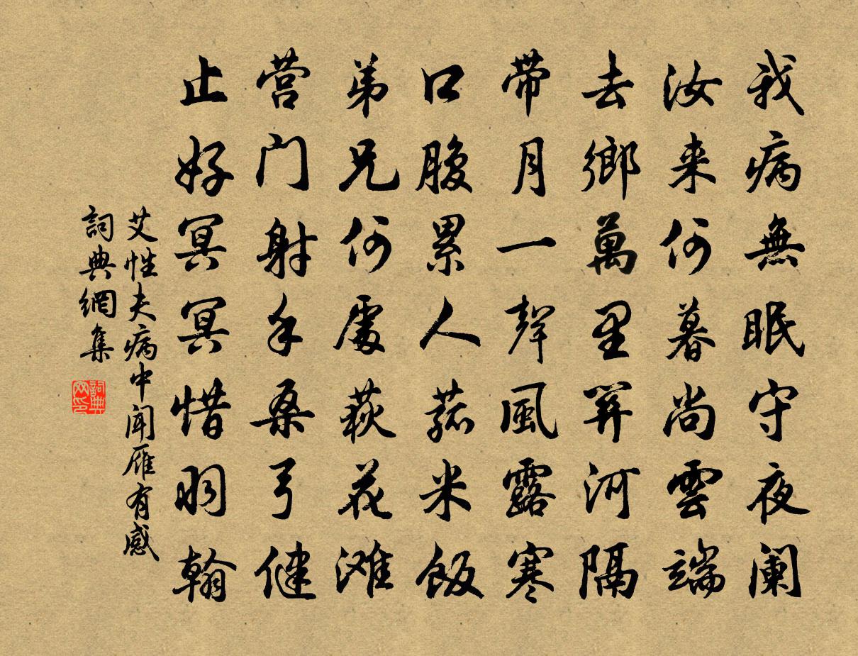 詩詞名句歷史字典書法欣賞書法字典國語詞典說文解字康熙字典古漢語字典標 題 作 者 詩 句 病中聞雁有感作者:艾性夫 朝代:宋代病中聞雁有感原文我病無眠守夜闌,汝來何暮尚雲端。去鄉萬里關河隔,帶月一聲風露寒。口腹累人菰米飯,弟兄何處荻花灘。營門射手桑弓健,止好冥冥惜羽翰。詩詞問答問:病中聞雁有感的作者是誰?答:艾性夫問:病中聞雁有感寫於哪個朝代?答:宋代問:病中聞雁有感是什麼體裁?答:七律艾性夫病中聞雁有感書法欣賞病中聞雁有感書法作品詩詞推薦西江月(賀人女晬)劉澗谷〔宋代〕淑質生當良月,晬辰喜遇今朝。掌心托個儒人苗。早晚夫人爭叫。阿母神仙苗裔,阿爺宰相丰標。阿兄氣宇更飄飄南鄉子(竹居)張炎〔宋代〕愛此碧相依。卜筑西園隱逸時。三徑成 * 可款,幽棲。蒼雪紛紛冷不飛。青眼舊心知。瘦節終看歲晚期。人在清學無學頌一十五首釋印肅〔宋代〕周歲孩兒八十翁,若觀老少絕宗風。眾生世界本無有,妙在當人一性中。梅四首劉鑒〔宋代〕休說逋仙兩句工,冰甌滌筆別形容。清標騷客風前立,素麵仙姝月下逢。山店霜寒香撲馬,溪橋水淺影如龍。一□仲春有懷張栻〔宋代〕西湖景物元瀟灑,楊柳新來兩岸垂。亦有遊人往來否,不應閒過看花時。同諸公夜宴監軍玩花之作(一作同幕府夜宴惜花)武元衡〔唐代〕五侯門館百花繁,紅燭搖風白雪翻。不似鳳凰池畔見,飄揚今隔上林園。村居初夏陸游〔宋代〕暮境難禁日月催,臘醅初見拆泥開。壓車麥穗黃雲卷,食葉蠶聲白雨來。薄飯蕨薇端可飽,短衫紵葛亦新裁。宦塗病起金君卿〔宋代〕黃祖城邊下石船,蕉林暗地雨如煙。只知問俗求民瘼,卻愧經旬臥癉天。鬢髭趙庚夫〔宋代〕鬢髭漸漸長霜莖,老聽山中雀唳聲。九死得生尤可重,百年幾日更多營。自參梵夾機心息,專食藜羹胃氣清。檢點生查子(藥名閨情)陳亞〔宋代〕相思意已深,白紙書難足。字字苦參商,故要檳郎讀。分明記得約當歸,遠至櫻桃熟。何事菊花時,猶未回鄉曲。夜吟吳龍翰〔宋代〕小院沈沈夜欲闌,東風吹月上闌乾。手撼梅花露研墨,醉將吟筆蘸清寒。永嘉即事寄贛縣袁少府瓘張子容〔唐代〕山繞樓台出,谿通里閈斜。曾為謝客郡,多有逐臣家。海氣朝成雨,江天晚作霞。題書報賈誼,此濕似長沙。感遇二十五首張耒〔宋代〕釁隙不在大,巫臣圖夏姬。百端終困楚,吳子會黃池。怨有大於此,居高易逢危。何言戒困獸,無易簀中屍。寓言齊己〔唐代〕造化安能保,山川鑿欲翻。精華銷地底,珠玉聚侯門。始作驕奢本,終為禍亂根。亡家與亡國,雲此更何言。病醉(戲作吳吟,贈盧十九經濟張三十四弘辛丈丘度)元稹〔唐代〕醉伴見儂因病酒,道儂無酒不相窺。那知下藥還沽底,人去人來剩一卮。贈沈雷陽方回〔宋代〕乃翁辛苦注周易,曾夢神人談太極。清泉煮蔬啖糲飯,醯鹽醬姜俱不食。迎霜獵獵紜袍青,映日蕭蕭頷須白。自雲春後望雪蘇轍〔宋代〕秋雨僅熟禾,冬雪不揜塊。溫風搜麥根,天意欲為害。老農強推測,妄謂春當改。三陽已換節,六出尚茫昧。朝看硤石縣旅舍王禹偁〔宋代〕霜乾紅葉飛,遷客思淒淒。處險人垂癭,登山馬跙蹄。籬荒蛬韻苦,雲凍雁行低。此夕應無寐,何煩報曉雞。鵲橋仙劉望之〔宋代〕只應將巧畀人間,定卻向、人間乞取。答劉長卿蛇浦橋月下重送嚴維〔唐代〕月色今宵最明,庭閒夜久天清。寂寞多年老宦,殷勤遠別深情。溪臨修竹煙色,風落高梧雨聲。耿耿相看不寐,遙名句推薦折花逢驛使,寄與隴頭人。陸凱《贈范曄詩》 感時花濺淚,恨別鳥驚心。杜甫《春望》 黯與山僧別,低頭禮白雲。李白《秋浦歌十七首》 深村時節好,應為去年豐。范成大《寒食郊行書事》 天涯芳草迷歸路,病葉還禁一夜霜。王夫之《初度口占·辛丑》 行人莫問當年事,故國東來渭水流。許渾《鹹陽城東樓 / 鹹陽城西樓晚眺 / 西門》 君子不自大其事,不自尚其功戴聖《禮記·表記》 馬蹀閼氏血,旗裊可汗頭。岳飛《送紫岩張先生北伐》 雨足高田白,披蓑半夜耕。崔道融《田上》 妾家高樓連苑起,良人執戟明光里。張籍《節婦吟·寄東平李司空師道》