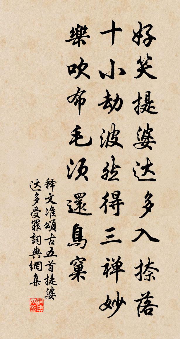 詩詞名句歷史字典書法欣賞書法字典國語詞典說文解字康熙字典古漢語字典標 題 作 者 詩 句 頌古五首提婆達多受罪作者:釋文準 朝代:宋代頌古五首提婆達多受罪原文好笑提婆達多,入捺落十小劫波。然得三禪妙樂,吹布毛須還鳥窠。詩詞問答問:頌古五首提婆達多受罪的作者是誰?答:釋文準問:頌古五首提婆達多受罪寫於哪個朝代?答:宋代釋文準頌古五首提婆達多受罪書法欣賞頌古五首提婆達多受罪書法作品詩詞推薦代挽趙工侍湯氏人三首劉宰〔宋代〕白蓮塘下成新灩,綠柳堤邊散密陰。精舍拂雲松柏繚,死生何地不娛心。寄趙茂實大著二首戴復古〔宋代〕詞臣工筆墨,亦足致功勳。細草平戎策,兼為諭蜀文。一言關治亂,千載有知聞。應笑垂綸叟,愁吟對海雲。即席呈太傅相公范仲淹〔宋代〕鳳池三入冠台躔,致了昇平一品閒。白傅歌詩傅海外,晉公桃李滿人間。上都雲遠經時別,故國春濃幾度還。太史晴郊意行到梅山示弟茝陳著〔宋代〕安排聚首易參差,信意行來始是奇。山色堪餐饒有菊,樵歌相應自成詩。危時杯酌旱雲雨,老境襟期春水澌。醉里次韻伯氏謝安石塘蓮花酒黃庭堅〔宋代〕花蕊芙蕖拍酒醇,浮蛆相亂菊英新。寒光欲漲紅螺面,爛醉從歌白鷺巾。行樂銜杯常有意,過門問字久無人。王孫蕊珠宮王哲〔元代〕栗子二三個。這芋頭的端六個。分付清閒唯兩個。尋思個。甘甜味,怎生個。五臟明明個。又六腑、不差些個。更漁家傲(和門人祝壽)蘇轍〔宋代〕七十餘年真一夢。朝來壽斝兒孫奉。憂患已空無復痛。心不動。此間自有千鈞重。早歲文章供世用。中年禪味疑天張李二君獲薦喜而成篇兼簡岑令蔣掾鄭獬〔宋代〕榜帖初傳見姓名,喜來把讀繞欄行。長風又送二龍去,明月已看雙桂生。群玉聚來俱是寶,真金煉出始為精。雖知【雙調】湘妃怨_春情柳芽箋張可久〔元代〕春情柳芽箋小錦雲緘,蓬島書來紫鳳銜。梨花院靜青燈暗,相思情未減,不由人不瘦的岩岩。塵昏寶鑑,香銷玉簪和張尉食字韻趙善括〔宋代〕玉杯春酌春盤食,曾憶雪香同醉色。歸來信寄未能忘,欲洗羇懷亂愁織。青山相對雲歸堂,一觴聊爾非瓊漿。羨君句張孝友〔宋代〕盡得資川真面目,元知楚國富江山。俳體戲書二首方回〔宋代〕擬訓諸郎業典墳,浪嗔眾富醉紅裙。千金子擁三千客,萬戶侯提百萬軍。帶索榮公知不羨,飲瓢顏子定無聞。淵明游歙州興唐寺張喬〔唐代〕山橋通絕境,到此憶天台。竹里尋幽徑,雲邊上古台。鳥歸殘照出,鍾斷細泉來。為愛澄溪月,因成隔宿回。衡岳道中陳與義〔宋代〕城中望衡山,浮雲作飛蓋。朅來岩谷游,卻在浮雲外。秋日山行簡梁大官駱賓王〔唐代〕乘馬陟層阜,回首睇山川。攢峰銜宿霧,疊巘架寒煙。百重含翠色,一道落飛泉。香吹分岩桂,鮮雲抱石蓮。地偏枕簟入林僻花瓜留客遲十韻葉茵〔宋代〕君顏猶少年,我愛不勝幘。百歲壘一丘,主翁驚是客。頌古十一首釋智鑒〔宋代〕百非路絕透離微,回句情忘發上機。竹密不妨流水過,山高豈礙白雲飛。霜月袁燮〔宋代〕霜氣橫空月色明,寒侵肌骨不勝清。支筇忍凍游山徑,胸次都無世俗情。冷翠谷口占董嗣杲〔宋代〕蒼童負詩篋,百錢掛杖頭。何當倩畫手,畫我廬山游。扇子詩李石〔宋代〕海鳥已飛空自苦,池魚雖美可長欺。白君鬚髮知多少,是我山齋睡熟時。名句推薦發短愁催白,顏衰酒借紅。陳師道《除夜對酒贈少章》 肅肅花絮晚,菲菲紅素輕。杜甫《春遠 / 春運》 流星飛玉彈,寶劍落秋霜。張玉娘《從軍行》 靡蕪盈手泣斜暉,聞道鄰家夫婿歸。魚玄機《閨怨》 雨中山果落,燈下草蟲鳴。王維《秋夜獨坐 / 冬夜書懷》 黃昏院落,淒悽惶惶,酒醒時往事愁腸。李清照《行香子·天與秋光》 寧添一斗,莫添一口。佚名《增廣賢文·上集》 寫不成書,只寄得、相思一點。張炎《解連環·孤雁》 猿鳥猶疑畏簡書,風雲常為護儲胥。李商隱《籌筆驛》 曉月暫飛高樹里,秋河隔在數峰西韓翃《宿石邑山中》