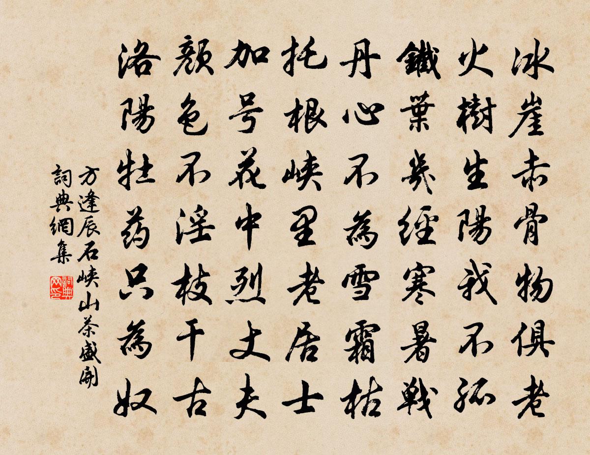 詩詞名句歷史字典書法欣賞書法字典國語詞典說文解字康熙字典古漢語字典標 題 作 者 詩 句 石峽山茶盛開作者:方逢辰 朝代:宋代石峽山茶盛開原文冰崖赤骨物俱老,火樹生陽我不孤。鐵葉幾經寒暑戰,丹心不為雪霜枯。托根峽里老居士,加號花中烈丈夫。顏色不淫枝幹古,洛陽牡藥只為奴。詩詞問答問:石峽山茶盛開的作者是誰?答:方逢辰問:石峽山茶盛開寫於哪個朝代?答:宋代方逢辰石峽山茶盛開書法欣賞石峽山茶盛開書法作品詩詞推薦寄趙東閣盧方春〔宋代〕棧閣傳鈴夜已深,下方方沸管弦音。霜飛初氣侵清坐,月耿斜暉促苦吟。蓍草只知浮世呈,燈花難說隱人心。依然蝶戀花(丁丑七夕)劉鎮〔宋代〕誰送涼蟾消夜暑。河漢迢迢,牛女何曾渡。乞得巧來無用處。世間枉費閒針縷。人在江南煙水路。頭白鴛鴦,不道三月初二日雨人以為風止之祥趙蕃〔宋代〕讖言雨作風當正,得雨喜如遭旱時。枕藉無嗔雜蓑笠,跧藏不異庇茅茨。近看楊柳大垂手,遠對雲山圖入眉。日暮將相棄國第十九文天祥〔宋代〕扈聖登黃閣,大將赴朝廷。胡為入雲霧,浩蕩乘滄溟。雨後曉行獨至愚溪北池柳宗元〔唐代〕宿雲散洲渚,曉日明村塢。高樹臨清池,風驚夜來雨。予心適無事,偶此成賓主。過天門街白居易〔唐代〕雪盡終南又欲春,遙憐翠色對紅塵。千車萬馬九衢上,回首看山無一人。絕纓歌李頎〔唐代〕楚王宴客章華台,章華美人善歌舞。玉顏艷艷空相向,滿堂目成不得語。紅燭滅,芳酒闌,羅衣半醉春夜寒,絕纓疏梅二首張耒〔宋代〕我貧受寒欺,帖帖為不出。積雨遠市聲,幽居近芳物。時禽過我柳,清喙動鳴瑟。客去門復扃,低參映林沒。寄仲彝縣尉葛紹體〔宋代〕別後平安未有書,秋風客里定何如。西湖縱是芙蓉好,不似山家橙橘初。如歸亭吳感〔宋代〕五柳門南派水東,水邊亭上興無窮。半窗山色來雲外,一枕荷香帶雨中。繡被夜歌青翰楫,綠波春颺紫莖風。塵曹梅花王允皙〔清代〕茆屋蒼苔豈有春?翛然曾不步逡巡。自家淪落猶難管,只管吹香與路人。詠史下謝安陳普〔宋代〕宣元社稷等沉淪,不了昌明道子身。奪得桓苻二賊手,付與趙牙張貴人。贈凌山人二首劉宰〔宋代〕星冠鶴氅賸威儀,新納官錢得歸。慚愧三茅老兄弟,一生木石草為衣。鵁鶄杜牧〔唐代〕芝莖抽紺趾,清唳擲金梭。日翅閒張錦,風池去罥羅。靜眠依翠荇,暖戲折高荷。山陰豈無爾,繭字換群鵝。山寺陸游〔宋代〕籃輿送客過江村,小寺無人半掩門。古佛負牆塵漠漠,孤燈照殿雨昏昏。喜投襌榻聊尋夢,嬾為啼猿更斷魂。要識菩薩蠻(癸巳自豫章檄歸)趙師俠〔宋代〕扁舟又向蕭灘去。危檣卻系江頭樹。風送雨聲來。涼生真快哉。電光雲際掣。白浪天相接。不用怯風波。風波平地頌古一百二十一首釋宗杲〔宋代〕後園驢吃草,一老一不老。驀地撞出來。斬湊得恰好。送餘姚知縣陳最寺丞謝絳〔宋代〕愧君來款關,話別憩林間。不待風銷暑,聊因酒發顏。滄洲即欲往,清躅暫容攀。居者羨行者,寄聲思越山。舟中自吳之越寄潤州柳侍御開楊博士邁潘閬〔宋代〕兩岸山光合,況當三月天。好花紅照水,芳草綠隨船。貨藥村橋醉,收帆野渡眠。因思二朝客,同泛恐無緣。夜宿解田偶成釋曇華〔宋代〕夜宿西山居士家,圍爐相對話生涯。從來無一絲頭許,自是勞生眼裹花。名句推薦四十三年,望中猶記,烽火揚州路。辛棄疾《永遇樂·京口北固亭懷古》 床前明月光,疑是地上霜。李白《靜夜思》 遙知未眠月,鄉思在漁歌。杜荀鶴《送人游吳》 天上星河轉,人間簾幕垂。涼生枕簟淚痕滋。李清照《南歌子·天上星河轉》 沖天香陣透長安,滿城盡帶黃金甲。黃巢《不第後賦菊》 一寸丹心圖報國,兩行清淚為思親。于謙《立春日感懷》 行人與我玩幽境,北風切切吹衣冷。李頎《少室雪晴送王寧》 城門失火,殃及池魚。司馬光《資治通鑑·梁紀·梁紀十六》 是數人之齒,而以為富。墨子《墨子·48章 公孟》 厭見千門萬戶,經過北里南鄰。王維《田園樂七首·其一》