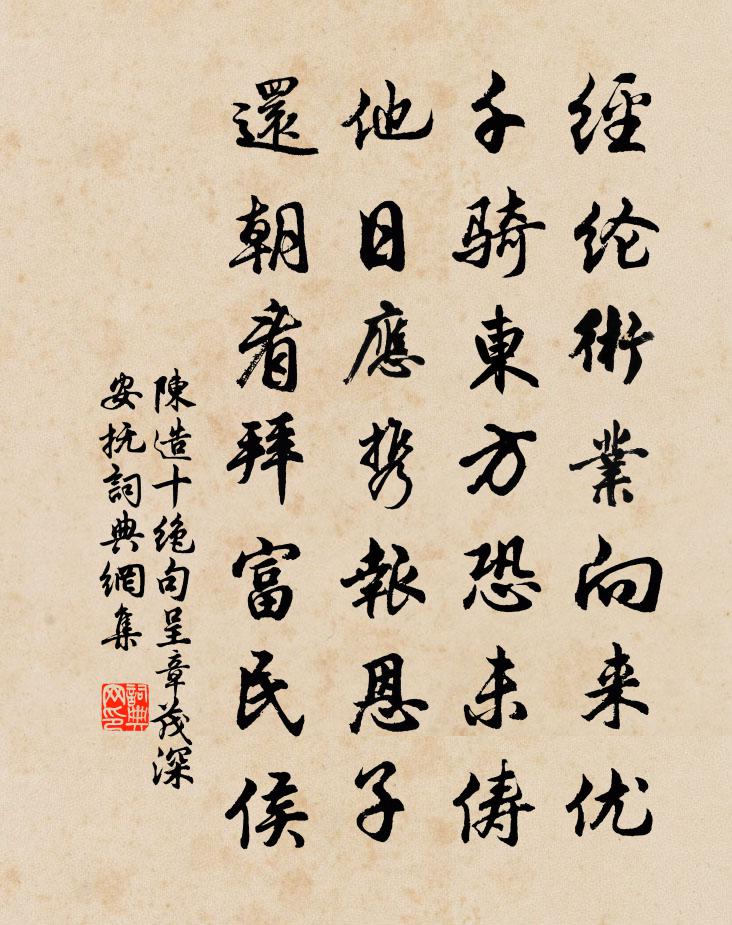 詩詞名句歷史字典書法欣賞書法字典國語詞典說文解字康熙字典古漢語字典標 題 作 者 詩 句 十絕句呈章茂深安撫作者:陳造 朝代:宋代十絕句呈章茂深安撫原文經綸術業向來優,千騎東方恐未儔。他日應攜報恩子,還朝看拜富民侯。詩詞問答問:十絕句呈章茂深安撫的作者是誰?答:陳造問:十絕句呈章茂深安撫寫於哪個朝代?答:宋代陳造十絕句呈章茂深安撫書法欣賞十絕句呈章茂深安撫書法作品詩詞推薦游金精次謝東野韻廖斯任〔宋代〕跨鶴仙妹已九霄,尚餘勝地景偏饒。石盤洞口疑無路,水繞山根忽有橋。樓殿雲棲迷曉日,筠松風度響寒潮。番君仗錫山中釋文珦〔宋代〕雨地春山薇蕨長,曉隨樵子穿雲上。貪看岩頭瀑布飛,坐來忘卻青藜杖。旅遊番禺獻涼公李群玉〔唐代〕帝鄉群侶杳難尋,獨立滄洲歲暮心。野鶴棲飛無遠近,稻粱多處是恩深。蝶戀花佚名〔宋代〕張亦有所娶。適經其所居,乃因其夫言於崔,以外兄見。夫已諾之,而崔終不為出。張怨念之誠,動於顏色。崔知哭徐璣五首趙師秀〔宋代〕思君氣實充,不與短折類。血死匪無由,恐是服椒罪。君於藥自深,何獨此乎昧。豈不聞仙人,餌菖得千歲。和永叔六篇其四禁中鞓紅牡丹梅堯臣〔宋代〕與公同是洛陽客,今日論年皆作翁。一見此花知有感,衰顏不似舊時紅。踏莎行盧祖皋〔宋代〕夜雨燈深,春風寒淺。梅姿雪態憐嬌軟。錦箋閒軸舊緘情,酒邊一顧清歌遍。玉局彈愁,冰弦寫怨。幾時縴手教重修竹二首晁公溯〔宋代〕修林出夏筍,戢戢如牛毛。寧亡口腹味,所冀逃炎熇。露節半含粉,風篁微解苞。清陰日夜長,會見乾雲霄。登天竺靈隱寺上方趙湘〔唐代〕寺高傅絕頂,一到即忘機。夜月逢僧早,秋雲出樹微。磬邊岩狖過,窗外海雕飛。欲下莓苔磴,題名卻惜歸。古記/如夢令佚名〔宋代〕一枕厭厭春困。記得小梅風韻。何處最關情,嫩蕊初傳芳信。堪恨。堪恨。誰傍橫斜疏影。送王敦素歸金陵王銍〔宋代〕曉踏河堤月,逢有問去舟。已為羇旅客,更挽別離愁。索寞憐同姓,丁寧數舊遊。欲知幽獨意,風露滿城秋。定風波歐陽修〔宋代〕把酒花前欲問公。對花何事訴金鍾。為問去年春甚處。虛度。鶯聲撩亂一場空。今歲春來須愛惜。難得。須知花面鵲橋仙(鄉守趙丞相生日)劉克莊〔宋代〕去年無麥,今年多稼,儘是君侯心地。向來寺寺總拘樁,今有不拘樁底寺。省倉展日,米場鐫價,萬落千村蒙惠。夷山醉歌汪元量〔宋代〕楚狂醉歌歌正發,更上樑台望明月。朔風獵獵吹我衣,絕代佳人皎如雪。搥羯鼓,彈箜篌,烹羊宰牛坐糟丘,一笑琴台汪元量〔宋代〕文園多病厭文君,恨入金徽不忍聞。寂寞高台留古蹟,來牛去馬自成群。梅雪堂鄭會〔宋代〕素心甘澹泊,秉節性貞固。開堂撫垂雲,徘徊閱嘉樹。孤根倚絕壁,清光更回互。生平鐵石腸,不受纖塵污。雇結偈十三首釋法泰〔宋代〕推真真無有相,窮妄妄無有形。真妄兩無所有,廓然露出眼睛。眼睛既露,見個什麽。曉日爍開岩畔雪,朔風吹綻重經故人舊居釋紹嵩〔宋代〕五字研成舉世傳,醉吟朝夕在樊川。江南海北三千里,雨散雲飛二十年。壁上塵黏蒲葉扇,鏡中人入洞庭煙。倦遊寄中書李舍人紓戴叔倫〔唐代〕萍翻蓬自卷,不共本心期。復入重城裡,頻看百草滋。水流歸思遠,花髮長年悲。盡日春風起,無人見此時。白雪米友仁〔宋代〕洞天晝永,正中和時候,涼飆初起。羽扇綸巾,雲流處,水繞山重雲委。好雨新晴,綺霞明麗,全是丹青戲。豪攘名句推薦故人在其下,塵土相豗蹴。蘇軾《送頓起》 尚憐終南山,回首清渭濱。杜甫《奉贈韋左丞丈二十二韻》 以身教者從,以言教者訟。范曄《後漢書·列傳·第五鍾離宋寒列傳》 冬夜兮陶陶,雨雪兮冥冥。王逸《九思》 靜女其孌,貽我彤管。佚名《靜女》 灞橋煙柳,曲江池館,應待人來。陸游《秋波媚·七月十六日晚登高興亭望長安南山》 涓涓不壅,終為江河佚名《孔子家語·觀周》 花無人戴,酒無人勸,醉也無人管。黃公紹《青玉案·年年社日停針線》 臨官莫如平,臨財莫如廉。劉向《說苑·政理》 奢侈之敗家,猶出常情;而慳吝之敗家,必遭奇禍。王永彬《圍爐夜話·第五九則》