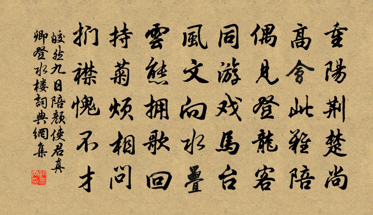 詩詞名句歷史字典書法欣賞書法字典國語詞典說文解字康熙字典古漢語字典標 題 作 者 詩 句 九日陪顏使君真卿登水樓作者:皎然 朝代:唐代九日陪顏使君真卿登水樓原文重陽荊楚尚,高會此難陪。偶見登龍客,同遊戲馬台。風文向水疊,雲態擁歌回。持菊煩相問,捫襟愧不才。詩詞問答問:九日陪顏使君真卿登水樓的作者是誰?答:皎然問:九日陪顏使君真卿登水樓寫於哪個朝代?答:唐代問:九日陪顏使君真卿登水樓是什麼體裁?答:五律皎然九日陪顏使君真卿登水樓書法欣賞九日陪顏使君真卿登水樓書法作品注釋全唐詩:卷817-29詩詞推薦句蔣堂〔宋代〕離堆山外更西去,應入白雲餐蕨薇。句高荷〔宋代〕所喜江陵得真處,沮漳依舊兩川橫。親祠堂主鸞曾駐,善夢先生蝶不歸。沙軟綠頭相併鴨,水深紅尾自跳魚。威強元日雲安道趙崇嶓〔宋代〕元日度巴雲,時逢朐{左月右忍}人。野梅空自落,山鳥暗知春。不醉新年酒,徒悲異域身。無窮倦行意,亭柳漫靜樂吟邵雍〔宋代〕和氣四時均,何時不是春。都將無事樂,變作有形身。靜把詩評物,閒將理告人。雖然無鼓吹,此樂世難倫。水龍吟譚處端〔元代〕世傳海有三山,內藏羽化仙芝草。秦皇信此,使令徐福,東遊蓬島。雲水風濤浩浩。男女舟中成老。望仙源縹緲。次王仲信食粥李洪〔宋代〕太白狂歌力士鐺,未如食粥魯公清。從教過午飢腸轉,政坐喔詩青眼橫。奇怪爭觀出月脅,詼諧猶足助言鯖。臥聽哭李清卿侍郎王洋〔宋代〕皇澤淹時久,人懷孝可移。不應當後患,端恨未前知。國破言猶壯,身亡義不虧。青編照千古,昭代有芳辭。子由作二頌,頌石台長老問公︰手寫《蓮經》蘇軾〔宋代〕眼睛心地兩虛圓,脅不沾床二十年。誰信吾師非不睡,睡蛇已死得安眠。點絳唇(紫蘇熟水)楊無咎〔宋代〕寶勒嘶歸,未教佳客輕辭去。姊夫屢鼠。笑聽殊方語。清入迴腸,端助詩情苦。春風路。夢尋何處。門掩桃花雨。玉樓春晏幾道〔宋代〕輕風拂柳冰初綻,細雨消塵雲未散。紅窗青鏡待妝梅,綠陌高樓催送雁。華羅歌扇金蕉盞,記得尋芳心緒慣。鳳城送郡判鄭世表庫部奉使陝西強至〔宋代〕心馳關右氣軒軒,笑著征袍謝別樽。面對延和知遠器,力城東洛是名門。邊需前去勞多算,疆事歸來聽一言。洮隴三句外道禪師〔宋代〕當人如舉唱,三句豈能該。有問如何事,南嶽與天台。幽居即事八首趙蕃〔宋代〕遊絲落花春盡,綠葉青陰夏來。雨潤苔錢更積,風清竹戶頻開。句釋曉瑩〔宋代〕搘筇聊小立。江城梅花引(枕屏)丘崈〔宋代〕輕煤一曲染霜紈。小屏山。有無間。宛是西湖,雪後未晴天。水外幾家籬落晚,半開關。有梅花、傲峭寒。漸看。題汪水雲詩卷劉震祖〔宋代〕高深妙語坐鬅鬙,花落茶煙夜雨燈。俗眼不知鵬化鷃,書痴何害墨成蠅。雲泥夢覺空陳跡,桑海吟殘嗅葛藤。劍吼試筆釋智圓〔宋代〕城市居無分,山林住有緣。語慚甘似薺,道貴直如弦。兀兀吟終日,羸羸病過年。靜招湖畔鶴,閒泛雪中船。散悶木客李公佐仆〔唐代〕酒盡君莫沾,壺傾我當發。城市多囂塵,還山弄明月。滄浪亭胡珵〔宋代〕昔聞滄浪亭,未濯滄浪水。先賢眇遺蹟,壯觀一何侈。飛橋跨木末,巨浸折胡壘。糟床行萬瓮,繚牆周數里。廢興登齊雲和祖天錫公韻羅榮祖〔宋代〕名山今日始攀躋,峭壁巉崖路欲迷。荊棘撥開登月窟,腳根穩著步天梯。恍疑身在半空去,忽見鳥從平地飛。勝景名句推薦落地為兄弟,何必骨肉親!陶淵明《雜詩》 狂風吹我心,西掛鹹陽樹。李白《金鄉送韋八之西京》 故山知好在,孤客自悲涼。蘇軾《臨江仙·送王緘》 想見廣寒宮殿,正雲梳風掠。辛棄疾《好事近·中秋席上和王路鈐》 揚子江頭楊柳春,楊花愁殺渡江人。鄭谷《淮上與友人別》 小男供餌婦搓絲,溢榼香醪倒接罹。李郢《南池》 跬步而不休,跛鱉千里;累土而不輟,丘山崇成。荀子《荀子·修身》 門隔花深舊夢遊,夕陽無語燕歸愁。玉纖香動小簾鉤。吳文英《浣溪沙·門隔花深舊夢遊》 他鄉生白髮,舊國見青山。司空曙《賊平後送人北歸》 將者,上不制於天,下不制於地,中不制於人。尉繚《尉繚子·兵談》