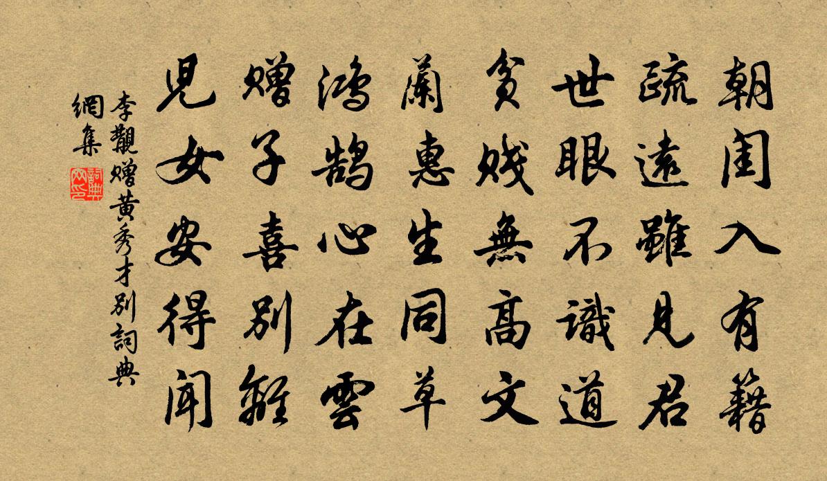 詩詞名句歷史字典書法欣賞書法字典國語詞典說文解字康熙字典古漢語字典標 題 作 者 詩 句 贈黃秀才別作者:李覯 朝代:宋代贈黃秀才別原文朝閨入有籍,疏遠雖見君。世眼不識道,貧賤無高文。蘭惠生同草,鴻鵠心在雲。贈子喜別離,兒女安得聞。詩詞問答問:贈黃秀才別的作者是誰?答:李覯問:贈黃秀才別寫於哪個朝代?答:宋代李覯贈黃秀才別書法欣賞贈黃秀才別書法作品詩詞推薦荔枝葉茵〔宋代〕縐紅紗護水晶團,驛騎飛來露未乾。胡羯垂涎猶不悟,馬嵬山底夢長安。清明日送韋侍御貶虔州白居易〔唐代〕寂寞清明日,蕭條司馬家。留餳和冷粥,出火煮新茶。欲別能無酒,相留亦有花。南遷更何處?此地已天涯。己己歲夏旱大熱睡起偶成曾幾〔宋代〕年年暑去皆有期,今年暑去何遲遲。不知搖敗幾團扇,得到西風吹面時。罷相作李适之〔唐代〕避賢初罷相,樂聖且銜杯。為問門前客,今朝幾個來?送盧先輩自衡岳赴復州嘉禮二首許渾〔唐代〕名振金閨步玉京,暫留滄海見高情。眾花盡處松千尺,群鳥喧時鶴一聲。朱閣簟涼疏雨過,碧溪船動早潮生。離心詠史上倪寬陳普〔宋代〕親媚張湯似謁居,阿諛天子過相如。漢儒個個公孫子,不墜遺經一仲舒。水調歌頭(席上作)趙善括〔宋代〕碧雲初返岫,潦水正鳴灘。蘭舟容與,歌舞偏稱笑中看。燭影烘寒成暖,花色照人如畫,一坐有餘歡。酒灩浮金盞送信南歸雁盪山釋希晝〔宋代〕千峰鄰積水,秋勢遠相依。路在深雲里,人思絕頂歸。長天來月正,危木度猿稀。誰得同無念,寥寥此掩扉。麗水甄殿丞手植朱李繁實盈枝折以貺予感而成楊億〔宋代〕五年為邑鬢霜侵,吏隱由來得趣深。不獨弦歌長滿耳,兼聞桃李已成陰。晨昏我有南陔戀,江海君懷北闕心。早晚郡齋水閣閒書憑几文同〔宋代〕列傳日逢佳士,群書時得微言。自對古人憑几,不煩俗客登門。次韻酬宋妃六首王安石〔宋代〕城中燈火照青春,遠引吾方避糾紛。游衍水邊追野馬,嘯歌林下應山君。愁尋徑草無求仲,喜對檐花有廣文。邂逅從驛次草堂復至東屯二首杜甫〔唐代〕峽內歸田客,江邊借馬騎。非尋戴安道,似向習家池。峽險風煙僻,天寒橘柚垂。築場看斂積,一學楚人為。短景送赴省諸友林德遇劉克莊〔宋代〕原夫輦豈敢追攀,每嘆君文似左班。不許犬雞舐丹鼎,肯為鼷鼠發黃間。主司一洗冬烘謗,老子前知晝錦還。空誦漁家傲歐陽修〔宋代〕九月重陽還又到。東籬菊放金錢小。月下風前愁不少。誰語笑。吳娘搗練腰肢裊。槁葉半軒慵更掃。憑闌豈是閒臨羔裘佚名〔先秦〕羔裘逍遙,狐裘以朝。豈不爾思?勞心忉忉。羔裘翱翔,狐裘在堂。豈不爾思?我心憂傷。羔裘如膏,日出有曜。題天海風雲之樓胡仲弓〔宋代〕欲艤扁舟約月明,倚樓少待暮潮平。雁邊有客關新恨,鷗外無人訪舊盟。天地能容蒼海闊,風波難與白雲爭。回頭挽黃提舉震三章陳著〔宋代〕江山古四明,獨立表平生。敏處經綸密,癯中氣局宏。鴻毛看勢利,虎口見功名。麾節那能究,東南天已傾。旅宿淮陽亭口號宋之問〔唐代〕日暮風亭上,悠悠旅思多。故鄉臨桂水,今夜渺星河。暗草霜華發,空亭雁影過。興來誰與語,勞者自為歌。泛苕溪王諶〔宋代〕六幅蒲帆去似飛,浪翻新漲綠沿堤。一川水墨王摩詰,十里鶯花杜牧之。雲繞楚宮春雨後,煙籠秦樹晚晴時。人生立春日曹松〔唐代〕春飲一杯酒,便吟春日詩。木梢寒未覺,地脈暖先知。鳥囀星沈後,山分雪薄時。賞心無處說,悵望曲江池。名句推薦失之毫釐,差以千里。班固《漢書·傳·東方朔傳》 清香隨風發,落日好鳥歸。李白《詠鄰女東窗海石榴》 采采黃金花,何由滿衣袖。杜甫《九日寄岑參》 善學者,假人之長以補其短。呂不韋《呂氏春秋·紀·孟夏紀》 人散市聲收,漸入愁時節。劉克莊《生查子·元夕戲陳敬叟》 染柳煙濃,吹梅笛怨,春意知幾許。李清照《永遇樂·落日熔金》 權,然後知輕重;度,然後知長短。物皆然,心為甚。孟子《孟子·梁惠王章句上·第八節》 不似秋光,只與離人照斷腸。蘇軾《減字木蘭花·春月》 從臣皆半醉,天子正無愁。李商隱《陳後宮》 今夜故人來不來,教人立盡梧桐影。呂岩《梧桐影·落日斜》