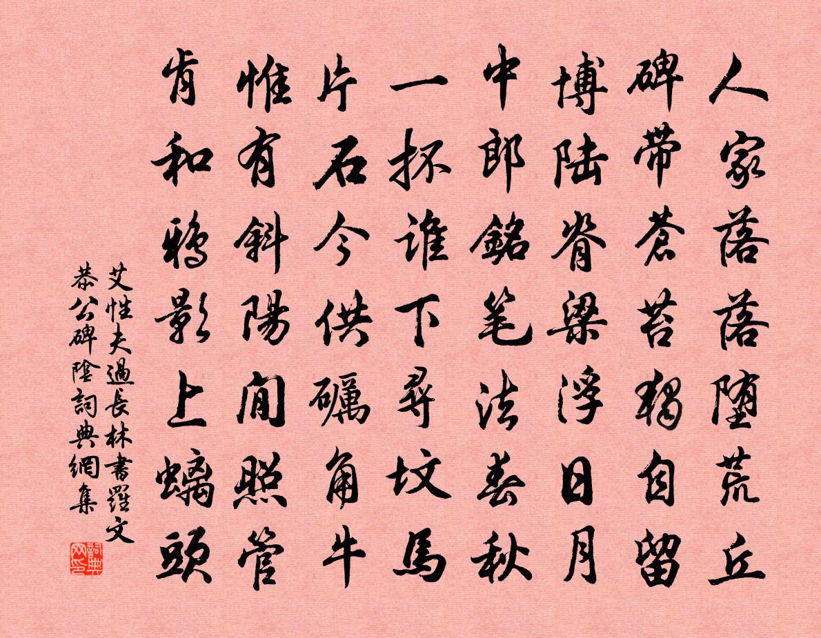 詩詞名句歷史字典書法欣賞書法字典國語詞典說文解字康熙字典古漢語字典標 題 作 者 詩 句 過長林書羅文恭公碑陰作者:艾性夫 朝代:宋代過長林書羅文恭公碑陰原文人家落落墮荒丘,碑帶蒼苔獨自留。博陸脊樑浮日月,中郎銘筆法春秋。一抔誰下尋墳馬,片石今供礪角牛。惟有斜陽閒照管,肯和鴉影上螭頭。詩詞問答問:過長林書羅文恭公碑陰的作者是誰?答:艾性夫問:過長林書羅文恭公碑陰寫於哪個朝代?答:宋代問:過長林書羅文恭公碑陰是什麼體裁?答:七律艾性夫過長林書羅文恭公碑陰書法欣賞過長林書羅文恭公碑陰書法作品詩詞推薦寄題宋職方翠樓余靖〔宋代〕層樓幽趣稱登臨,望遠憑高豁素襟。棋酒等閒忘世慮,溪山最樂是家林。松聲帶雨千峰外,潭影涵虛落照深。此景次韻吳竹溪名俊民謝單景山名樞載酒陳著〔宋代〕杯盤移醉冠春園,酒散人歸月在門。何日喜還供笑語,酌君村酒侑齏盆。與李全交詩(全交,監察御史)石惠泰〔唐代〕御史非常任,參軍不久居。待君遷轉後,此職還到余。洪駒父泛舟將過潁同張仲宗出錢席間留詩為別王銍〔宋代〕已作分攜計,尤傷送客歸。經行汝南郡,為問漢陰機。晚菊饒秋色,丹楓帶恨飛。平生無別淚,相對倍沾衣。隨駕游青城李舜弦〔唐代〕因隨八馬上仙山,頓隔塵埃物象閒。只恐西追王母宴,卻憂難得到人間。瑞鷓鴣(觀潮)蘇軾〔宋代〕碧山影里小紅旗。儂是江南踏浪兒。拍手欲嘲山簡醉,齊聲爭唱浪婆詞。西興渡口帆初落,漁浦山頭日未敧。儂欲送耿拾遺湋充括圖書使往江淮盧綸〔唐代〕傳令收遺籍,諸儒喜餞君。孔家唯有地,禹穴但生雲。編簡知還續,蟲魚亦自分。如逢北山隱,一為謝移文。留題洞岩宋禧〔宋代〕翠岩仙洞白雲深,躡石捫蘿一訪尋。真馭不逢山色映,澗風吹袂冷森森。示友陸游〔宋代〕道向虛中得,文從實處工。凌空一鶚上,赴海百川東。氣骨真當勉,規模不必同。人生易衰老,君等勿匆匆。題淡山岩二首黃庭堅〔宋代〕去城二十五里近,天與隔盡俗子塵。春蛙秋蠅不到耳,夏涼冬暖總宜人。岩中清磬僧定起,洞口綠樹仙家春。惜哉爛柯山二首釋懷古〔宋代〕王質爛柯事,傳聞不在疑。百年容易客,一局等間棋。此著有誰見,無言祇自知。石橋南畔路,依舊日斜暉。寄杜拾遺任華〔唐代〕杜拾遺,名甫第二才甚奇。任生與君別,別來已多時,何嘗一日不相思。杜拾遺,知不知?昨日有人誦得數篇黃絹回峰院留題王曙〔宋代〕山勢欲壓海,禪扃向此開。魚龍腥不到,日月影先來。樹色秋擎出,鐘聲浪答回。何期隨吏役,暫得拂塵埃。周成職方笑台祖無擇〔宋代〕賈生太息唐衢哭,感事傷時可奈何。爭似君當堯舜日,台頭大笑樂天和。頌古四十八首釋慧開〔宋代〕趙州若在,倒行此令。奪卻刀子,南泉乞命。導引洪适〔宋代〕重華天子,長至奉神虞。九奏會軒朱。星暉雲潤東方曉,拜貺竹宮初。歸來千乘護皇輿。瑞景集金鋪。雞竿高唱恩謁金門黃機〔宋代〕風又雨。牆外落紅無數。人不歸來春不住。佳期還已誤。細細一團愁緒,薄倖疏狂何處。化作青鸞飛得去。問天天言法華贊釋宗杲〔宋代〕旋陀羅尼三昧,語默元無罣礙。攬衣著屐走街,剛被時人笑怪。問伊住止何處,向道我儂弗會。進前擬議思量,咄謁金門(昔游)毛滂〔宋代〕燈霧裡。老去昔游不記。月似舊時人不似。小樓何處是。歸臥晚香翠被。玉酒著人小醉。欲睡先來都不睡。此情那寄雪竇足首坐釋智愚〔宋代〕光芒曾不著織埃,拂拭磨礱心已灰。秋夜不禁猿嘯月,與誰同上妙高台。名句推薦人情若比初相識,到底終無怨恨心。馮夢龍《醒世恆言·卷一》 愛臣太親,必危其身;人臣太貴,必易主位。韓非及後人《韓非子·愛臣》 彩舟載得離愁動。無端更借樵風送。賀鑄《菩薩蠻·彩舟載得離愁動》 與朋友交,言而有信。孔子弟子《論語·學而篇》 春酒香熟鱸魚美,誰同醉?纜卻扁舟篷底睡。李珣《南鄉子·雲帶雨》 樹曲木者,惡得直景劉向《說苑·君道》 一家二貴,事乃無功。韓非及後人《韓非子·揚權》 節用儲蓄,以備凶災范曄《後漢書·本紀·肅宗孝章帝紀》 狂風吹我心,西掛鹹陽樹。李白《金鄉送韋八之西京》 水漲魚天拍柳橋。雲鳩拖雨過江皋。周邦彥《浣溪沙·水漲魚天拍柳橋》