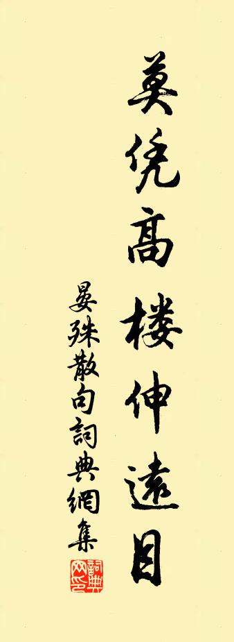 詩詞名句歷史字典書法欣賞書法字典國語詞典說文解字康熙字典古漢語字典標 題 作 者 詩 句 句作者:晏殊 朝代:宋代句原文莫憑高樓伸遠目。詩詞問答問:句的作者是誰?答:晏殊問:句寫於哪個朝代?答:宋代問:晏殊的名句有哪些?答:晏殊名句大全晏殊句書法欣賞句書法作品詩詞推薦燭影搖紅鼓峰〔宋代〕風入虞弦,麥秋向晚梅天潤。彩絲長命斗新奇,還是端陽近。想見瑤池仙韻。對蟠桃、朱顏相映。篆飄寶鼎,酒滿雜帖語佚名〔唐代〕常雜鮑帖。滿江紅·翠幕深庭吳文英〔宋代〕翠幕深庭,露紅晚、閒花自發。春不斷、亭台成趣,翠陰蒙密。紫燕雛飛簾額靜,金鱗影轉池心闊。有花香、竹色郊廟歌辭。德明興聖廟樂章。亞獻終獻李紓〔唐代〕惟清惟肅,靡聞靡見。舉備九成,俯終三獻。慶彰曼壽,胙撤嘉薦。瘞玉埋牲,禮神斯遍。頌古二十四首釋宗演〔宋代〕張侯白,李侯黑。硬如綿,軟如鐵。驀路相逢兩會家,臨濟未是白拈賊。促拍醜奴兒(辛巳除夕)劉辰翁〔宋代〕送歲可無詩。得團欒、忍不開眉。不記去年今夕夢,江東懷抱,江西信息,舍北妻兒。五十扊扅炊。待五十、富貴登雲陽九里埭詩鮑照〔南北朝〕宿心不復歸。流年抱衰疾。既成雲雨人。悲緒終不一。徒憶江南聲。空錄齊後瑟。方絕縈弦思。豈見繞樑日黃芙蓉黃庚〔宋代〕媚色津津散朵芳,道人裝束勝紅妝。詩人若作桃花看,便覺西風不甚涼。雁影顧逢〔宋代〕萬里衡陽別,翱翔背夕暉。數行天外過,一片水中飛。無跡留沙渚,有聲過釣磯。回頭還自顧,上下帶雲歸。感皇恩程大昌〔宋代〕池館足名花,四時蔫馥。就裡梅春春到速。周遭松竹,任是雪霜長綠。總堪供壽樂,翻新曲。別向心田,有般奇木次韻似前人陳著〔宋代〕山居隨意旋添成,截斷人閒利慾腥。蘭茁不妨虛白屋,松苗如見舊氈青。書痴面目唾亦笑,酒聖風流心自醒。閒里送李嘉祐正字括圖書兼往揚州覲省司空曙〔唐代〕不事蘭台貴,全多韋帶風。儒官比劉向,使者得陳農。晚燒平蕪外,朝陽疊浪東。歸來喜調膳,寒筍出林中。感皇恩晁端禮〔宋代〕蜀錦滿林花,三年重到。應被花枝笑人老。半開微謝,占得幾多時好。便須拼痛飲、花前倒。醉中但記,紅圍綠繞送馬秀才落第歸江南劉長卿〔唐代〕南客懷歸鄉夢頻,東門悵別柳條新。殷勤斗酒城陰暮,蕩漾孤舟楚水春。湘竹舊斑思帝子,江蘺初綠怨騷人。憐君南來苦熱戲作二首黃公度〔宋代〕大旱赤城金將流,火炎崑岡玉石休。六月王師萬貔貅,叢坐氊帳襲重裘。鄰人延燒已焦頭,未如三伏行南州。寓天台水南四首林憲〔宋代〕懷古不知寒,洗心忘百憂。怡然方寸地,得與賢聖游。南澗兮泉甘,北山兮雲幽。彼紛兮何之,茲盤兮吾留。重過龍居寺劉政〔宋代〕重來舊遊處,觸目景添幽。故墨猶余跡,忠魂已斷頭。疎鍾號暮雨,枯木響殘秋。欲訴愁人意,頻懷杞國憂。甲戌冬屬疾賜告二首宋庠〔宋代〕恩告偃衡蓽,年華飛琯灰。右眠安佛脅,深息養仙胎。數犯稽違禁,誰憐濩落材。使軺均病粟,更自囅然咍。夏晝章望之〔宋代〕一日常百刻,轉若車輪忙。千日十萬刻,百年能幾長。達人齊古今,一生甚微茫。夏日豈為永,而足以較量。人世望江南(閨情)張先〔宋代〕香閨內、空自想佳期。獨步花陰情緒亂,謾將珠淚兩行垂。勝會在何時。厭厭病,此夕最難持。一點芳心無托處,名句推薦可憎者,人情冷暖;可厭者,世態炎涼。程登吉《幼學瓊林·卷一·歲時》 半死梧桐老病身,重泉一念一傷神。白居易《為薛台悼亡》 城裡夕陽城外雪,相將十里異陰晴。王守仁《次韻陸僉憲元日春晴》 自知者不怨人,知命者不怨天。荀子《荀子·榮辱》 且欲近尋彭澤宰,陶然共醉菊花杯。崔曙《九日登望仙台呈劉明府容》 卻將萬字平戎策,換得東家種樹書。辛棄疾《鷓鴣天·有客慨然談功名因追念少年時事戲作》 梅似雪,柳如絲。試聽別語慰相思。辛棄疾《鷓鴣天·送歐陽國瑞入吳中》 兩情若是久長時,又豈在朝朝暮暮。秦觀《鵲橋仙·纖雲弄巧》 不將辛苦意,難近世間財。馮夢龍《醒世恆言·卷十四》 憶共錦衾無半縫,郎似桐花,妾似桐花鳳。王士禎《蝶戀花·和漱玉詞》