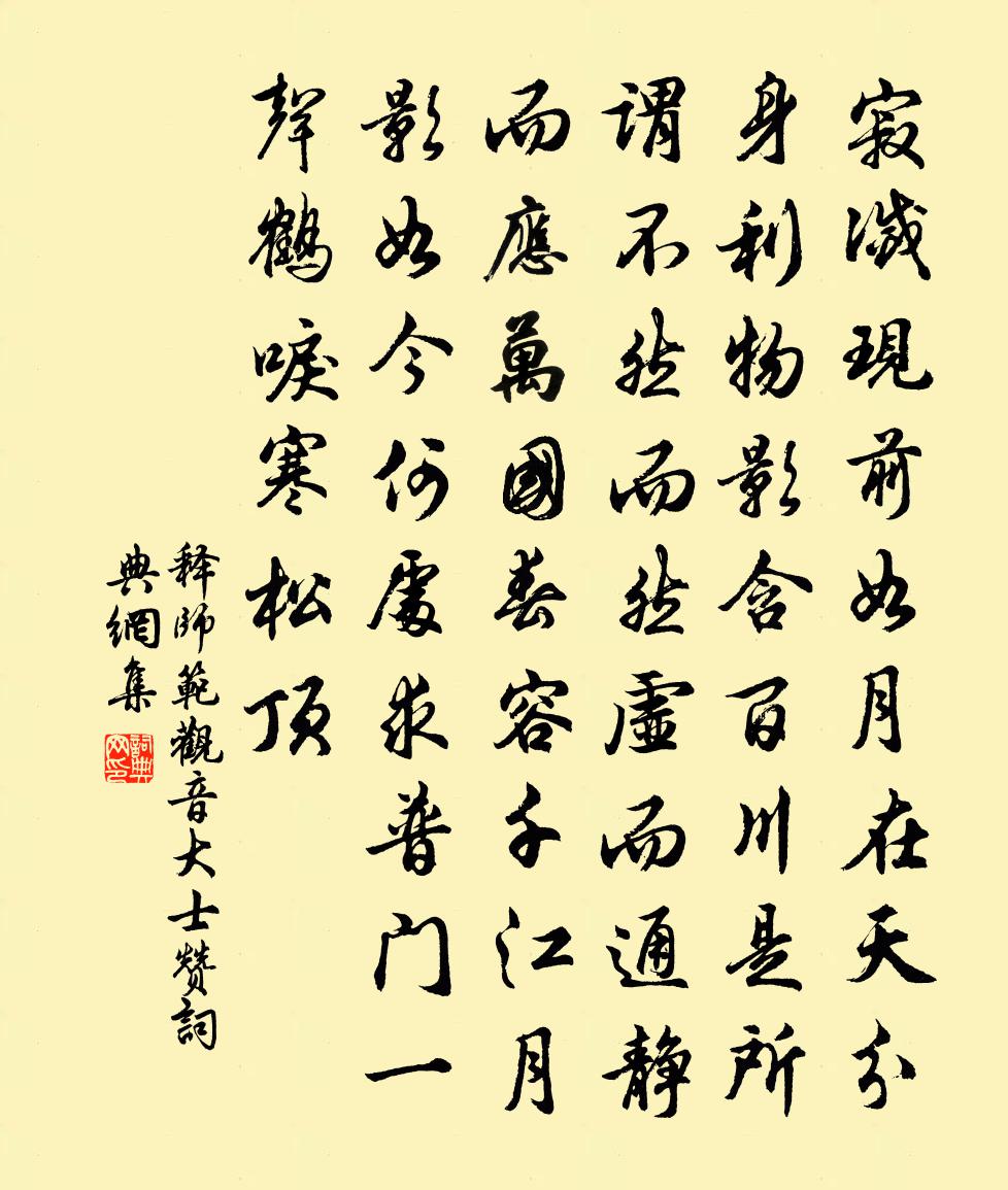 詩詞名句歷史字典書法欣賞書法字典國語詞典說文解字康熙字典古漢語字典標 題 作 者 詩 句 觀音大士贊作者:釋師範 朝代:宋代觀音大士贊原文寂滅現前,如月在天。分身利物,影含百川。是所謂不然而然,虛而通,靜而應。萬國春容,千江月影。如今何處求普門,一聲鶴唳寒松頂。詩詞問答問:觀音大士贊的作者是誰?答:釋師範問:觀音大士贊寫於哪個朝代?答:宋代釋師範觀音大士贊書法欣賞觀音大士贊書法作品詩詞推薦卜運算元·萬里籋浮雲辛棄疾〔宋代〕萬里籋浮雲,一噴空凡馬。嘆息曹瞞老驥詩,伏櫪如公者。山鳥哢窺檐,野鼠飢翻瓦。老我痴頑合住山,此地菟裘何同年書院范成大〔宋代〕竹色侵晚帙,泉聲漱嵌根。試通丹灶路,應到老人村。為陸元德題擅謙齋方回〔宋代〕四體非槁木,焉得常無為。下士蔑軌則,德人慎容儀。屈伸一時間,良復關安危。舉手一不當,尚難令童兒。橫目立春帖子太上皇帝閣周必大〔宋代〕殿閣無為日,朝廷有道時。椒淳重醞酒,花發萬年枝。八月十王日夜寄友人司馬光〔宋代〕故人音信絕,對月動相思。清露滴紅葉,此懷當告誰。秋風廣陵郭,正是望濤時。江邊柳雍裕之〔唐代〕裊裊古堤邊,青青一樹煙。若為絲不斷,留取系郎船。送秋谷蘭上人釋行海〔宋代〕春來我亦夢家林,萬水千山不可尋。白雪易侵游於鬢,黃金難買故人心。夜船搖月平河穩,曉嶺登雲古樹深。湖上道號毒果釋法薰〔宋代〕鐵樹花開半夜間,枝頭結個子團團。古今藥 * 無數,不信教伊咬破看。訪李延不值真山民〔宋代〕白雲滿空山,山空不未歸。拄杖莫敲門,恐驚白雲飛。古意武元衡〔唐代〕蜀國春與秋,岷江朝夕流。長波東接海,萬里至揚州。開門面淮甸,楚俗饒歡宴。舞榭黃金梯,歌樓白雲面。盪子宿濟州西門外旅館晁端友〔宋代〕寒林殘日欲棲烏,壁里青燈乍有無。小雨愔愔人假寐,臥聽疲馬齧殘芻。送王道粹學士知亳州梅堯臣〔宋代〕古者二千石,高車駕青驪。車前陳曲蓋,車後建朱旗。金鼓鳴兩傍,壺漿擁通逵。所以重威惠,所仰撫惸嫠。景亳太尉鎮洮軍節度使同知樞密院事種公佚名〔宋代〕壯哉此翁,謀深氣勁。終始一節,佑我三聖。百戰之餘,所料必勝。提師入援,敵讋威令。疊盡良策,眾莫之跌。狹斜趙崇鉘〔宋代〕吳姬凌寒吹玉笛,手強誤作遲遲聲。卻來拋眼調行客,中有二月東風情。東風二月楊花滿,伯勞朝啼芳思亂。狹斜和孫少述侯職方同燕席曾鞏〔宋代〕兩翁頭白喜追陪,好事鈴齋燕席開。臘在未消盈尺雪,春歸先放一枝梅。況無庭下書投缿,更盡筵中酒滿杯。周召次韻李太博書羽扇亭二首釋寶曇〔宋代〕不許屏間著妓圍,卻容半坐對斜暉。官餘戰馬渾無用,雨扼邊雲故一揮。詩入邛崍應更險,身如杜宇肯忘歸。殷勤雜曲歌辭。東飛伯勞歌李嶠〔唐代〕傳書青鳥迎簫鳳,巫嶺荊台數通夢。誰家窈窕住園樓,五馬千金照陌頭。羅裙玉佩當軒出,點翠施紅競春日。佳人領解後謝主司唐寅〔明代〕壯心未宜逐樵漁,泰運鹹思備掃除。劍責百金方折閱,玉遭三黜忽沽諸。紅綾敢望明年餅,黃絹深慚此日書。三策送人歸昌州釋了惠〔宋代〕見說家山富海棠,杜陵才短沒篇章。煩君開口道一句,攛掇教他分外香。菩薩蠻·風柔日薄春猶早李清照〔宋代〕風柔日薄春猶早,夾衫乍著心情好。睡起覺微寒,梅花鬢上殘。故鄉何處是?忘了除非醉。瀋水臥時燒,香消酒未名句推薦猶記得、當年深隱,門掩兩三株。張炎《渡江雲·山陰久客一再逢春回憶西杭渺然愁思》 牛困人飢日已高,市南門外泥中歇。白居易《賣炭翁》 荷芰風輕簾幕香,繡衣鸂鶒泳回塘,小屏閒掩舊瀟湘。顧敻《浣溪沙·荷芰風輕簾幕香》 養不教,父之過。教不嚴,師之惰。王應麟《三字經·全文》 紫菊氣,飄庭戶,晚煙籠細雨。李煜《謝新恩·冉冉秋光留不住》 喧啾百鳥群,忽見孤鳳凰。韓愈《聽穎師彈琴》 我欲穿花尋路,直入白雲深處,浩氣展虹霓。黃庭堅《水調歌頭·遊覽》 上有所欲,其神若親,禮下勿辭,拒者無助矣。來俊臣《羅織經·治下卷第三》 本是同根生,相煎何太急?曹植《七步詩》 不辭山路遠,踏雪也相過。張九齡《答陸澧》