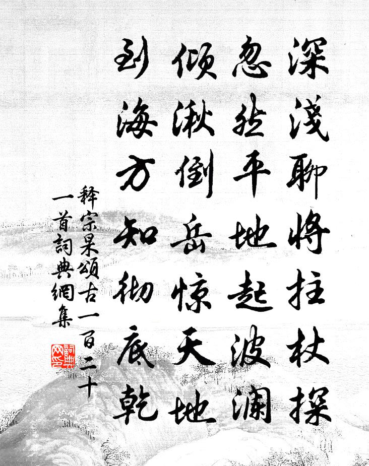 詩詞名句歷史字典書法欣賞書法字典國語詞典說文解字康熙字典古漢語字典標 題 作 者 詩 句 頌古一百二十一首作者:釋宗杲 朝代:宋代頌古一百二十一首原文深淺聊將拄杖探,忽然平地起波瀾。傾湫倒岳驚天地,到海方知徹底乾。詩詞問答問:頌古一百二十一首的作者是誰?答:釋宗杲問:頌古一百二十一首寫於哪個朝代?答:宋代釋宗杲頌古一百二十一首書法欣賞頌古一百二十一首書法作品詩詞推薦蕭山望城中遺胡仲參〔宋代〕見說天文變,頻占太史台。但云星犯月,不料火為災。盡夜看煙滅,逢人問訊來。丹心勤戀闕,東向極裴回。衡陽贈定父詠常利登〔宋代〕半世擇交友,深知僅數人。情親無語忌,歲久轉心真。世亂身難定,話長天易晨。相逢無不料,一笑雁峰春。清溪江令公宅羅隱〔唐代〕蠻箋象管夜深時,曾賦陳宮第一詩。宴罷風流人不見,廢來蹤跡草應知。鶯憐勝事啼空巷,蝶戀餘香舞好枝。還有恭和御製聞喜宴詩劉克莊〔宋代〕□□□□□□冠,聖世君師自鑄顏。海運而南六月息,辰居於北眾星環。宴開鎬邑昇平際,樂奏鈞天縹緲間。慚愧枕上同志賦虞儔〔宋代〕折桂東堂又一回,秋花此外只凡才。千岩萬壑幽深處,玉露金風爛漫開。有客揮犀紛入坐,幾時清燕小持杯。作詩和王衢見寄魏野〔宋代〕久向東郊住,漸同麋鹿情。游山岐路熟,見客禮儀生。藜杖新仍重,荷衣破轉輕。身猶為外物,詩亦是虛名。自愛明招雜詩四首呂祖謙〔宋代〕風檐裊茶煙,銅瓶語相泣。清陰一疎箔,不礙飛花入。和樊使君登潤州城樓劉長卿〔唐代〕山城迢遞敞高樓,露冕吹鐃居上頭。春草連天隨北望,夕陽浮水共東流。江田漠漠全吳地,野樹蒼蒼故蔣州。王粲病孔雀皮日休〔唐代〕煙花雖媚思沈冥,猶自抬頭護翠翎。強聽紫簫如欲舞,困眠紅樹似依屏。因思桂蠹傷肌骨,為憶松鵝損性靈。盡日萬景樓三首用韻孫應時〔宋代〕皛皛三江水,岧岧百尺樓。雲山接南訓,風景冠西州。徙倚乾坤大,徘徊歲月流。明朝悵回首,湖海一歸舟。示黃岡長老二絕胡寅〔宋代〕歸興逢山便解頤,上人多思乞留詩。千若萬壑經行處,他日煩師覓舊題。偈頌一百三十六首釋惟一〔宋代〕萬法本無,一心何有。絕慮忘緣,默默自守。償能朝於斯夕於斯,自然虛而靈空而妙。正當恁么時,我手何似佛手漁父四時曲春趙汝鐩〔宋代〕霽江浮春新水肥,粼粼鴨綠東風微。波心上下舴艋滑,釣車香餌卷落暉。纖鱗噞喁錦穿柳,半留賣錢半換酒。爛醉哭士特二首劉子翬〔宋代〕自古才難得,斯人又早亡。青蠅頻去國。白首嘆為郎。不睹遺書奏,徒懷掛劍傷。楚魂招不得,南斗夜無光。再用韻趙汝騰〔宋代〕天生神醴地生材,曾感當年鸑鷟來。釣水取清芳酷烈,采山可茹味徘徊。能招霞侶雲中笑,得奉龍顏食後杯。細品軍中雜歌陸游〔宋代〕北面行台號令新,繡旗豹尾渡河津。檄書才下降書至,不用兒郎打女真。題兩橋趙崇璉〔宋代〕一溪夾道枕流水,上有兩橋橫絕流。烏鵲互飛銀漢夜,彩虹交映玉潭秋。東西雨過苔痕潤,左右晴分浪影收。誰是木香花張舜民〔宋代〕廣寒宮闕月樓台,露里移根月里栽。品格雖同香氣俗,如何卻共牡丹開。山城秋日野望感事書懷詩五章呈吳龍圖文同〔宋代〕原隰蕭條草木衰,倚風渾類楚人悲。便成孤憤終何事,且寄遙懷對此時。千里暝陰雲杳靄,一川寒影雁參差。登臨對月再用韻鄭剛中〔宋代〕團團滿庭月,冷侵華相重。何人萬里外,與此孤光共。摩雲度片鴻,天闊目難送。三杯見妙理,一靜服群動。陶然名句推薦黃鸝驚夢破,青鳥喚春還。張弘范《臨江仙·憶舊》 勸我早還家,綠窗人似花。韋莊《菩薩蠻·紅樓別夜堪惆悵》 年年雪裡。常插梅花醉。李清照《清平樂·年年雪裡》 望征路愁迷,離緒難整陸叡《瑞鶴仙梅》 雖有戈矛之刺,不如恭儉之利也。荀子《荀子·榮辱》 舟覆乃見善游,馬奔乃見良御。劉安及其門客《淮南子·說林訓》 闌乾風冷雪漫漫,惆悵無人把釣竿。姜夔《釣雪亭》 聖人苟可以強國,不法其故;苟可以利民,不循其禮。商鞅《商君書·更法》 櫚庭多落葉,慨然知已秋。陶淵明《酬劉柴桑》 山泉散漫繞階流,萬樹桃花映小樓。元稹《離思五首》