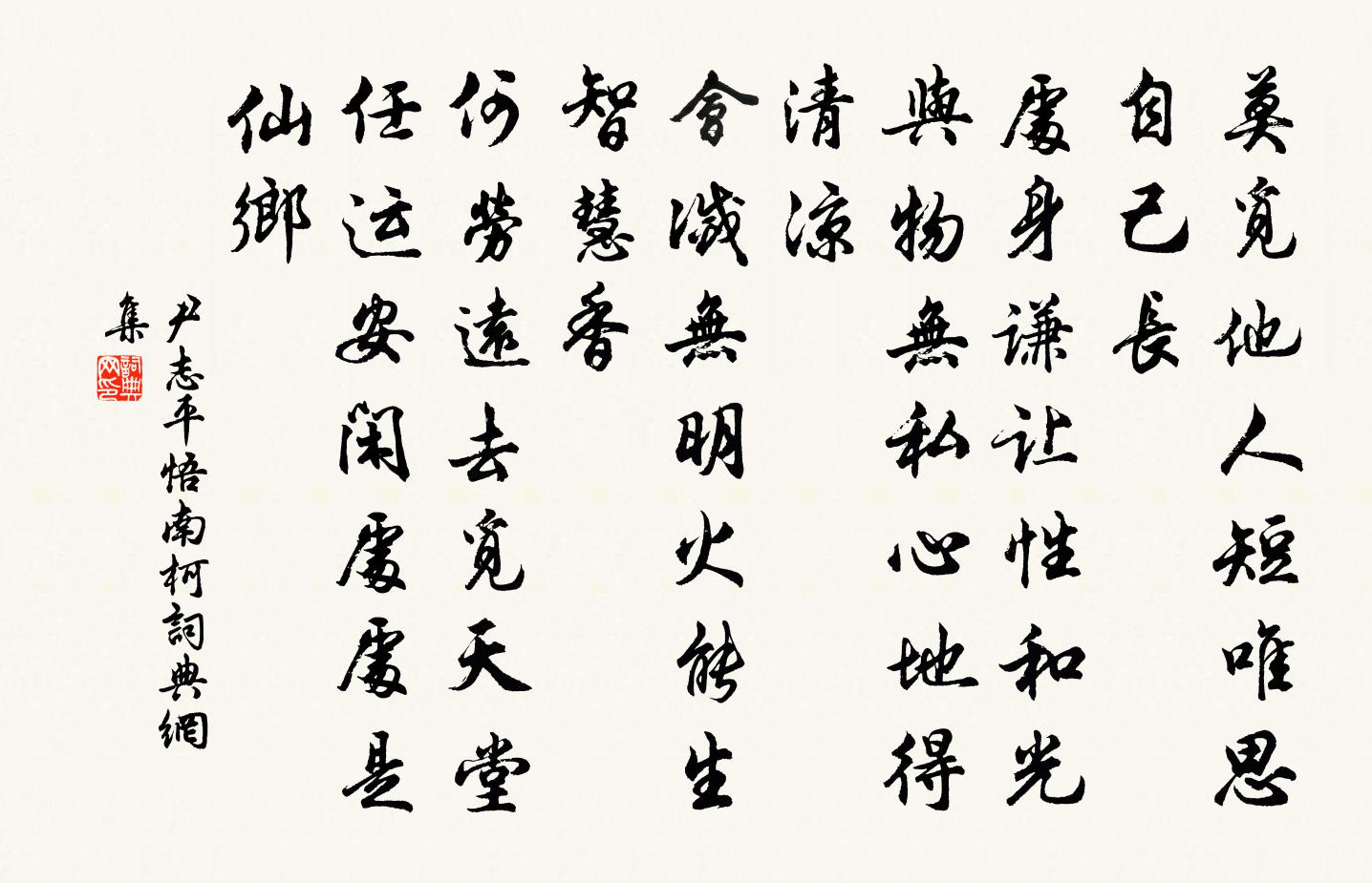 詩詞名句歷史字典書法欣賞書法字典國語詞典說文解字康熙字典古漢語字典標 題 作 者 詩 句 悟南柯作者:尹志平 朝代:元代悟南柯原文莫覓他人短,唯思自己長。處身謙讓性和光。與物無私,心地得清涼。會滅無明火,能生智慧香。何勞遠去覓天堂。任運安閒,處處是仙鄉。詩詞問答問:悟南柯的作者是誰?答:尹志平問:悟南柯寫於哪個朝代?答:元代問:悟南柯是什麼體裁?答:詞尹志平悟南柯書法欣賞悟南柯書法作品詩詞推薦秦門。趙高周曇〔唐代〕趙高胡亥速天誅,率土興兵怨毒痡。豐沛見機群小吏,功成兒戲亦何殊。周元特詹事輓詞二首韓元吉〔宋代〕道學尊閭里,衣冠見偉人。雞群真野鶴,麕角目祥麟。讜論追前輩,清時識諍臣。他年激貧懦,風動霅溪濱。元祐六年六月自杭州召還汶公館我於東堂閱舊蘇軾〔宋代〕半熟黃粱日未斜,玉堂陰合手栽花。卻尋三十年前味,未飯鍾時已飯茶。夢覺還驚屟響廊,故人來炷影前香。鬢髮儒生墓王齊輿〔宋代〕儒生骨朽名猶在,高冢相望已亂真。只認夜深螢聚處,便應泉下讀書人。馬嵬崔道融〔唐代〕萬乘淒涼蜀路歸,眼前朱翠與心違。重華不是風流主,湘水猶傳泣二妃。臘雪二首袁說友〔宋代〕歲事無多臘近殘,謝渠飛屑破天慳。褥祠空愧兼旬力,造物惟消一夜間。是則化工端有意,要於官政亦相關。雪催跋周忘機畫一首劉克莊〔宋代〕周郎詞藝妙天下,似是詩家非畫家。寧與嵇公寫琴操,不為盛尹作梅花。次韻答陣夢錫十首陳造〔宋代〕古人存心屹底柱,卷舒晦明付時行。蕞爾之身函天地,政可蠛蠓睨功名。讀金鑾密記劉克莊〔宋代〕仗下千官走似麇,倉皇誰扈屬車塵。禁中陸九艱危共,殿上朱三苦死嗔。當日橫身抗岐汴,暮年避地客甌閩。小窗聞沈元用帥南海喜而有作張九成〔宋代〕與公相別五經年,憂患流離理固然。悵望故園江渚外,還驚橫浦瘴煙邊。喜聞金節專南海,行看鋒車上九天。顧我石灰吟于謙〔明代〕千錘萬鑿出深山,烈火焚燒若等閒。粉身碎骨全不怕,要留清白在人間。(一作:千錘萬擊出深山 / 千鎚萬擊端明殿學士汪公輓詞樓鑰〔宋代〕蚤歲聲名大,婆娑始遇時。難兄屏隔坐,令子桂芳枝。人望還為用,天胡不憗遺。成蹊堪喻大,墮淚不須碑。阮郎歸秦觀〔宋代〕褪花新綠漸團枝。撲人風絮飛。鞦韆未拆水平堤。落紅成地衣。游蝶困,乳鶯啼。怨春春怎知。日長早被酒禁持。病中雜興高登〔宋代〕溶溶瘴霧暗朝暾,咫尺山關號鬼門。疾病年年不相貸,朱顏凋盡赤心存。代仍六弟吊程貢元許月卿〔宋代〕少從諸父與君游,到眼銘章淚莫收。水闊騎鯨霜葉落,波寒躍鯉雪蘋秋。當時折桂浮雲夢,今日叢萱暮靄愁。惆悵水調歌頭李好古〔宋代〕歷歷江南樹,半在水雲間。不須回首,且來著眼向淮山。過盡金山暈碧,望斷焦山空翠,楊柳繞江邊。此意無人會問嚴居士易戴叔倫〔唐代〕自公來問易,不復待加年。更有垂簾會,遙知續草玄。晚泊松滋渡口陸游〔宋代〕此行何處不艱難,寸寸強弓且旋彎。縣近歡欣初得菜,江回徙倚忽逢山。繫船日落松滋渡,跋馬雲埋灩澦關。未滿一斛珠蘇軾〔宋代〕洛城春晚。垂楊亂掩紅樓半。小池輕浪紋如篆。燭下花前,曾醉離歌宴。自惜風流雲雨散。關山有限情無限。待君師仁再用韻復作一首李流謙〔宋代〕室中元自有天游,海內如何止九州。送老只憑書萬卷,傳家不用橘千頭。便當野服從逋客,未暇巍冠伴沐猴。一動名句推薦曲則全,枉則直,窪則盈,敝則新,少則得,多則惑。老子《老子·道經·第二十二章》 君看石芒碭,掩淚悲千古李白《丁督護歌》 吹燈窗更明,月照一天雪。袁枚《十二月十五夜》 攀出牆朵朵花,折臨路枝枝柳。關漢卿《一枝花·不伏老》 無計奈情何,且醉金杯酒。晏幾道《生查子·輕勻兩臉花》 當年志氣俱消盡,白髮新添四五莖。薛逢《長安夜雨》 故國三千里,深宮二十年。張祜《宮詞·故國三千里》 怪見溪童出門望,雀聲先我到山家。劉因《山家·馬蹄踏水亂明霞》 離愁漸遠漸無窮,迢迢不斷如春水。歐陽修《踏莎行·候館梅殘》 日出入安窮?時世不與人同。佚名《日出入》