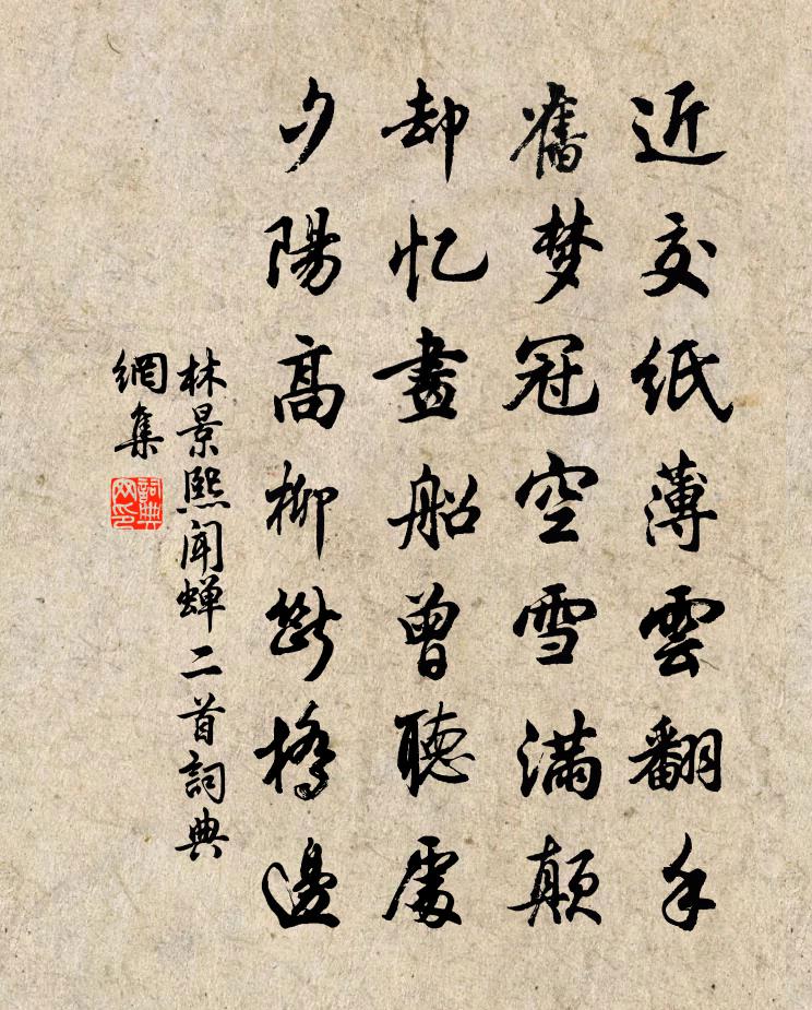 詩詞名句歷史字典書法欣賞書法字典國語詞典說文解字康熙字典古漢語字典標 題 作 者 詩 句 聞蟬二首作者:林景熙 朝代:宋代聞蟬二首原文近交紙薄雲翻手,舊夢冠空雪滿顛。卻憶畫船曾聽處,夕陽高柳斷橋邊。詩詞問答問:聞蟬二首的作者是誰?答:林景熙問:聞蟬二首寫於哪個朝代?答:宋代林景熙聞蟬二首書法欣賞聞蟬二首書法作品詩詞推薦喜客泉次韻馮去非〔宋代〕白雲在空山,丹光照崖水。仙人跡如埽,客至泉輒喜。世路多不平,箇中太清生。政以靜自怡,亦與凡將迎。風波竹徑汪炎昶〔宋代〕竹徑清入內,消得此閒行。不待鋤蒼蘚,頻來逕自成。次韻朱塘三首許月卿〔宋代〕杏壇黃葉滿霖林,何幸朱塘兀古枌。試上月台因問月,知涵雲谷幾多雲。夢遊當日成何事,嗜學於今喜舊聞。我意奉和中書崔舍人八月十五日夜玩月二十韻劉禹錫〔唐代〕暮景中秋爽,陰靈既望圓。浮精離碧海,分照接虞淵。迥見孤輪出,高從倚蓋旋。二儀含皎澈,萬象共澄鮮。整御庭松白居易〔唐代〕堂下何所有,十松當我階。亂立無行次,高下亦不齊。 高者三丈長,下者十尺低。有如野生物,不知何人栽。 偕章宰勸農房山陳造〔宋代〕登臨一氦豁心胸,著我松窗竹屋中。宛是官曹縛雕虎,不容塵眼到飛鴻。綿延天際應平碧,孤負林梢抹嫩紅。挽仰和韻送方翔仲赴省項安世〔宋代〕無問其津問其備,秦牘於今祖誰作。三年戌卒箭痍深,長夜破膽鐎花音。文皇不共□□□,三五須從賣生說。曲江寶鼎現(壽范著林)陳著〔宋代〕著林仙叟,夢境炊得,才香還覺。回首渺,觚稜何處,雲與商量浮計小。矮矮屋、半弓來閒地,也著三花兩草。沸採石渡王景月〔宋代〕興亡懷此渡,貫酒易為醺。數樹松青處,千年李白墳。曉山看夜雪,淮甸沒江雲。牛渚磯邊過,驚濤不可聞。六朝舊跡李時可〔宋代〕六朝更代幾興亡,滿地黃花只舊香。水鳥不知人事改,雙飛猶自戀寒塘。贈同官蘇明府李頻〔唐代〕山中畿內邑,別覺大夫清。簿領分王事,官資寄野情。閒齋無獄訟,隱几向泉聲。從此朝天路,門前是去程。綿樓薛能〔唐代〕溪邊人浣紗,樓下海棠花。極望雖懷土,多情擬置家。前山應象外,此地已天涯。未有銷憂賦,梁王禮欲奢。試院唱酬十一首其三次韻呂君見贈蘇轍〔宋代〕偶然傾蓋接清言,不覺門前晝漏傳。老病低摧方伏櫪,壯心堅銳正當年。莫嫌客舍一杯酒,試論灊山三祖禪。明日憂旱章甫〔宋代〕貧賤甘羈旅,淹留賴薄田。悠悠將送老,比比不逢年。旱魃工為虐,雷公豈易鞭。醉能忘萬事,安得酒如川。寓居有感三首司空圖〔唐代〕亦知世路薄忠貞,不忍殘年負聖明。只待東封沾慶賜,碑陰別刻老臣名。不放殘年卻到家,銜杯懶更問生涯。河堤酬同年徐正夫司戶時欲卜築嵩洛間張耒〔宋代〕少別老相見,無言空惘然。功名屬多病,詩酒樂衰年。釜厭顏公粥,囊須趙壹錢。歸裝何日辦,嵩少好林泉。登樓有感倪龍輔〔宋代〕好趁西風理釣舟,半生書劍兩悠悠。憑高有恨無人識,空負關河萬里秋。去婦孟郊〔唐代〕君心匣中鏡,一破不復全。妾心藕中絲,雖斷猶牽連。安知御輪士,今日翻回轅。一女事一夫,安可再移天。君聽賣花聲(憶舊)黃升〔宋代〕秋色滿層霄,剪剪寒飆。一襟殘照兩無聊。數盡歸鴉人不見,落木蕭蕭。往事欲魂消。夢想風標。春江綠漲水平橋春雪阻觀梅花兩詩嘲之張鎡〔宋代〕雨聲俄混雪聲乾,混濘林堂一到難。藉使玉肌無凍粟,可能獨自過春寒。名句推薦一晌凝情無語,手捻梅花何處。王之道《如夢令·一晌凝情無語》 東風惡,歡情薄。陸游《釵頭鳳·紅酥手》 無限春風來海上。便與春工。染得桃紅似肉紅。蘇軾《減字木蘭花·立春》 萬里浮雲卷碧山,青天中道流孤月。李白《答王十二寒夜獨酌有懷》 輕解羅裳,獨上蘭舟。李清照《一剪梅·紅藕香殘玉簟秋》 老來多健忘,唯不忘相思。白居易《偶作寄朗之》 常隨寶鐙陪金勒,絕塞指揮萬馬嘶。俞益謨《中洲株柳》 欲吊沉累無所,但有漁兒樵子,哀此寫離憂。張孝祥《水調歌頭·過岳陽樓作》 此地朝來餞行者,翻向此中牧征馬。孟浩然《高陽池送朱二》 寒來暑往,秋收冬藏。周興嗣《千字文·全文》