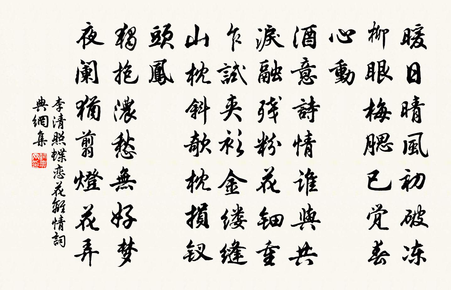 “暖雨晴風初破凍”點出時為景色宜人後初春。緊承破題的“柳眼梅腮”,也可以稱得上“易安奇句”,此句意蘊豐富,一語雙關,既補充起句的景語,又極為簡練地刻畫出了一個思婦的形象。正是這個姣好的形象,被離愁折磨得坐臥不安如痴如迷。