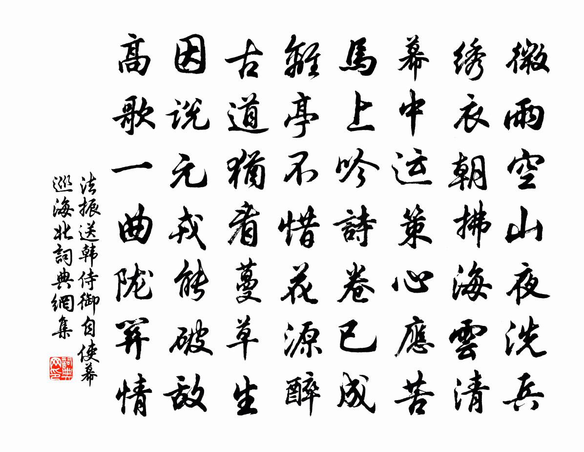 詩詞名句歷史字典書法欣賞書法字典國語詞典說文解字康熙字典古漢語字典標 題 作 者 詩 句 送韓侍御自使幕巡海北作者:法振 朝代:唐代送韓侍御自使幕巡海北原文微雨空山夜洗兵,繡衣朝拂海雲清。幕中運策心應苦,馬上吟詩卷已成。離亭不惜花源醉,古道猶看蔓草生。因說元戎能破敵,高歌一曲隴關情。詩詞問答問:送韓侍御自使幕巡海北的作者是誰?答:法振問:送韓侍御自使幕巡海北寫於哪個朝代?答:唐代問:送韓侍御自使幕巡海北是什麼體裁?答:七律法振送韓侍御自使幕巡海北書法欣賞送韓侍御自使幕巡海北書法作品注釋全唐詩:卷811-23詩詞推薦奉復魯齋先生上蔡書院圖詩二首金履祥〔宋代〕臨海關東水滿湖。書堂新上赤城圖。地居郊左宜芹藻,天錫奎章示楷模。王謝後前傳正印,東南鄒魯定同符。誰終蜀江晁公溯〔宋代〕蜀江楚硤郁巉岩,雲霧中兼草木參。飛鶻{備飛}空投霽野,游魚跳水亂澄潭。朝廷共仰辰之北,羈旅長留斗以南枕上和圓機絕句梅花十有四首晁說之〔宋代〕負雪披霜不得依,梅寒恨不出豳詩。身梁根治荒江介,情調猶輸第一辭。晚過彥真山亭並呈允升季儀兼屬照鄰二首趙蕃〔宋代〕隔岸看山自足佳,背山仍有碧雲遮。我來政值崚嶒際,卻恨林端已暮鴉。挽黃助教四首舒邦佐〔宋代〕春歸平日館池中,想是園花三四紅。還有舊時王謝燕,喃喃來吊主人翁。被旨趣行和計院兄韻劉克莊〔宋代〕李邕眉宇誤人看,敢□□□□□乾。此去□□□□□,向來上雍從和鑾。□□□□如前夢,烏不相尋待歲寒。臨□山中吟三首錢時〔宋代〕一毫頭許便爭衡,蠻觸尋兵決死生。山隱等閒收至寶,卻無人共老夫爭。子文大丞重午日走貺煮酒,清甚,殆與遠水一范成大〔宋代〕臘腳清若空,吾聞其語矣。今晨品義尊,公酒正如此。太常家有此段奇,銷得不齋醉如泥。但恨今無遏雲曲,送我舟至湖心,望豫章西山雲起,風雨驟至楊萬里〔宋代〕橫洲送我忽俱還,四顧無邊已慘顏。雪浪撞天吞几子,拋雲將雨起西山。一聲霹靂從空下,萬丈金蛇掣斗間。舟子雙溪道中陸游〔宋代〕曉出筰橋門,天低日未暾。綠陂寒淡淡,白霧遠昏昏。古路亂車轍,行人驚雁群。征塗不須厭,蓬轉本無根。久不得浙耗黃公度〔宋代〕獨酌澆愁酒,慵翻信手書。折腰行俗吏,投足且吾廬。歲月鶯聲老,江湖雁影疏。依棲五侯第,旅食近何如。自溝河乃舊日南北分界之地羅公升〔宋代〕萬里封疆到白溝,祖宗猶擬復幽州。他年海島無歸處,誰解捐軀為國謀。春日寄陳舍人夏竦〔宋代〕濃淡晴霞泛夕陽,重重煙藹護流芳。花殘遠渡曉風急,路入層雲春夢長。結蕙翠光留蝶舞,含桃紅實駐鶯嘗。可憐和文與可洋州園亭三十詠其五竹塢蘇轍〔宋代〕空陂放修竹,肅肅復冥冥。莫除塢外筍,從使入園生。和陶飲酒二十首蘇軾〔宋代〕晁子天麒麟,結交未及仕。高才固難及,雅志或類已。各懷伯業能,共有丘明恥。歌呼時就君,指我醉鄉里。吳公和王龜齡待制貢院落成二首吳芾〔宋代〕扁舟猶記拂洲苹,轉眼年華幾度新。愧我今年雙白鬢,喜君來駕兩朱輪。一時令不從如水,千里威行敬若神。擬訪【雙調】沉醉東風 息齋畫竹徐再思〔元代〕葛陂里神龍蛻形,丹山中彩鳳棲庭。風吹粉籜香,雨洗蒼苔冷,老仙翁筆底春生。明月闌乾酒半醒,對一片兒瀟湘次韻胡少瀹題梁王山蟠松詩劉倓〔宋代〕長松上捎日月宮,昂霄聳壑材甚雄。不肯甘心臥雲巘,有時見夢十八公。汗顏血指,那知大匠自有體。斬伐丁丁,寄貝勉齋馮桂坡陳著〔宋代〕美人隔江水,相思江水深。江水日夜流,泛我東去心。春風百花老,把酒別草草。邂逅未可期,梅杏黃已飽。郊廟歌辭。漢宗廟樂舞辭。章慶舞佚名〔唐代〕罘罳曉唱雞人,三牲八簋斯陳。霧集瑤階瑣闥,香生綺席華茵。珠佩貂璫熠爚,羽旄乾戚紛綸。酌鬯既終三獻,凝名句推薦知足者富。強行者有志。不失其所者久。老子《老子·道經·第三十三章》 救寒莫如重裘,止謗莫如自修。司馬光《資治通鑑·魏紀五》 幸遇三杯酒好,況逢一朵花新。朱敦儒《西江月·世事短如春夢》 明月皎皎照我床,星漢西流夜未央。曹丕《燕歌行二首·其一》 黃河水繞漢宮牆,河上秋風雁幾行。李夢陽《秋望》 飛絮飛花何處是,層冰積雪摧殘,疏疏一樹五更寒。納蘭性德《臨江仙·寒柳》 樂民之樂者,民亦樂其樂。孟子《孟子·梁惠王章句下·第四節》 罩向金籠好羽儀,分明喉舌似君稀僧定渚《詠鸚鵡》 誰知道,斷煙禁夜,滿城似愁風雨劉辰翁《永遇樂·璧月初晴》 數樹梨花,晚風吹墮半汀鷺。吳文英《齊天樂·新煙初試花如夢》