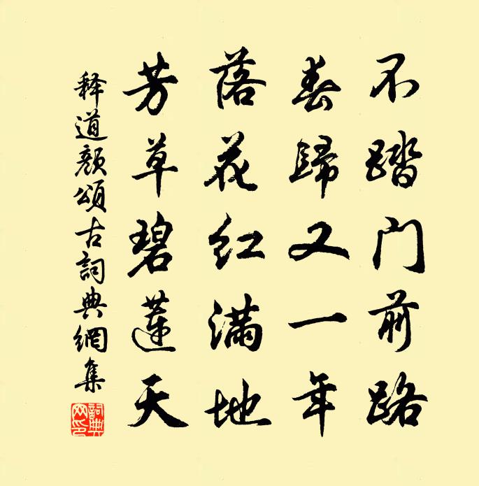 詩詞名句歷史字典書法欣賞書法字典國語詞典說文解字康熙字典古漢語字典標 題 作 者 詩 句 頌古作者:釋道顏 朝代:宋代頌古原文不踏門前路,春歸又一年。落花紅滿地,芳草碧蓮天。詩詞問答問:頌古的作者是誰?答:釋道顏問:頌古寫於哪個朝代?答:宋代釋道顏頌古書法欣賞頌古書法作品詩詞推薦過無錫寄沈知縣項安世〔宋代〕同時月殿氣如虹,各自天涯影似蓬。半世弟兄才一識,二年州縣忽重逢。湘山飽聽靈妃瑟,錫水新彈單父桐。剩有新秦遣懷張詠〔宋代〕貂褐久從戎,因令筆硯慵。梳中見白髮,枕上憶孤峰。風動沙昏晝,寒多雪折松。此心無與問,長願酒盈鍾。句翁綬〔唐代〕海國歐鄉浙水東,暫煩良守此憑熊。北征杜甫〔唐代〕北歸至鳳翔,墨制放往鄜州作。皇帝二載秋,閏八月初吉。杜子將北征,蒼茫問家室。維時遭艱虞,朝野少暇日。謝答吳侍郎惠茶二絕句宋庠〔宋代〕貢焙僧岩各有名,手封奇品更丁寧。衰瓮劇飲雖無分,且喜雲腴伴獨醒。寄題明月禪院二首釋贊寧〔宋代〕參差峰岫晝雲昏,入望交蘿濁浪奔。震澤涌山來北岸,華陽連洞到東門。日生樹掛紅霞腳,風起波搖白石根。聞有送陸判官歸杭州皎然〔唐代〕芳草潛州路,乘軺憶再旋。余花故林下,殘月舊池邊。峰色雲端寺,潮聲海上天。明朝富春渚,應見謝公船。金盞倒垂蓮(牡丹)曹勛〔宋代〕穀雨初晴,對曉霞乍斂,暖風凝露。翠雲低映,捧花王留住。滿闌嫩紅貴紫,道盡得、韶光分付。禁篽浩蕩,天香後雜興陸游〔宋代〕日上明我窗,月出縞我庭。朝暮得佳時,一榼醉復醒。鳳棲梧(小石調)張先〔宋代〕密宴厭厭池館暮。天漢沈沈,借得春光住。紅翠斗為長袖舞。香檀拍過驚鴻翥。明日不知花在否。今夜圓蟾,後夜殘句:便令脫帽管城公黃庭堅〔宋代〕便令脫帽管城公,小試玉堂揮翰手。山居雜詩九十首曹勛〔宋代〕休宮伏畎畝,農事未歷覽。年豐則知喜,歲歉頗不鑒。螟蜮則曰蠖,不實乃名冇。生民惰與勤,天災未嘗濫。東齋雜書陸游〔宋代〕門低不通車,室隘劣容膝。掩脛無全衣,作字用挫筆。親朋孰可望,門內自相恤。一笑語吾兒,汝馭未須叱。梁天機約重陽見訪而汪正夫簡報書齋叢菊輒有鄭獬〔宋代〕簡報叢菊生小蕊,枝頭應似撥冰醅。故人有信來相訪,好祝秋風及早開。谷口書齋寄楊補闕錢起〔唐代〕泉壑帶茅茨,雲霞生薜帷。竹憐新雨後,山愛夕陽時。閒鷺棲常早,秋花落更遲。家童掃蘿徑,昨與故人期。宿香山寺酬廣陵牛相公見寄白居易〔唐代〕手札八行詩一篇,無由相見但依然。君匡聖主方行道,我事空王正坐禪。支許徒思游白月,夔龍未放下青天。應須奉和襲美太湖詩二十首銷夏灣陸龜蒙〔唐代〕霞島焰難泊,雲峰奇未收。蕭條千里灣,獨自清如秋。古岸過新雨,高蘿蔭橫流。遙風吹蒹葭,折處鳴颼颼。昔予詠狗蚤佚名〔唐代〕與虱都來不較多,zh挑筋斗太嘍羅。忽然管著一籃子,有甚心情那你何。偈二十二首釋子淳〔宋代〕危巒蕭酒古禪宮,信步重歸趣無窮。風卷白雲開界淨,一輪紅日正當空。成伯家宴造坐無由輒欲效顰而酒已盡入夜不欲蘇軾〔宋代〕道士令嚴難繼和,僧伽帽小卻空回。隔籬不喚鄰翁飲,抱瓮須防吏部來。名句推薦但願蒼生俱飽暖,不辭辛苦出山林。于謙《詠煤炭》 馬嘶芳草遠,高摟簾半掩。顧敻《醉公子·岸柳垂金線》 不知近水花先發,疑是經冬雪未銷。張謂《早梅》 不要人夸好顏色,只留清氣滿乾坤。王冕《墨梅》 望極春愁,黯黯生天際。柳永《蝶戀花·佇倚危樓風細細》 人生天地間,忽如遠行客。佚名《青青陵上柏》 知君慣度祁連城,豈能愁見輪台月。岑參《送李副使赴磧西官軍》 一寸相思一寸灰。蘇軾《南鄉子·集句》 應酬都不暇,一嶺是梅花。張道洽《嶺梅》 終古閒情歸落照,一春幽夢逐遊絲。納蘭性德《浣溪沙·楊柳千條送馬蹄》
