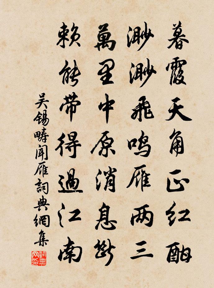 詩詞名句歷史字典書法欣賞書法字典國語詞典說文解字康熙字典古漢語字典標 題 作 者 詩 句 聞雁作者:吳錫疇 朝代:宋代聞雁原文暮霞天角正紅酣,渺渺飛鳴雁兩三。萬里中原訊息斷,賴能帶得過江南。詩詞問答問:聞雁的作者是誰?答:吳錫疇問:聞雁寫於哪個朝代?答:宋代吳錫疇聞雁書法欣賞聞雁書法作品詩詞推薦臨江仙王質〔宋代〕縹緲青宵雲一握,太清群玉光中。鈞天聲里拂香風。紫皇低接手,穩步上層空。雀扇徐開鸞影轉,日高舞動蛟龍。有感十首吳芾〔宋代〕延福池台荊棘深,上皇無復更登臨。寂寥崇觀當年事,愁絕關河萬里心。雜曲歌辭。陸州歌第一佚名〔唐代〕分野中峰變,陰晴眾壑殊。欲投人處宿,隔浦問樵夫。句邵博〔宋代〕平只道和戎功第一,不知上策在親征。一志胡仲弓〔宋代〕念頭才起處,此一常分明。其中有主帥,談笑驅五兵。霜天曉角(壽張古岩)劉辰翁〔宋代〕明年七十。歌彩橋仙夕。見說嚴君平道,年年是、月初一。同時同里密。後今今又昔。便做伏生年紀,也未到、蹇和癭杯梅堯臣〔宋代〕物以美好稱,或以醜惡用。美惡固無然,逢時乃亦共。棄則為所輕,用則為所重。道聞癭木器,愛賞互歌頌。定應松滋渡二首司空圖〔唐代〕步上短亭久,看回官渡船。江鄉宜晚霽,楚老語豐年。楚岫接鄉思,茫茫歸路迷。更堪斑竹驛,初聽鷓鴣啼。九日山拜姜相遺像胡仲弓〔宋代〕別駕元來是重臣,窮通不足累其身。直言悟主成遺恨,勁凶如公能幾人。泉瀉冢堂垂鶴淚,苔封碑石剝龍鱗。至今送張王臣趙蕃〔宋代〕邂逅高標識,漂流仁里依。君為鄂渚去,我亦鼎州歸。風月情何已,江湖便苦稀。政嗟書莫數,忽喜麈重揮。論事臨川洪守游南湖命予賦詩徐恢〔宋代〕芙蓉堂前春水綠,芙蓉堂後春花開。芙蓉堂中醉歌舞,芙蓉堂下車如雷。輕舟弄水買一笑,遊人競逐牆陰來。浪痕秋興夜飲陸游〔宋代〕成都書城中秋夜書長,燈籠書蠟紙明空書堂。高梧月白繞飛鵲,衰草露濕啼寒螿。堂上書生讀書罷,欲眠未眠偏斷雜詩四首曾鞏〔宋代〕皇皇謁荊人,伈伈遵陽虎。及覺一禮亡,翩然遂違魯。全身有遜接,直道無苟處。故稱聖如龍,屈伸茲可睹。閒居雜興十首薛嵎〔宋代〕秋蟲隨響滅,振羽不知疲。譬彼附炎士,寧思失勢時。垂竿動天象,煊策茹商芝。投分諒非淺,翻然弗可追。香菱詠月·其二曹雪芹〔清代〕非銀非水映窗寒,試看晴空護玉盤。淡淡梅花香欲染,絲絲柳帶露初乾。只疑殘粉塗金砌,恍若輕霜抹玉欄。夢醒蝶戀花(懷於湖)張孝祥〔宋代〕恰則杏花紅一樹。捻指來時,結子青無數。漠漠春陰纏柳絮。一天風雨將春去。春到家山須小住。芍藥櫻桃,更是理欲丘葵〔宋代〕理欲分明有兩途,何為捷徑世爭趨。豈愁今古無化論,長恨乾坤有腐儒。甘與徂為鬼怪,肯猶介甫接浮圖。從來逆漁家傲·天接雲濤連曉李清照〔宋代〕天接雲濤連曉霧,星河欲轉千帆舞;彷佛夢魂歸帝所,聞天語,殷勤問我歸何處。我報路長嗟日暮,學詩漫有驚人台城曲二首杜牧〔唐代〕整整復斜斜,隋旗簇晚沙。門外韓擒虎,樓頭張麗華。誰憐容足地,卻羨井中蛙。王頒兵勢急,鼓下坐蠻奴。瀲灩和卓英英錦城春望眉娘〔唐代〕蠶市初開處處春,九衢明艷起香塵。世間總有浮華事,爭及仙山出世人。名句推薦春無主!杜鵑啼處,淚灑胭脂雨陳子龍《點絳唇·春日風雨有感》 攜壺酌流霞,搴菊泛寒榮。李白《九日》 常山臨代郡,亭障繞黃河。王褒《渡河北》 江頭未是風波惡,別有人間行路難!辛棄疾《鷓鴣天·送人》 東風灑雨露,會入天地春。李白《送郄昂謫巴中》 彩舟載得離愁動。無端更借樵風送。賀鑄《菩薩蠻·彩舟載得離愁動》 勾引東風,也知芳思難禁。韓疁《高陽台·除夜》 一家之計在於和,一生之計在於勤。佚名《增廣賢文·上集》 言有招禍也,行有招辱也,君子慎其所立乎。荀子《荀子·勸學》 寒夜客來茶當酒,竹爐湯沸火初紅。杜耒《寒夜》