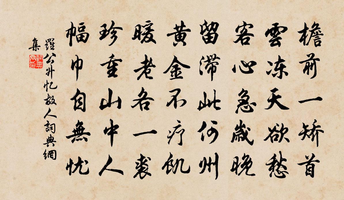 詩詞名句歷史字典書法欣賞書法字典國語詞典說文解字康熙字典古漢語字典標 題 作 者 詩 句 憶故人作者:羅公升 朝代:宋代憶故人原文檐前一矯首,雲凍天欲愁。客心急歲晚,留滯此何州。黃金不療飢,暖老各一裘。珍重山中人,幅巾自無憂。詩詞問答問:憶故人的作者是誰?答:羅公升問:憶故人寫於哪個朝代?答:宋代羅公升憶故人書法欣賞憶故人書法作品詩詞推薦句曾季貍〔宋代〕故人憐人貧,走送不待買。游烏石寺曾豐〔宋代〕縹緲崖懸屋,崢嶸{左木右央}亘天。我疑家玉帝,誰道宅金仙。鐘鼓風雷上,星辰燈火前。眼高胸次大,沙界眇奉和劉舍人初雪歐陽修〔宋代〕夜雪填空曉更飄,龍墀風冷佩聲高。瓊花落處縈仙仗,玉殿光中認赭袍。下直笑談多樂事,平時樽酒屬吾曹。羨君和襲美悼鶴陸龜蒙〔唐代〕酆都香稻字重思,遙想飛魂去未飢。爭奈野鴉無數健,黃昏來占舊棲枝。鷓鴣天(壽劉方明)王以寧〔宋代〕昔有書生薦壽杯。清詞妙絕賀方回。黃花也欲為君壽,先向重陽六日開。躋楚俗,上春台。政成歸去位三台。明年劉叔茂及第後往廣德拜親過吳江新治強至〔宋代〕今歲同升客,如君有幾人。青年登一第,白首具雙親。喜氣生軍壘,歡迎聚邑民。諸兄在天祿,勉去繼清塵。題周鯁臣浩齋楊萬里〔宋代〕浩翁曲肱一浩齋,焉吞廊廟與蒿萊。此翁定復死不死,舊齋又新有賢子。齋前種樹初如椽,如今過雲欲造天。作人擬寒山拾得二十首008王安石〔宋代〕幸身無事時,種種妄思量。張三喘口窄,李四帽檐長。失腳落地獄,將身投鑊湯。誰知受熱惱,卻不解思涼。木蘭花蘇庠〔宋代〕江雲疊疊遮鴛浦。江水無情流薄暮。歸帆初張葦邊風,客夢不禁篷背雨。渚花不解留人住。只作深愁無盡處。白沙清露被皋蘭孫顧〔唐代〕九皋蘭葉茂,八月露華清。稍與秋陰合,還將曉色並。向空羅細影,臨水泫微明。的皪添幽興,芊綿動遠情。夕芳題金山寺孫魴〔唐代〕萬古波心寺,金山名目新。天多剩得月,地少不生塵。過櫓妨僧定,驚濤濺佛身。誰言張處士,題後更無人。南呂四塊玉馬致遠〔元代〕雁北飛,人北望,拋閃煞明妃也漢君王。小單于把盞呀刺刺唱。青草畔有收酪牛,黑河邊有扇尾羊,他只是思故鄉小僧乞詩陸游〔宋代〕風前掩苒草吹香,溪上霏微雨送涼。萬里安西無夢到,卻尋僧話破年光。送於總持歸京賈島〔唐代〕出家初隸何方寺,上國西明御水東。卻見舊房階下樹,別來二十一春風。挽沈叔晦國錄孫應時〔宋代〕庭靜汲長孺,官師蕭望之。士能令國重,吾意匪公誰。朱紱江湖遠,蒼顏疾病衰。堂堂竟如此,造物爾胡為。即事汪炎昶〔宋代〕豪右方懷事,疲贏豈易禁。力田逢屢歉,禱雨得微陰。氣運寧無復,天噗匪獨今。居然懷抱惡,滿耳是呻吟。酒泉子曹勛〔宋代〕慘慘西風。人與兩州俱不見,一江殘照落霞紅。櫓聲中。汀花苹草六朝空。人向賞心增遠恨,閒雲猶繞建康宮。古惠崇春江晚景二首 / 惠崇春江曉景二首蘇軾〔宋代〕竹外桃花三兩枝,春江水暖鴨先知。蔞蒿滿地蘆芽短,正是河豚欲上時。兩兩歸鴻欲破群,依依還似北歸人。遙知寄呈呂道山於八桂方回〔宋代〕朅從歙浦來湓浦,聞自全州入桂州。倚俟先生還北棹,定容小子到南樓。甘留旅瑣緣何事,積受恩私愧未酬。但願瑞鷓鴣譚處端〔元代〕修行頻剔性中燈。照破從來暗裡昏。物物頭頭休染著,昏昏默默絕言論。超凡入聖非由我,地獄天堂總在君。唯有名句推薦三月休聽夜雨,如今不是催花。張炎《清平樂·采芳人杳》 其出不出,間不容髮。班固《漢書·傳·賈鄒枚路傳》 文之英蕤,有秀有隱。隱也者,文外之重旨者也;秀也者,篇中之獨拔者也。劉勰《文心雕龍·隱秀》 朔風如解意,容易莫摧殘。崔道融《梅花》 舉大事,必慎其終始戴聖《禮記·文王世子》 有情知望鄉,誰能鬒不變?謝朓《晚登三山還望京邑》 月色入高樓,相思兩處愁。秋瑾《菩薩蠻·寄女伴》 牆外行人,牆裡佳人笑。蘇軾《蝶戀花·春景》 山中無甲子,寒盡不知年。吳承恩《西遊記·第一回》 浮雲終日行,遊子久不至。杜甫《夢李白二首·其二》