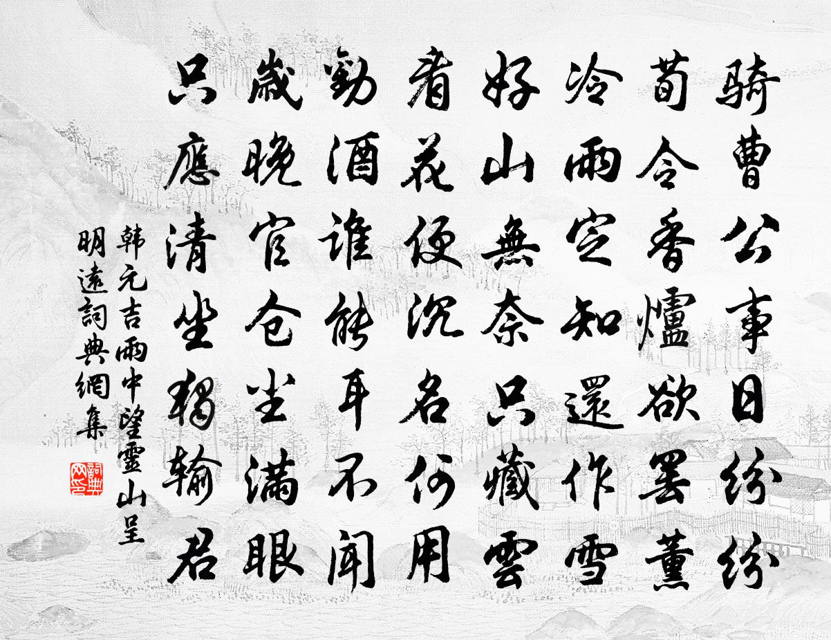 詩詞名句歷史字典書法欣賞書法字典國語詞典說文解字康熙字典古漢語字典標 題 作 者 詩 句 雨中望靈山呈明遠作者:韓元吉 朝代:宋代雨中望靈山呈明遠原文騎曹公事日紛紛,荀令香爐欲罷薰。冷雨定知還作雪,好山無奈只藏雲。看花便沉名何用,勸酒誰能耳不聞。歲晚官倉塵滿眼,只應清坐獨輸君。詩詞問答問:雨中望靈山呈明遠的作者是誰?答:韓元吉問:雨中望靈山呈明遠寫於哪個朝代?答:宋代問:韓元吉的名句有哪些?答:韓元吉名句大全韓元吉雨中望靈山呈明遠書法欣賞雨中望靈山呈明遠書法作品詩詞推薦送資深知潼川府袁說友〔宋代〕昔日班行憶舊遊,天涯今已說離愁。珠璣咳唾頻傾倒,風月江山幾倡酬。三接自應還北闕,一麾猶欲惠東州。與君【南呂】一枝花_連雲棧上馬鄧玉賓〔元代〕連雲棧上馬去了銜,亂石灘里舟絕了纜。取驪龍頦下珠,飲鳩鳥酒中酣。闊論高談,是一個無斤兩的風雲怛,負彭心齋諱逢源自作頌呈師師於一句下加三句釋印肅〔宋代〕中有居士,吞光飲露。無相光中有相身,無明路上無生路。深村釋文珦〔宋代〕深村堪就隱,隨處有人家。地遠官無禁,年豐酒易賒。煙波藏釣艇,山雨送樵車。絕似桃源里,唯無洞口花。夏日田園雜興范成大〔宋代〕二麥俱秋斗百錢,田家喚作小豐年。餅爐飯甑無飢色,接到西風熟稻天。雲居還值旱懷舊遊寄楊文仲二首王阮〔宋代〕四野盡龜兆,一天常火雲。夜涼清似水,晝旱氣如焚。龍懶漸無用,天高寂不聞。我無田可慮,只慮眾紛紛。減字木蘭花 為監司壽曹伯啟〔元代〕乾坤清氣。崧岳生申名蓋世。白簡霜飛。不為人間鼠發機。要期莊算。九十春光都占斷。平秩南訛。管領薰風入舜使風船梅堯臣〔宋代〕清淮直上水連天,坐看高帆後復前。自是乘風有遲速,不由人力愛爭先。思歸蔡戡〔宋代〕久留瘴嶺苦思歸,安得身如越鳥飛。老去宦情真是薄,年來樂事覺全稀。衰顏得酒還如少,病骨添衣卻似肥。只為淮上亂後寄子都兄五詩李洪〔宋代〕憶昨王師北渡江,山東豪傑已爭降。銜枚夜雪俄平蔡,斫樹明書果死龐。志士裹屍須馬革,舊官祭灶熟羊腔。老奸觀獵會圖朱翌〔宋代〕一日射雉六十三,命中要是人所難。一日射虎三直六,驍勇無前誰不伏。沙平草軟雪泥乾,手拓弓弦腰兩鏃。祥麟宿胡氏溪亭項斯〔唐代〕獨住水聲里,有亭無熱時。客來因月宿,床勢向山移。鶴睡松枝定,螢歸葛葉垂。寂寥猶欠伴,誰為報僧知。暑不雜興方岳〔宋代〕白鷗吾有一日雅,疇昔見之相與親。滄浪忽欲從此逝,嗔我手揖無詩人。漁父樂/漁歌子徐積〔宋代〕一酌村醪一曲歌。回看塵世足風波。憂患大,是非多。縱得榮華有幾何。入道詩十九首王慶升〔宋代〕一貧徹骨且安貧,顏範雖貧姓字新。任是富豪能敵國,不知身死屬何人。移頓六韻乾隆〔清代〕逐水頻移頓,曾無廿里賒,建營今似昨,取勢正還斜。壘或多因舊,灶無須更加,賣蒸原有市,換馬要增茶。內外李彥澤從余求衛公兵法王灼〔宋代〕衛公少時已知兵,坐談厭倒韓擒虎。一朝委事虬須虜。南殲荊盜北鋤虜。出其緒餘教君集,猶謂四夷莫予侮。乃知挽趙秋曉姚燃〔宋代〕一枕春婆夢,如君亦可悲。人間無著處,天上有歸期。光岳失英氣,江湖欠好詩。莫愁身後事,跨灶有諸兒。文宗問終南山蛤蜊瑞相圖贊釋智愚〔宋代〕攧不開,撲不破。人言大士應身,我也疑他真箇。終南山,相應和。喜動龍顏,百僚俱賀,誰知別有彌天過。和詠飛春蔬王柏〔宋代〕東軒清節樂春蔬,傳到孫支百載余。一朝拂袖竟歸去,應嗤介甫未忘魚。社日何曾夢蹴蔬,遯翁波及實君余。菜根名句推薦遊絲冉冉花枝靜,青壁迢迢白鳥過。王守仁《春晴》 秋在水清山暮蟬,洛陽樹色鳴皋煙。王昌齡《送狄宗亨》 秋聲萬戶竹,寒色五陵松。李頎《望秦川》 聽其言,跡其行,察其所能而慎予官。墨子《墨子·09章 尚賢(中)》 綠萼添妝融寶炬,縞仙扶醉跨殘虹曹雪芹《詠紅梅花得“紅”字》 百花頭上開,冰雪寒中見。辛棄疾《生查子·重葉梅》 大鵬飛兮振八裔,中天摧兮力不濟。李白《臨路歌》 相呼相應湘江闊,苦竹叢深日向西。鄭谷《鷓鴣》 久雨寒蟬少,空山落葉深。秘演《山中》 客里相逢,籬角黃昏,無言自倚修竹。姜夔《暗香疏影》