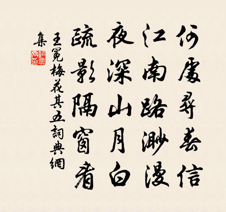 詩詞名句歷史字典書法欣賞書法字典國語詞典說文解字康熙字典古漢語字典標 題 作 者 詩 句 梅花 其五作者:王冕 朝代:元代梅花 其五原文何處尋春信?江南路渺漫。夜深山月白,疏影隔窗看。詩詞問答問:梅花 其五的作者是誰?答:王冕問:梅花 其五寫於哪個朝代?答:元代問:梅花 其五是什麼體裁?答:五絕問:王冕的名句有哪些?答:王冕名句大全王冕梅花 其五書法欣賞梅花 其五書法作品詩詞推薦游洞霄宮盧正中〔宋代〕雲海三山路忽通,形神俱妙玉霄東。八篇擬授無司馬,銀鼎浮珠問葛翁。送鄭編修子四省元姚勉〔宋代〕文章得印天嘗靳,家世傳燈古亦疎。幸甚遷能紬石室,惜哉昶亦誤銀車。君今自是人龍子,名復高橫薦鶚書。讀飽人日登高喬侃〔唐代〕仆本多悲者,年來不悟春。登高一游目,始覺柳條新。杜陵猶識漢,桃源不辨秦。暫若升雲霧,還似出囂塵。賴得高兄徐倉高弟和劉公之兩絕見寄再韻謝之杜范〔宋代〕袖手閒居德日新,靜安增伴四時春。君方入室慰此老,肯作浮陽愧古人。迎春樂晏殊〔宋代〕長安紫陌春歸早。嚲垂楊、染芳草。被啼鶯語燕催清曉。正好夢、頻驚覺。當此際、青樓臨大道。幽會處、兩情多殘句:快晴似為酴醿計范成大〔宋代〕快晴似為酴醿計,急雨還妨燕子飛。水龍吟 慶陳仲洪造家慶樓 此下原有折桂令二舒頔〔元代〕人間何處無樓,算來積善應難得。操持一念,應乎萬事,盡皆陰德。伯仲怡怡,親朋濟濟,雲仍蟄蟄。任才高王粲陪留台李學士筵上賦得文石酒杯分得杯字魏野〔宋代〕知自何山得,磨礱作酒杯。斟疑五色動,醉認一拳開。窪似泉舂出,痕如蘚漬來。主人心樸素,愛惜過瓊瑰。頌古二十首釋了一〔宋代〕清淨行者不涅槃,破戒比丘無地獄。天台相接到西川,總是自家親眷屬。次韻呈與叔兄衛涇〔宋代〕野塘古岸飽經行,風雨塵埃笑滿裳。尊酒清江君意厚,片帆千里客懷傷。出門求益謀何拙,掃幾觀書味更長。歸去石瓮寺儲光羲〔唐代〕遙山起真宇,西向盡花林。下見宮殿小,上看廊廡深。苑花落池水,天語聞松音。君子又知我,焚香期化心。六言詩十首 其七嵇康〔兩漢〕東方朔至清。外似貪污內貞。穢身滑稽隱名。不為世累所攖。所欲不足無營。閒夜二首司空圖〔唐代〕道侶難留為虐棋,鄰家聞說厭吟詩。前峰月照分明見,夜合香中露臥時。此身閒得易為家,業是吟詩與看花。若使八月七日被命上會稽沿途所歷拙於省記為韻語魏了翁〔宋代〕紫幃青繖雜旗旌,烏帽銀撾從鼓鉦。導哄略如州別駕,無人知是漢庭卿。和翟忠惠游焦山蔡肇〔宋代〕吾聞海中之山名黛輿,公紘九野水所輸。沙痕蕝石記千古,堯水滔天才一濡。西瀦七澤並淮湖,南傾百粵包荊舒。唐雎不辱使命劉向〔先秦〕秦王使人謂安陵君曰:“寡人慾以五百里之地易安陵,安陵君其許寡人!”安陵君曰:“大王加惠,以大易小,甚酬聖俞朔風見寄歐陽修〔宋代〕因君朔風句,令我苦寒吟。離別時未幾,崢嶸歲再陰。驚飈擊曠野,餘響入空林。客路行役遠,馬蹄冰雪深。瞻言送嚴心傳鄞縣學教任滿陳著〔宋代〕賢哉昔魯山,心地出芝蘭。不負義方教,相傳本色官。三年腳根正,萬里路頭寬。須信功名事,要教人耐看。題濕洞連文鳳〔宋代〕棲霞嶺頭起煙霧,棲霞洞前撼風雨。洞門深鎖碧泉寒,控寒玉壺冰雪貯。未容俗客漱齒牙,且乞詩人滌肝腑。何當招荊江遊子黃簡〔宋代〕衝風逐飛雲,庭葉紛墜槁。盪子久不歸,佳人坐中老。蕭蕭楚山晚,湛湛江水流。經從望夫石,那得不回頭。名句推薦想翠竹、碧梧風采,舊遊何處。張寧《滿江紅·題碧梧翠竹送李陽春》 日射人間五色芝,鴛鴦宮瓦碧參差。元好問《浣溪沙·日射人間五色芝》 但憑闌無語,煙花三月春愁。鄭覺齊《揚州慢·瓊花》 驚奇喜異者,終無遠大之識;苦節獨行者,要有恆久之操。洪應明《菜根譚·概論》 雨中禁火空齋冷,江上流鶯獨坐聽。韋應物《寒食寄京師諸弟》 最是倉皇辭廟日,教坊猶奏別離歌,垂淚對宮娥。李煜《破陣子·四十年來家國》 開軒面場圃,把酒話桑麻。孟浩然《過故人莊》 莫唱當年長恨歌,人間亦自有銀河。袁枚《馬嵬》 水遠煙微,一點滄洲白鷺飛歐陽修《採桑子·何人解賞西湖好》 弟妹蕭條各何在,干戈衰謝兩相催!杜甫《九日五首·其一》