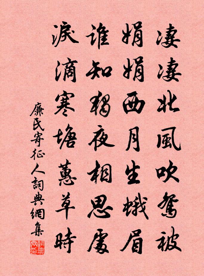詩詞名句歷史字典書法欣賞書法字典國語詞典說文解字康熙字典古漢語字典標 題 作 者 詩 句 寄征人作者:廉氏 朝代:唐代寄征人原文淒淒北風吹鴛被,娟娟西月生蛾眉。誰知獨夜相思處,淚滴寒塘蕙草時。詩詞問答問:寄征人的作者是誰?答:廉氏問:寄征人寫於哪個朝代?答:唐代問:寄征人是什麼體裁?答:七古廉氏寄征人書法欣賞寄征人書法作品注釋全唐詩:卷801-37詩詞推薦漁翁朱繼芳〔宋代〕漁翁家在何許,慣宿蘆花不歸。昨夜江村欲雪,百錢買得蓑衣。石堂陳普〔宋代〕蕭蕭五曲片茆茨,環合群峰共護持。天下七情誰中節,武夷山石百王師。范石湖東歸過鄉國名之芙蓉城余以季夏來游適程公許〔宋代〕環湖曲曲露香清,醉袖褰風取意行。翻愛李園方沼碧,界金幾朵艷羞頳。宿齋堂趙伯溥〔宋代〕燈前孤影吊{熒火換凡}{熒火換凡},為憶親恩未有窮。夜半子遠見啼血處,陡聞澗底鼓松風。次韻弟觀田蠶即事陳著〔宋代〕詩禮雖傳世,農桑不離門。梅天繅雪屋,秧雨種雲村。衣帛知先老,含飴擬弄孫。願言同井樂,無怨亦無恩。憶平泉雜詠。憶辛夷(余赴金陵日,辛夷欲開)李德裕〔唐代〕昔年將出谷,幾日對辛夷。倚樹憐芳意,攀條惜歲滋。清陰須暫憩,秀色正堪思。只待揮金日,殷勤泛羽卮。宿甘露寺僧舍曾公亮〔宋代〕枕中雲氣千峰近,床底松聲萬壑哀。要看銀山拍天浪,開窗放入大江來。青玉案(和)趙長卿〔宋代〕恍如遼鶴歸華表。閱盡人間巧。天乞一堂山對繞。微波不動,岸巾時照。照見星星好。舞風荷蓋從敧倒。碧樹生涼千秋歲(春欲去,二妙老人戲作長短句留之,為社中一笑)周紫芝〔宋代〕送春歸去。說與愁無數。君去後,歸何處。人應空懊惱,春亦無言語。寒日暮,騰騰醉夢隨風絮。盡日間庭雨。紅餘杭久旱趙悅道入境之夕四郊雨足二首曾鞏〔宋代〕旌旗東下路塵開,六月風雲席上回。正恐一方人暍死,直將霖雨過江來。早春田行梅堯臣〔宋代〕風雪雙羊路,梅花溪上村。鳥呼知木暖,雲濕覺山昏。婦子來陂下,囊壺置樹根。予非陶靖節,老去愛田園。贈畫梅呂生樓鑰〔宋代〕西湖處士賦疎影,未似希真好樂章。豈是無情甘澹泊,受它風月幾淒涼。送孔先生還山韓維〔宋代〕先生花樂道者,花於世澹無欲。高風自絕人,正行不違俗。朅來城闕游,不受麈事觸。目久望林壑,駕言反幽築。六日坐法華寺東廊攬秀亭項安世〔宋代〕西亭有名字,未若東亭寬。東亭攬秀者,一目萬峰巒。雲興勢浩浩,海立波漫漫。左見桂陽路,右見春陵灘。入山紹興次韻趙成猶閏七夕項安世〔宋代〕乞得天孫網,人間巧已多。還逢閏重七,奈此眾兒何。耕織關民事,婚姻自俗訛。乾坤大務本,觀象莫蹉跎。送修街坊出丐釋正覺〔宋代〕海上鰲峰裹綺霞,梅仙朋舊有生涯。清眠夢落三山月,和氣吹成一縣華。去駕風舟尋長者,來分甑飯入吾家。待君和崔侍御尉佗〔唐代〕千歲荒台隳路隅,一煩太守重椒塗。感君拂拭意何極,贈爾美婦與明珠。龜堂東窗戲弄筆墨偶得絕句陸游〔宋代〕老人孤寂似無家,午枕初回日已斜。偶得風和身亦健,舍南舍北探梅花。睡起陸游〔宋代〕睡起倀倀扇嬾搖,枕痕著面未全消。山丹石竹俱零落,孤蝶飛來伴寂寥。次曾景建和謝康樂華子岡詩韻趙汝談〔宋代〕君言華子岡,遺蹟在茲山。陰霧虎嘯谷,熙暘烏浴泉。劃疑易區界,遐集古聖堅。丹井砂盪潏,玉林桂蔥阡。或時名句推薦閒門向山路,深柳讀書堂。劉昚虛《闕題》 合軍聚眾, 務在激氣孫臏《孫臏兵法·延氣》 鞭影落春堤,綠錦鄣泥卷。納蘭性德《生查子·鞭影落春堤》 繡嶺宮前鶴髮翁,猶唱開元太平曲李洞《繡嶺宮詞》 老翁逾牆走,老婦出門看。杜甫《石壕吏》 不惜千金買寶刀,貂裘換酒也堪豪。秋瑾《對酒·不惜千金買寶刀》 野橋古梅獨臥寒屋角,疏影橫斜暗上書窗敲。明本《九字梅花詠》 記得綠羅裙,處處憐芳草。賀鑄《綠羅裙·東風柳陌長》 好去不須頻下淚,老僧相伴有煙霞。金地藏《送童子下山》 鄉國真堪戀,光陰可合輕。白居易《洛橋寒食日作十韻》