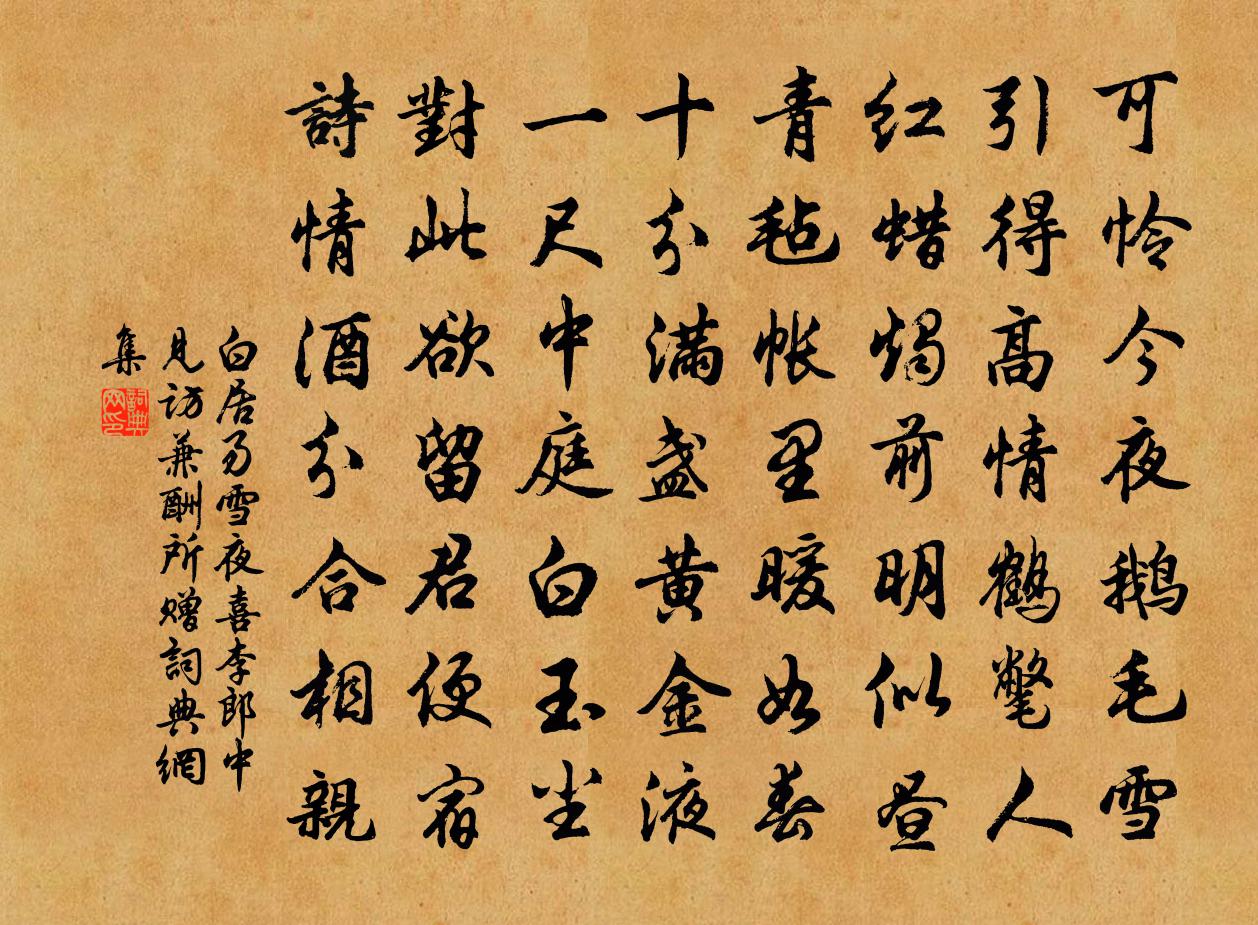 可憐今夜鵝毛雪,引得高情鶴氅人。紅蠟燭前明似晝,青氈帳里暖如春。