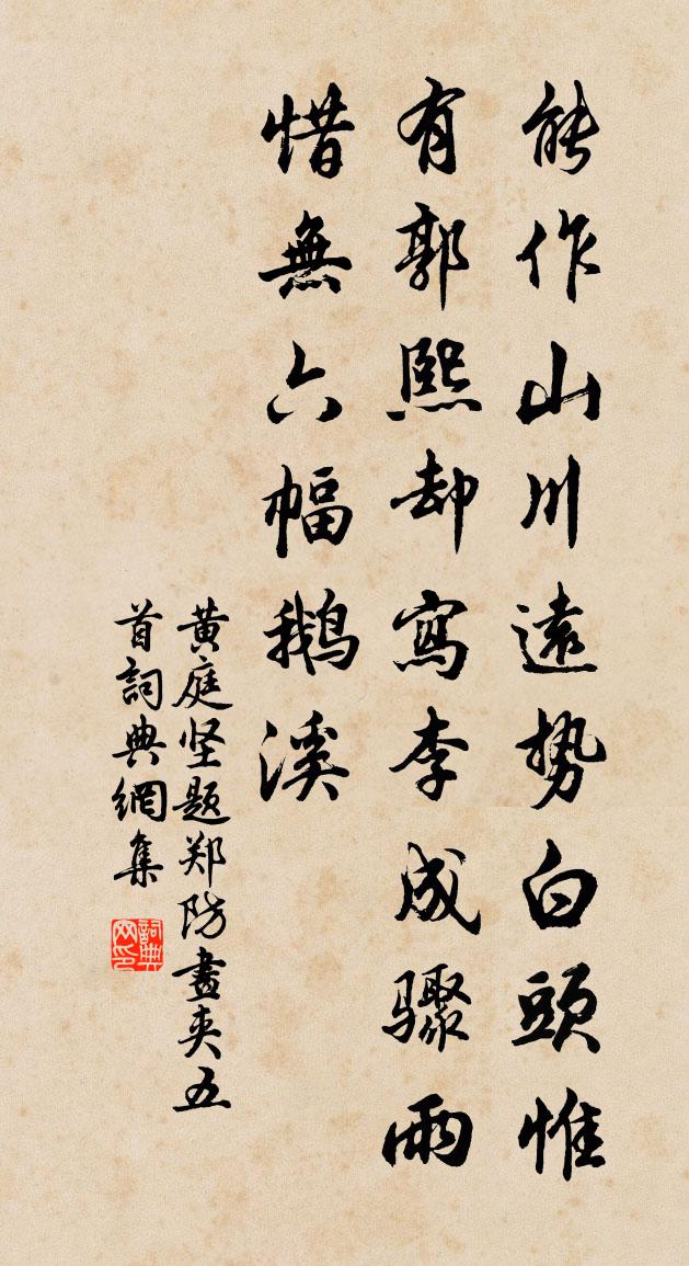 詩詞名句歷史字典書法欣賞書法字典國語詞典說文解字康熙字典古漢語字典標 題 作 者 詩 句 題鄭防畫夾五首作者:黃庭堅 朝代:宋代題鄭防畫夾五首原文能作山川遠勢,白頭惟有郭熙。卻寫李成驟雨,惜無六幅鵝溪。詩詞問答問:題鄭防畫夾五首的作者是誰?答:黃庭堅問:題鄭防畫夾五首寫於哪個朝代?答:宋代問:黃庭堅的名句有哪些?答:黃庭堅名句大全黃庭堅題鄭防畫夾五首書法欣賞題鄭防畫夾五首書法作品詩詞推薦眼兒媚朱敦儒〔宋代〕疊翠闌紅斗纖濃。雲雨綺為櫳。只憂謝了,偏須著意,障雨遮風。瑞雲香霧雖難覓,驀地有時逢。不妨守定,從他擊梧桐(別西湖社友)李珏〔宋代〕楓葉濃於染。秋正老、江上征衫寒淺。又是秦鴻過,霽煙外,寫出離愁幾點。年來歲去,朝生暮落,人似吳潮展轉雨中獨酌陸游〔宋代〕僻郡荒山下,高齋寒雨中。微波生酒綠,短焰擁爐紅。學廢悲身老,民窮祝歲豐。廚人羞雉兔,更憶喚鄰翁。賢者之孝二百四十首樂恢林同〔宋代〕父今為令系,號泣不停聲。彼令亦人耳,而寧不我矜。浣溪沙晏幾道〔宋代〕床上銀屏幾點山,鴨爐香過瑣窗寒。小雲雙枕恨春閒。惜別漫成良夜醉,解愁時有翠箋還。那回分袂月初殘。觀禽鳥哺雛有感賦詩三首示諸子侄何夢桂〔宋代〕考叔分羹我獨無,不如鳴鶴自相孚。世途跋涉牛先喘,仕路馳驅馬已瘏。弗逮子輿三釜養,空餘顏氏一簞癯。蓼莪和元晦雪壓竹韻張栻〔宋代〕山行景物總清奇,知費山翁幾許詩。雪急風號聯騎日,月明霜淨倚闌時。秋夜感懷樂雷發〔宋代〕溽露沾灌莽,華月流高旻,吟嘯嘉此夜,撫化悲蕭辰。蕭辰何所悲,遊子多苦辛。道峻壯力謝,業遙昌志湮。玄鬢立秋日曲江憶元九白居易〔唐代〕下馬柳陰下,獨上堤上行。故人千萬里,新蟬三兩聲。城中曲江水,江上江陵城。兩地新秋思,應同此日情。田居四首秦觀〔宋代〕嚴冬百草枯,鄰曲富休暇。土井時一汲,柴車久停駕。寥寥場圃空,跕跕烏鳶下。孤榜傍橫塘,喧舂起旁舍。田家無俗念凌雲翰〔元代〕等閒屈指,算今來古往,誰為英傑。耳目聰明天賦予,怎肯虛生虛滅。去燕來鴻,飛鳥走兔,世事何時歇。風波境賀新郎(用韻題趙晉臣敷文積翠岩、余欲令築陂於其前)辛棄疾〔宋代〕拄杖重來約。對東風、洞庭張樂,滿空簫勺。巨海拔犀頭角出,來向此山高閣。尚兩兩、三三前卻。老我傷懷登臨和張中大王洋〔宋代〕天作長綃玉作圖,悄然身世在冰壺。歲期共飽如頒粟,端要均行勝得珠。未辨五湖揚短艇,且謀雙鯉喚長須。清朝塞北二首沈佺期〔唐代〕虜障天驕起,秦城地脈分。柏壇飛五將,梅吹動三軍。鋒刃奔濤色,旌旗焰火文。朔風吹汗漫,飄礫灑轒輼。海氣懷妙老吳則禮〔宋代〕屋頭風雨交,喚此耋老夢。粥魚腹遽鳴,來作枕中供。底處有可人,齋缽是日用。時時要同盤,穿雪菜甲動。過陳公逕二首楊萬里〔宋代〕去歲陳公逕里松,船中仰看愛松風。只今身在松風裡,下看江船西復東。見遠亭上王郎中王安石〔宋代〕高亭豁可望,朝暮對溪山。野色軒楹外,霞光幾席間。樹侵蒼靄沒,鳥背夕陽還。草帶平沙闊,煙籠別戍閒。圃畦念奴嬌 歸潛志卷八按此詞,朝野遺記作張孝宇文虛中〔金代〕疏眉秀目。看來依舊是,宣和妝束。飛步盈盈姿媚巧,舉世知非凡俗。宋室宗姬,秦王 * ,曾嫁欽慈族。干戈浩送万俟持正三首李新〔宋代〕東湖春水歸,湖上主人去。紅塵舞衿暗,水面空落絮。明月悵孤風,長安在何處。和偃溪釋心月〔宋代〕謝郎無月夜撐船,不覺平沈偃水邊。隨手一篙盤得轉,渾家洗腳 * 眠。名句推薦日夕涼風至,聞蟬但益悲。孟浩然《秦中感秋寄遠上人 / 秦中寄遠上人》 夜中不能寐,起坐彈鳴琴。阮籍《詠懷八十二首·其一》 黃葉覆溪橋,荒村唯古木。柳宗元《秋曉行南谷經荒村》 興天下之利,除天下之害。墨子《墨子·12章 尚同(中)》 記得去年今夕,釃酒溪亭,淡月雲來去。文徵明《念奴嬌·中秋對月》 千載休談南渡錯,當時自怕中原復。文徵明《滿江紅·拂拭殘碑》 畫船捶鼓催君去。高樓把酒留君住。舒亶《菩薩蠻·畫船捶鼓催君去》 江上晚來堪畫處,釣魚人一蓑歸去。馬致遠《壽陽曲·江天暮雪》 年少辭家從冠軍,金鞍寶劍去邀勛。王涯《塞下曲二首·其二》 上窗風動竹,月微明。呂渭老《小重山·七夕病中》