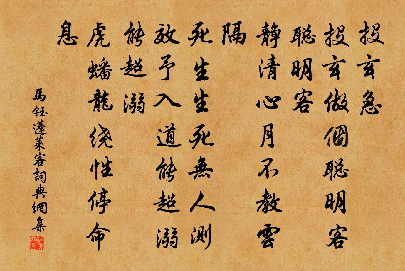 詩詞名句歷史字典書法欣賞書法字典國語詞典說文解字康熙字典古漢語字典標 題 作 者 詩 句 蓬萊客作者:馬鈺 朝代:元代蓬萊客原文投玄急。投玄做個聰明客。聰明客。靜清心月,不教雲隔。死生生死無人測。效予入道能超溺。能超溺。虎蟠龍繞,性停命息。詩詞問答問:蓬萊客的作者是誰?答:馬鈺問:蓬萊客寫於哪個朝代?答:元代問:蓬萊客是什麼體裁?答:詞馬鈺蓬萊客書法欣賞蓬萊客書法作品詩詞推薦雪李石〔宋代〕大地纖毫色色空,寥天望極一鴻蒙。夜凝冷浸梅魂月,朝拂輕回縞帶風。身世密移塵境外,乾坤收入玉壺中。虛堂汪正夫為人撰墓誌有中金之贈因以二絕戲之鄭獬〔宋代〕寶字奇文刻夜台,黃金論價未當才。諸生可是無豪氣,不就韓公乞取來。月夜擬李陵詩傳汪元量〔宋代〕河梁日將暮,遊子安所從。執手古路側,征裾飄長風。行行忽已遠,眇若孤飛鴻。人生非松喬,代謝自有終。長當佛嶺宋庠〔宋代〕鳳谷掩西嶺,鷲宮聯四陬。山晴岩獨霧,林暑澗常秋。風御疏清磬,雲柯抱晚樓。瓊芝遍諸崦,歲暮儻來游。博望侯墓張俞〔宋代〕九譯使車通,君王悅戰鋒。爭殘四夷國,只在一枝筇。萬松亭有感張耒〔宋代〕犖确山行穿翠微,石雲秋露濕秋衣。朦朧小睡還成夢,諷詠新詩且療飢。千里歸來人事改,四年辛苦舊容非。只應冬日雜書六首張耒〔宋代〕歲暮北風疾,山深寒日昏。授衣貧厭補,添纊老須溫。懶慢拋書卷,晴明到藥園。鄰家新酒熟,吾敢但空樽。天竺呼猿胡仲弓〔宋代〕眠雲嘯月走枯藤,不是園丁中不膺。自戀香林不歸去,前生恐是住山僧。送方尊師歸嵩山王維〔唐代〕仙官欲往九龍潭,旄節朱幡倚石龕。山壓天中半天上,洞穿江底出江南。瀑布杉松常帶雨,夕陽蒼翠忽成嵐。借問觀潮行周端臣〔宋代〕吳山越山相對青,中有滾滾長江橫。長江誰道不曾改,年來一半沙填平。潮生潮落何時了,萬古人間一昏曉。歲歲賢者之孝二百四十首徐孝克林同〔宋代〕自今所賜饌,特敕許將還。為爾心餉母,君前無所餐。簡寂觀西澗瀑布下作韋應物〔唐代〕淙流絕壁散,虛煙翠澗深。叢際松風起,飄來灑塵襟。窺蘿玩猿鳥,解組傲雲林。茶果邀真侶,觴酌洽同心。曠歲水調歌頭(幕府有和,再用韻)李曾伯〔宋代〕棗頰上秋色,朔漠寇南來。斧塘鋒蝟棼集,腥霧掃難開。細看眼前局面,驚落人間匕箸,砥柱者誰哉。熊虎賈餘勇雪中偶成潘良貴〔宋代〕飛花看六出,俄出臘中來。解驗人情喜,始知天意回。夜闌窗愈白,晚凍日難開。麥熟何時節,饑民正可哀。賈生李商隱〔唐代〕宣室求賢訪逐臣,賈生才調更無倫。可憐夜半虛前席,不問蒼生問鬼神。二郎之官房陵作五言唐律兩章送之曹彥約〔宋代〕入幕曾沾祿,之官始問津。邊城甘冷淡,世路識艱辛。責重杯柈省,公餘簡冊頻。先人清白意,百世尚書紳。郊廟歌辭。享太廟樂章。太和舞佚名〔唐代〕廣樂既備,嘉薦既新。述先惟德,孝饗惟親。七獻具舉,五齊畢陳。錫茲祚福,於萬斯春。八月十五夜有懷梅堯臣〔宋代〕天為水蒼玉,月拕潭面冰。萬里絕瑕玷,百文已澄凝。山河瞭然在,星斗光莫增。借問九州內,豈無陰雲興。緬懷南徐道中范成大〔宋代〕生憎行路與心違,又逐孤帆擘浪飛。吳岫涌雲穿望眼,楚江浮月冷征衣。長歌悲似垂垂淚,短夢紛如草草歸。若有次韻子權京口夜宿見寄王令〔宋代〕寒江漠漠客帆稀,獨泊扁舟望翠微。已瀉綠醽聊自適,更邀白鳥共忘機。水閒海月寒初上,樹盡秋城碧自圍。嗟我名句推薦病骨支離紗帽寬,孤臣萬里客江乾。陸游《病起書懷》 念疇昔風流,暗傷如許。柳如是《金明池·詠寒柳》 惟草木之零落兮,恐美人之遲暮。屈原《離騷》 誠者,天之道也。誠之者,人之道也。誠者,不勉而中不思而得:從容中道,聖人也。誠之者,擇善而固執之者也子思《中庸·第二十章》 苕之華,其葉青青。佚名《苕之華》 凡學之道,嚴師為難。戴聖《禮記·學記》 窮不失義,達不離道。孟子《孟子·盡心章句上·第九節》 澗影見松竹,潭香聞芰荷。孟浩然《夏日浮舟過陳大水亭 / 浮舟過滕逸人別業》 大鵬一日同風起,扶搖直上九萬里。李白《上李邕》 秋已盡,日猶長,仲宣懷遠更淒涼。李清照《鷓鴣天·寒日蕭蕭上瑣窗》