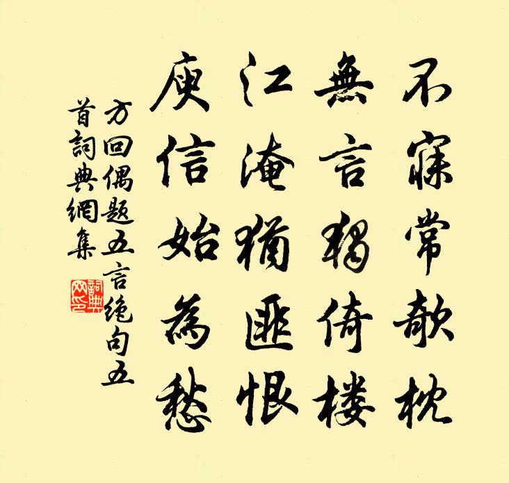 詩詞名句歷史字典書法欣賞書法字典國語詞典說文解字康熙字典古漢語字典標 題 作 者 詩 句 偶題五言絕句五首作者:方回 朝代:宋代偶題五言絕句五首原文不寐常欹枕,無言獨倚樓。江淹猶匪恨,庾信始為愁。詩詞問答問:偶題五言絕句五首的作者是誰?答:方回問:偶題五言絕句五首寫於哪個朝代?答:宋代方回偶題五言絕句五首書法欣賞偶題五言絕句五首書法作品詩詞推薦鷓鴣天·尋菊花無有戲作辛棄疾〔宋代〕掩鼻人間臭腐場。古來惟有酒偏香。自從歸住雲煙畔,直到而今歌舞忙。呼老伴,共秋光。黃花何事避重陽。要知祭貓梅堯臣〔宋代〕自有五白貓,鼠不侵我書。今朝五白死,祭與飯與魚。送之於中河,{左口右兄}爾非爾疏。昔爾齧一鼠,銜鳴遶水仙子喬吉〔元代〕眼前花怎得接連枝,眉上鎖新教配鑰匙,描筆兒勾銷了傷春事。悶葫蘆鉸斷線兒,錦鴛鴦別對了個雄雌。野蜂兒難釣台釋北野〔宋代〕自過羊裘七里灘,尋思欲見故人難。殷勤借問溪邊叟,近日誰來把釣竿。與桐廬鄭明府方乾〔唐代〕字人心苦達神明,何止重門夜不扃。莫道耕田全種秫,兼聞退食亦逢星。映林顧兔停琴望,隔水寒猿駐筆聽。卻恐謝鄭如之送酒初十日陳藻〔宋代〕俗緣不許伴僧齋,錯喜重陽避酒杯。誰擬衰翁對衰菊,黃錯猶有白衣來。題故元少尹集後二首白居易〔唐代〕黃壤詎知我?白頭徒憶君。唯將老年淚,一灑故人文。遺文三十軸,軸軸金玉聲。龍門原上土,埋骨不埋名。經棲白舊院二首貫休〔唐代〕竺卿何處去,觸目盡淒涼。不見中秋月,空餘一炷香。殘花飄暮雨,枯葉蓋啼螿。誰禮新墳塔,蕭條渭水傍。國寶兩蟲范成大〔宋代〕鷓鴣憂兄行不得,杜宇勸客不如歸。天涯羈思難繪畫,惟有兩蟲相發揮。復以承晏墨贈之晃沖之〔宋代〕我聞江南墨官有諸奚,老超尚不如庭珪。後來承晏復秀出,喧然父子名相齊。百年相傳文斷碎,仿佛尚見蛟龍背。竹張繼先〔宋代〕雨過江皋淨,風來庭檻清。此君故人好,入夜聽秋聲。再分韻得花字陳造〔宋代〕春工幾時來天涯,人間指顧成豪華。未嘆丹杏無餘葩,能事已到桃李花。東園地勝賓盡嘉,塵邊霏屑杯中霞。將壇金國賀正旦使人到闕紫宸殿宴致語口號崔敦詩〔宋代〕九重帳殿敞層空,清曉群臣宴鎬宮。神護翠華居北極,春隨黃傘下東風。觴行隱隱紅雲里,仗轉曈曈瑞日中。看取送化主釋崇岳〔宋代〕日用分明直似弦,不將佛法污心田。自言世上無仙客,老倒維摩得半邊。田家效陶曹鄴〔唐代〕黑黍舂來釀酒飲,青禾刈了驅牛載。大姑小叔常在眼,卻笑長安在天外。失調名佚名〔宋代〕砌畔蛩吟喧不住。【南呂】四塊玉 閒適關漢卿〔元代〕適意行,安心坐。渴時飲,飢時餐,醉時歌。困來時就向莎茵臥。日月長,天地闊,閒快活。和石昌言以蜀牋南牋答松管之什梅堯臣〔宋代〕青松抽乾龍鱗細,秋兔束毫雞距尖。楊子擬經聊以贈,蜀麻江楮報何嫌。九月二十日率趙彥和王平叔劉誼夫游棲岩寺彥郭印〔宋代〕少時苦愛山,藜杖春復秋。峰巒如佳人,一顧銷百憂。野性不受羈,思與麋鹿游。失腳名宦場,冠纓絡人頭。州家次韻答方元吉胡仲弓〔宋代〕新知如舊識,話久覺情真。雲出壺山早,風行晉水春。家貧因過客,世變為詩人。曾點龍門額,煩君再問津。名句推薦綠兮絲兮,女所治兮。我思古人,俾無訧兮!佚名《綠衣》 擬把傷離情緒,待曉寒重說。納蘭性德《好事近·簾外五更風》 爾曹身與名俱滅,不廢江河萬古流。杜甫《戲為六絕句·其二》 行到水窮處,坐看雲起時。王維《終南別業 / 初至山中 / 入山寄城中故人》 鳳簫聲動,玉壺光轉,一夜魚龍舞。辛棄疾《青玉案·元夕》 青春幾何時,黃鳥鳴不歇。李白《江南春懷》 短長亭子短長橋,橋外垂楊一萬條。錢枚《憶王孫·短長亭子短長橋》 君子思仁義,晝則忘食,夜則忘寐,日旦就業,夕而自省,以歿其身,亦可謂守業矣。戴聖《大戴禮記·曾子制言中第五十五》 淡薄之士,必為濃艷者所疑洪應明《菜根譚·概論》 鴻雁幾時到,江湖秋水多。杜甫《天末懷李白》