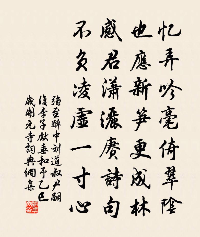詩詞名句歷史字典書法欣賞書法字典國語詞典說文解字康熙字典古漢語字典標 題 作 者 詩 句 醉中劉道叔尹嗣復李子先垂和予乙巳歲開元寺作者:強至 朝代:宋代原文憶弄吟毫倚翠陰,也應新筍更成林。感君瀟灑賡詩句,不負凌虛一寸心。詩詞問答問:《醉中劉道叔尹嗣復李子先垂和予乙巳歲開元寺》的作者是誰?答:強至問:該詩寫於哪個朝代?答:宋代書法欣賞醉中劉道叔尹嗣復李子先垂和予乙巳歲開元寺書法作品詩文賞析【原題】:醉中劉道叔尹嗣復李子先垂和予乙巳歲開元寺仁王院詠竹二十八字復依元韻走筆答之詩詞推薦白山茶雜花陳宓〔宋代〕奇葩冬後蕊,羞澀見東風。不變冰霜操,從他百卉紅。芍藥包紅錦,橘花爛明珠。不復憶海棠,飄零煙雨中。懷子仁師釋智圓〔宋代〕寥寥塵跡遠,禪外動閒思。水國人歸後,秋軒月白時。鳴蛩藏壞壁,幽鳥立寒枝。獨坐誰相問,微吟鑷病髭。念奴嬌 登多景樓陳亮〔宋代〕危樓遠望,嘆此意、今古幾人曾會。鬼設神施,渾認作、天限南疆北界。一水橫陳,蓮崗三面,做出爭雄勢。六朝遺詩朱宮人〔宋代〕既不辱國,倖免辱身。世食宋祿,羞為北臣。妾輩之死,守於一貞。忠臣孝子,期以自新。春意漸深送客至山麓田舍來往道中復逢法上人釋正覺〔宋代〕鳥拳花枝作春語,風日煥然晞宿雨。水肥山翠木欣欣,芳事駢羅不容數。次韻康慶之催借所著及謝見過方回〔宋代〕聞道公家所著書,擔囊荷篋喘肩夫。定應未肯輕傳借,良賈深藏有若無。偈頌一百零四首釋紹曇〔宋代〕坐斷白雲,萬機寢息。黃葉止啼,總不消得。閒倚危闌看瀑花,縱乾坤眼清無極。清無極,自謂太平僧,豈知堯舜春寒梅堯臣〔宋代〕春晝自陰陰,雲容薄更深。蝶寒方斂翅,花冷不開心。亞樹青簾動,依山片雨臨。未嘗辜景物,多病不能尋。寄劉德父李流謙〔宋代〕解攜仍是一年余,本自情親聽跡疎。子去合登青瑣闥,人言方駕短轅車。向來花月空餘夢,近日詩文定起予。塞雁古琴吟邵雍〔宋代〕長隨書與棋,貧亦久藏之。碧玉琢為軫,黃金拍作徽。典多因待客,彈少為求知。近日僮奴惡,須防煮鶴時。送袁季源之婺州因簡范經歷戴表元〔宋代〕為山不願高,為水不原深。水深蛟龍集,山高虎豹蹲。我有避人法,終日衣冠林。煌煌錢塘城,游塵書為陰。豈無置酒簽廳觀荷徐判官攜家釀四首曾幾〔宋代〕綠水波深欲上階,紅蕖香勸要傳杯。幕中自有兩佳客,又載青州從事來。高師魯以詩求鶴膝杖且有詩壇尋盟之語戲次其陳棣〔宋代〕榮枯寵辱盡強名,老去無堪只自驚。尤物端能亂人意,粗官安能有詩情。暫憑竹杖聊相謔,敢對金樽略放行。果向次韻公辟州宅月夜偶成秦觀〔宋代〕繚繞千重雨後涼,月含秋色上東方。風催絡紓歸金井,月轉檀欒蔭畫堂。遊目騁懷佳興發,感時撫事壯心傷。歸來偈頌五十一首釋大觀〔宋代〕蓮開陸地,海涌鰲山。不知今夕是何夕,山林城市約同持。和李天麟秋懷五絕句楊萬里〔宋代〕夜把新詩百遍開,句如紅藥與蒼苔。如何作許無端甚,押盡車斜始送來。思歸八絕胡寅〔宋代〕傳家素業祗圖書,永日沉涵樂有餘。方信此心無所著,山林鐘鼎一蘧廬。歸興呈吳夢祥華岳〔宋代〕魚雁音書少,關山夢寐遙。對花思粉面,遇□□□□。喜意鵲應報,歸心馬更驕。西風綽鞭{左革右登},飛□□馮生畫荷花蘇泂〔宋代〕湖上看花意欲迷,年年花謝憶花時。如今一見馮生畫,早晚看花更不疑。點絳唇元好問〔金代〕把酒留春,醉扶紅袖花前倒。落花風掃。紅雨深芳草。又恨春遲,又恨春歸早。花應笑。惜春人老。枉被春風惱。名句推薦空山松子落,幽人應未眠。韋應物《秋夜寄邱員外 / 秋夜寄丘二十二員外》 於事事物物上求至善,卻是義外也。王陽明《傳習錄·卷上·徐愛錄》 一朝春盡紅顏老,花落人亡兩不知。曹雪芹《紅樓夢·第二十七回》 多知而無親,博學而無方,好多而無定者,君子不與。荀子《荀子·大略》 寒雨連江夜入吳,平明送客楚山孤。王昌齡《芙蓉樓送辛漸》 今朝有酒今朝醉,明日愁來明日憂。佚名《增廣賢文·上集》 得其所利,必慮其所害;樂其所成,必顧其所敗。劉向《說苑·敬慎》 芳草已雲暮,故人殊未來。韋莊《章台夜思》 學不可以已。荀子《荀子·勸學》 垂柳不縈裙帶住。漫長是、系行舟。吳文英《唐多令·惜別》
