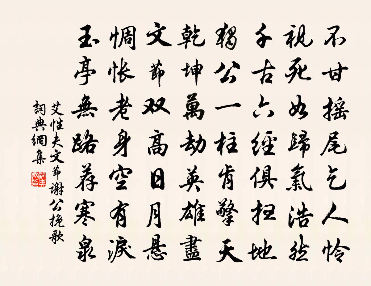 詩詞名句歷史字典書法欣賞書法字典國語詞典說文解字康熙字典古漢語字典標 題 作 者 詩 句 文節謝公輓歌作者:艾性夫 朝代:宋代文節謝公輓歌原文不甘搖尾乞人憐,視死如歸氣浩然。千古六經俱掃地,獨公一柱肯擎天。乾坤萬劫英雄盡,文節雙高日月懸。惆悵老身空有淚,玉亭無路薦寒泉。詩詞問答問:文節謝公輓歌的作者是誰?答:艾性夫問:文節謝公輓歌寫於哪個朝代?答:宋代問:文節謝公輓歌是什麼體裁?答:七律艾性夫文節謝公輓歌書法欣賞文節謝公輓歌書法作品詩詞推薦左遷至藍關侄孫湘韓愈〔唐代〕一封朝奏九重天,夕貶朝陽路八千。欲為聖明除弊事,肯將衰朽惜殘年。雲橫秦嶺家何在,雪擁藍關馬不前。知汝初過漢江佚名〔唐代〕襄陽好向峴亭看,人物蕭條值歲闌。為報習家多置酒,夜來風雪過江寒。蠶麥二首蘇轍〔宋代〕三界人家多鮮福,一時蠶麥得難兼。鋤耰已愧非吾力,湯火尤驚取不廉。貴客爭夸火浣布,貧家粗有水精鹽。薄衫木蘭花(吟詠)莫將〔宋代〕前村雪裡雖然早。爭似橫斜開處好。直饒隔水是江南,也恐一枝春未到。延賓莫恨花陰小。見說芳林今古抱。集花題老融鬥牛圖釋寶曇〔宋代〕牛斗不可近,近則和爾觸。摩撫不動遙,愧山老觳觫。慰我有生意,憐渠無怒心。伊誰為證據,斷崖楓樹林。山居三首劉應時〔宋代〕雨濕茅茨暗,日長天氣溫。心閒忘物累,足懶出柴門。風靜收雲腳,山高露月痕。兒童展編簡,燈火又黃昏。句宋白〔宋代〕勞君贈我古風詩,逋翁所謂撲凸奇。自題連文鳳〔宋代〕每恨詩才短,吟來兩目昏。雖然五七字,難似萬餘言。雅道扶不起,苦心誰共論。幾迴風雨夜,哭殺杜陵魂。漁家傲周紫芝〔宋代〕路入雲岩山窈窕。岩花滴露花頭小。香共西風吹得到。秋欲杪。天還未放秋容老。誰道水南花不好。猶勝金蕊渾如夜行自戲六五言晁說之〔宋代〕觸熱褦襶幾許,我生何艱哉。九天星斗初轉,汲井意徘徊。不解鳴珂帝所,踉蹡沒塵埃。為問晚嫁盧姬,一笑為誰偈頌一百三十六首釋惟一〔宋代〕辛未元正有則語,大地無人知落處。屋角山禽破啼,為人一一從頭舉。歲旦無風,甲子不雨。和曾谹父見寄二首曹勛〔宋代〕小庵雲雨上,朝檻俯晴雷。客子得幽勝,道人時往來。閒情聊自喜,昔事只堪哀。沖牆從茲老,何能敘玉台。答彭州職方朱員外公綽宋祁〔宋代〕四忝方州換隼旟,九番官樹老儲胥。淹留太史編殘藁,廢忘河東篋里書。遠想淵雲才不逮,略通邛僰計仍疏。夢回臨江仙譚處端〔元代〕稽首吾門諸道友,降心向外休尋。等閒容易費光陰。修行何是苦,不了我人心。滅取無明三孽火,勿令境上相侵。回京口文天祥〔宋代〕早作田文去,終無蘇武留。偷生寧伏劍,忍死欲焚舟。逸驥思超乘,飛鷹志脫鞲。登樓望江上,日日數行艘。百一詩 十九應璩〔魏晉〕茍欲娛耳目。快心樂腹腸。我躬不悅歡。安能慮死亡。偶成張耒〔宋代〕漫學文章弊性靈,屠龍藝就誤平生。翩翩仕路新冠蓋,何用揚雄強作經。留題仙遊潭中興寺寺東有玉女洞洞南有馬融讀蘇軾〔宋代〕敢渡清潭百尺皎無泥,山木陰陰谷鳥啼。蜀客曾游明月峽,秦人今在武陵溪。獨攀書室窺岩竇,還訪仙姝款石閨。山中春思獨孤及〔唐代〕獺祭川水大,人家春日長。獨謠晝不暮,搔首慚年芳。靡草知節換,含葩向新陽。不嫌三徑深,為我生池塘。亭午和闕乾雪中韻李曾伯〔宋代〕青女欺寒未肯霜,先將銀鑠散祥光。芙蓉曉院不禁老,檐蔔滿林惟欠香。冷入寶環銷翠羽,聲隨石鼎煮羊腸。兔園名句推薦機心信隱,交接靡密,庶下者知威而畏也。來俊臣《羅織經·治下卷第三》 樓頭客子杪秋後,日落君山元氣中。陳與義《登岳陽樓》 二月春花厭落梅。仙源歸路碧桃催。晏幾道《浣溪沙·二月春花厭落梅》 意輕千金贈,顧向平原笑。李白《古風·齊有倜儻生》 朝辭白帝彩雲間,千里江陵一日還。李白《早發白帝城 / 白帝下江陵》 山高月小,水落石出。蘇軾《後赤壁賦》 桃李務青春,誰能貫白日。李白《長歌行》 面譽者不忠,飾貌者不情戴聖《大戴禮記·文王官人第七十二》 富潤屋,德潤身,心廣體胖曾子《禮記·大學》 願我如星君如月,夜夜流光相皎潔。范成大《車遙遙篇》