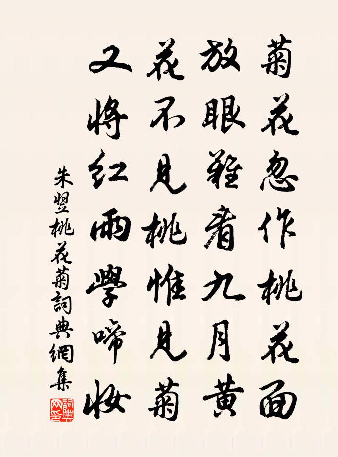 詩詞名句歷史字典書法欣賞書法字典國語詞典說文解字康熙字典古漢語字典標 題 作 者 詩 句 桃花菊作者:朱翌 朝代:宋代桃花菊原文菊花忽作桃花面,放眼難看九月黃。花不見桃惟見菊,又將紅雨學啼妝。詩詞問答問:桃花菊的作者是誰?答:朱翌問:桃花菊寫於哪個朝代?答:宋代朱翌桃花菊書法欣賞桃花菊書法作品詩詞推薦春日即事九首李廌〔宋代〕藹藹花絮亂,紛紛蜂蝶多。今年春復爾,不飲奈愁何。太常引 傷逝倪瓚〔元代〕門前楊柳密藏鴉。春事到桐花。敲火試新茶。想月*、雲衣故家。苔生雨館,塵凝錦瑟,寂寞聽鳴蛙。芳草際天涯四月二十八日作又行遍人間病不禁,陸游〔宋代〕四月欲盡五月初,九十未及八十餘。開口何曾談世事,收身且復愛吾廬。元日·晨雞兩遍報方乾〔唐代〕晨雞兩遍報更闌,刁斗無聲曉漏乾。暖日映山調正氣,東風入樹舞殘寒。軒車欲識人間感,獻歲須來帝里看。才酌詩一首高荷〔宋代〕妄作非吾事,罷官飢爾曹。此心常去住,何日遂孤高。雁伴烏瘡脫,蠅營狗跛勞。不如張仲蔚,門外長蓬蒿。岳陽樓元稹〔唐代〕岳陽樓上日銜窗,影到深潭赤玉幢。悵望殘春萬般意,滿欞湖水入西江。山谷跋楊妃齒痛圖謂多食側生致動搖其左單艾性夫〔宋代〕蜀帝化子規,啼血思還家。玉環苦微疢,寄汝呼痛牙。物類相殊或相托,悲鳴一夜梨花落。三郎玉柙已成塵,半匕登碧落堂聶致孫〔宋代〕渺渺桑田注白波,幽幽花洞憶真多。丹成已在風煙上,鶴返其如城郭何。月下清池明老劍,雲凝碧落聽笙歌。五陵點絳唇 病中偶成許有壬〔元代〕酒病詩愁,好春三月常孤負。開門春暮。新綠迷雲樹。一片飛花,綰住遊絲舞。東風妒。等閒吹去。散亂隨紅雨。大自在庵郭印〔宋代〕茫茫三界中,何處不自在。情存想未除,轉側成拘礙。壬寅元日趙蕃〔宋代〕壯歲頻羈宦,王春又履端。東占風料峭,北驗斗闌乾。歷數堯年永,條章漢詔寬。殘生侶麋鹿,何路接鵷鸞。塵土呈介甫王令〔宋代〕塵土紛紛起處微,只隨風力亂噓吹。高張白霧橫宮闕,低引輕雲暗路岐。客坐昏蒙歸耳目,人行斑白上鬚眉。誰知催雪方岳〔宋代〕作箋擬上朝元殿,為說梅須雪轉香。杯雋已生詩意思,硯寒更作夜商量。輕明玉費天工巧,頃刻花催帝子忙。醉夢益清堂偶作自強〔宋代〕大洞仙宮古有名,要觀主宰立平生。掛琴堂上心尤逸,種菊池邊景益清。巳喜襟期同我得,旋將契誼與君盟。丹泉七夕感懷用尤悔庵原韻陳維崧〔清代〕鵲又填橋矣。滿長安、千門砧杵,四圍雲水。長記常年茅屋下,佳節團圞能幾!有和病、雲鬟雪涕。縱病倘然人尚讀書未終卷而睡有感陸游〔宋代〕暮年緣一嬾,百事俱棄置;今遂嬾到書,把卷輒坐睡。其餘嬾則已,感此獨歔欷。念昔少壯時,日夜痛磨礪,誓言李允蹈判院送酒四斗予答書乃誤以為二斗作小陸游〔宋代〕冷官誰顧雀羅門?一紙惟君肯見存。堪笑放翁昏至此,乘壺誤寫作朋樽。林亭書事陸游〔宋代〕吏退林亭夏日長,烏紗白紵自生涼。遶檐密葉帷三面,覆水青萍錦一方。約束蠻僮收藥富,催呼稚子曬書忙。平日句釋惠崇〔宋代〕人歸岡舍迥,雁遇諸田遙。村行杜牧〔唐代〕春半南陽西,柔桑過村塢。裊裊垂柳風,點點回塘雨。蓑唱牧牛兒,籬窺茜裙女。半濕解征衫,主人饋雞黍。名句推薦竹外一枝斜,想佳人,天寒日暮。曹組《驀山溪·梅》 恨人間、會少離多,萬古千秋今夕。張埜《奪錦標·七夕》 自在飛花輕似夢,無邊絲雨細如愁。秦觀《浣溪沙·漠漠輕寒上小樓》 夕陽西下,斷腸人在天涯。馬致遠《天淨沙·秋思》 殘日東風,不放歲華去。吳文英《祝英台近·除夜立春》 奢侈之敗家,猶出常情;而慳吝之敗家,必遭奇禍。王永彬《圍爐夜話·第五九則》 蕭蕭梧葉送寒聲,江上秋風動客情。葉紹翁《夜書所見》 榮所眾羨,亦引眾怨。來俊臣《羅織經·固榮卷第六》 人珍我棄、人棄我取沈復《浮生六記·浪遊記快》 青女素娥俱耐冷,月中霜里斗嬋娟。李商隱《霜月》