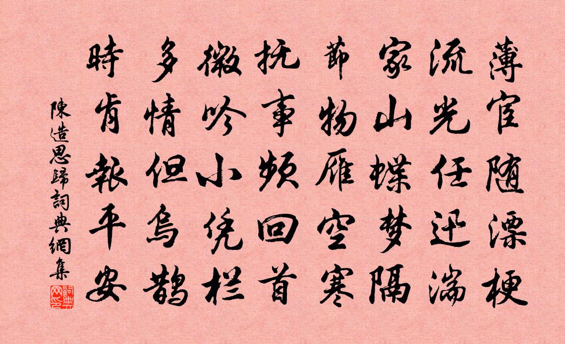 詩詞名句歷史字典書法欣賞書法字典國語詞典說文解字康熙字典古漢語字典標 題 作 者 詩 句 思歸作者:陳造 朝代:宋代思歸原文薄宦隨漂梗,流光任迅湍。家山蝶夢隔,節物雁空寒。撫事頻回首,微吟小憑欄。多情但烏鵲,時肯報平安。詩詞問答問:思歸的作者是誰?答:陳造問:思歸寫於哪個朝代?答:宋代陳造思歸書法欣賞思歸書法作品詩詞推薦和湯無邪廖行之〔宋代〕東風習習初春天,流澌凍解興魚潛。池波生綠紋漪漣,和氣已覺彌天淵。人間佳處不獨此,我有嘉客稱世賢。懷歸以詩句詠梅真與雪霜娛晚景方蒙仲〔宋代〕難得雪成持,不標風無賴。生來避鬧藍,行不超 * 。頌古二首釋曇瑩〔宋代〕溪山盡處夕陽斜,溪上冬風雪滿沙。便是江南舊行路,和煙隔水見梅華。秋日四首宋祁〔宋代〕客心驚暮節,天意歇餘芳。蓮罷池收子,榴成露罅房。綈袍親故暖,紈扇委空涼。庾信真愁否,仍能用斛量。秋夜長曹勛〔宋代〕秋夜長,秋夜長,風高月落飛清霜。征鴻蕭蕭度湘水,草木露冷蒹葭黃。鐵衣老將尚橫槊,胡兒甲馬爭騰驤。閨中長相思(題甘樓)胡翼龍〔宋代〕南山鍾。北山鍾。一聲鐘聲百念空。古今昏曉中。望秋風。數秋風。等得秋來等過鴻。燈前書一封。偈頌七十八首釋正覺〔宋代〕借婆裙子拜婆年,買盡風光不著錢。劈面來時莫迴避,個人里許有生緣。雨中花慢趙長卿〔宋代〕帊子分香,羅巾拭淚,別來時、未覓悽惶。上得船兒來了,剗地淒涼。可惜花前月里,卻成水遠山長。做成恩愛,喜雨姜特立〔宋代〕昨宵榾榾車聲喧,人情嗷嗷不得眠。今朝一雨忽大足,人聲車聲俱寂然。吁嗟血汗滴焦土,寸寸灌田亦良苦。天工送王應祥李石〔宋代〕進取雖狂我不狂,跨鰲今日鄭公鄉。未偕西蜀三年計,來訪東湖九月霜。桃李山城漫紅白,橘橙峽路看青黃。修門涑口守風陳造〔宋代〕辦舟留襄陽,辟風泊涑口。和行秋甲辰,初到夏癸酉。跛鱉已自慣,束髮至衰朽。坐是冥得喪,況復多病後。絕憐元夜病起二首陳造〔宋代〕節物撩佳興,浮生盍自寬。山城如許樂,燈市不多寒。微步漂香細,行歌惜夜闌。何人欹醉帽,朱袖簇歸鞍。袁州慶豐堂十閒詠祖無擇〔宋代〕晴軒足清趣,閒與鶴開籠。寄語北山侶,無驚蕙帳空。午睡董嗣杲〔宋代〕茶灶煙沉午睡遲,故山雲遠思依依。桑麻得雨侵檐長,燕譽臨風掠水飛。簪帽無花徒繞砌,探瓶有粟且扃扉。翔空餞海鹽史後樂朱南傑〔宋代〕秦溪邑大號難治,後樂三年以德為。海闊有樓還舊觀,堂深無日不新詩。虛舟只載來時物,實惠常教去後思。相業送朝宗兼簡閩帥吳芾〔宋代〕年來知我不如公,日日相思恨不逢。君若見時須問我,為言老子已龍鍾。千秋歲(壽圓北山六十)彭子翔〔宋代〕重陽來未。誰領黃花意。斟玉醑,歌金縷。雲山籠瑞彩,風月溶清氣。北山頂,壽星一點光無際。六十今朝是。甲海門潮別浩初師劉禹錫〔唐代〕前日過蕭寺,看師上講筵。都上禮白足,施者散金錢。方便無非教,經行不廢禪。還知習居士, * 侍彌天。轉正郎後寄獻集賢相公鄭谷〔唐代〕予名初在德門前,屈指年來三十年。自賀孤危終際會,別將流涕感階緣。止陪鴛鷺居清秩,濫應星辰浼上玄。平昔偈傾一百六十九首釋智朋〔宋代〕兜率宮中把不定,松山山裹借場開。普天匝地皆泥水,那更當生補處來。名句推薦繁采寡情,味之必厭。劉勰《文心雕龍·情采》 江春不肯留歸客,草色青青送馬蹄。劉長卿《送李判官之潤州行營》 佳人重勸千長壽。柏葉椒花芬翠袖。毛滂《玉樓春·己卯歲元日》 福輕乎羽,莫之知載;禍重乎地,莫之知避。莊子《莊子·內篇·人間世》 傷心故人去後,冷落新詩。晁沖之《漢宮春·梅》 長者梢,深者底。宋濂、王褘《元史·列傳·卷二》 好雨知時節,當春乃發生。杜甫《春夜喜雨》 去來江口守空船,繞船月明江水寒。白居易《琵琶行 / 琵琶引》 千里黃雲白日曛,北風吹雁雪紛紛。高適《別董大二首》 流水下灘非有意,白雲出岫本無心。佚名《增廣賢文·上集》
