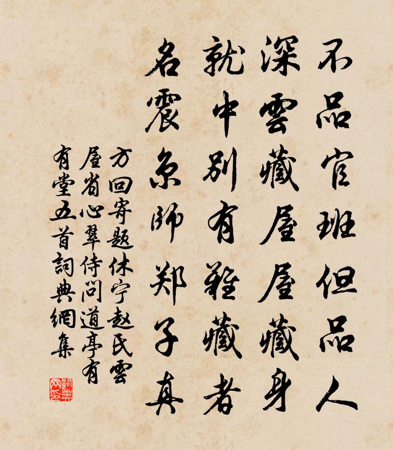 詩詞名句歷史字典書法欣賞書法字典國語詞典說文解字康熙字典古漢語字典標 題 作 者 詩 句 寄題休寧趙氏雲屋省心翠侍問道亭有有堂五首作者:方回 朝代:宋代原文不品官班但品人,深雲藏屋屋藏身。就中別有難藏者,名震京師鄭子真。詩詞問答問:《寄題休寧趙氏雲屋省心翠侍問道亭有有堂五首》的作者是誰?答:方回問:該詩寫於哪個朝代?答:宋代書法欣賞寄題休寧趙氏雲屋省心翠侍問道亭有有堂五首書法作品詩詞推薦寄四明教主釋秘演〔宋代〕古疏傳深旨,清流照瘦顏。四方來問道,半世不離山。養鶴憐終潔,看雲許共間。仍聞焚紀質,幾欲別人間。春草凝露張友正〔唐代〕蒼蒼芳草色,含露對青春。已賴陽和長,仍慚潤澤頻。日臨殘未滴,風度欲成津。蕙葉垂偏重,蘭叢洗轉新。將行愁懷朱淑真〔宋代〕鷗鷺鴛鴦作一池,須知羽翼不相宜。東君不與花為主,何似休生連理枝。嘉禾百詠周都官墓張堯同〔宋代〕不識君名字,應難問子孫。一丘浮水際,神怪欲誰論。清涼院僧房致齋洪咨夔〔宋代〕花片牆陰晚,禽聲屋角晴。東風猶峭在,煨芋坐深明。錢塘迎酒歌楊炎正〔宋代〕錢塘妓女顏如玉,一一紅妝新結束。問渠結束何所為,八月皇都酒新熟。酒新熟,浮蛆香,往醉金釵十二行。十三陽樂故城易時敏〔宋代〕典午河山尚有名,興從陽樂故城生。夕陽門巷丘墟久,春草池塘野水平。廢堞棲烏啼夜月,閒壕留雁叫寒更。人民棗蘇軾〔宋代〕居人幾番老,棗樹未成槎。汝長才堪軸,吾歸已及瓜。赴東都別牡丹令狐楚〔唐代〕十年不見小庭花,紫萼臨開又別家。上馬出門回首望,何時更得到京華。偈頌一百零四首釋紹曇〔宋代〕一口吸西江,赤土塗牛奶。盪盡聖凡情,猶欠這一解。丹霞馬祖,眼見如盲,靈照龐婆,口說如啞。驀劄相逢露一泊舟蘭溪蒲壽宬〔宋代〕江流萬古意,客游邁中年。茫茫見遠樹,渺渺嘆逝川。旅舟泊明月,溪謳出長煙。千帆趣各異,萬里愁共煎。船頭送徐璣徐照〔宋代〕一舸寒江上,梅花共別離。不來相送處,愁有獨歸時。去夢千峰遠,為官三歲期。思君難可見,新集見君詩。四景釋慧空〔宋代〕野闊煙迷樹,江清水學天。白鷗蓋具眼,終日老人邊。寄題向伯元敦止堂胡宏〔宋代〕君不聞伊摯初耕有莘野,祿之弗顧千駟馬。春作秋成隨老農,貧賤甘心萬人下。一朝幡然感三聘,五就成湯五就夏沈坦之將歸溧陽值雨留吾廬久之三首王安石〔宋代〕檐兩亂淋幔,風悲蘭杜秋。相看更促膝,人老自多愁。自省曾豐〔宋代〕肺肝供物態,須鬢管年華。眼閱世更變,口談時過差。眉因公道蹙,手為貴人叉。點檢通身事,都無益自家。偈頌七十六首釋師觀〔宋代〕開眼見明,合眼見暗。開眼合眼,知而故犯。一毫頭上現乾坤,堪笑雲門咦顧鑒。寄西山嵩雪庭釋文珦〔宋代〕支遁還山去,翛然世外心。不曾離磵壑,長是愛雲林。馬放秋場靜,龍眠夜井深。山林如許到,早晚亦相尋。和至聊述懷二首王炎〔宋代〕管城脫帽即詩成,尚挾琴書困筆耕。自可追風千里去,何妨警露九皋鳴。心於外物無榮辱,身與虛名孰重輕。醉里頌證道歌證道歌釋印肅〔宋代〕百獸聞之皆腦裂,穿山透石魔群折。夜來依舊卓長空,飽清風,漱明月。名句推薦彌傷孤舟夜,遠結萬里心。權德輿《月夜江行 / 旅次江亭》 遠送從此別,青山空復情。杜甫《奉濟驛重送嚴公四韻》 莫遣只輪歸海窟,仍留一箭射天山。李益《塞下曲》 今夫飛蓬遇飄風而行千里,乘風之勢也。商鞅《商君書·禁使》 想邊鴻孤唳,砌蛩私語。王沂孫《掃花游·秋聲》 最愛湖東行不足,綠楊陰裏白沙堤。白居易《錢塘湖春行》 驪宮高處入青雲,仙樂風飄處處聞。白居易《長恨歌》 人面不知何處去,桃花依舊笑春風。崔護《題都城南莊》 偷彈清淚寄煙波,見江頭故人,為言憔悴如許。袁去華《劍器近·夜來雨》 天地之道,博也、厚也、高也、明也、悠也、久也。子思《中庸·第二十六章》