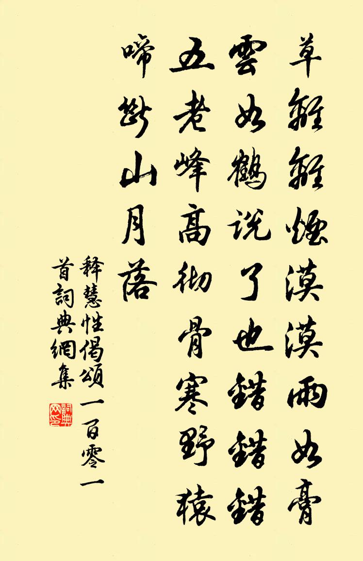詩詞名句歷史字典書法欣賞書法字典國語詞典說文解字康熙字典古漢語字典標 題 作 者 詩 句 偈頌一百零一首作者:釋慧性 朝代:宋代偈頌一百零一首原文草離離,煙漠漠,雨如膏,雲如鶴。說了也,錯錯錯。五老峰高徹骨寒,野猿啼斷山月落。詩詞問答問:偈頌一百零一首的作者是誰?答:釋慧性問:偈頌一百零一首寫於哪個朝代?答:宋代釋慧性偈頌一百零一首書法欣賞偈頌一百零一首書法作品詩詞推薦九日感懷吳芾〔宋代〕淡雲籠日秋容薄,淅淅西風度簾幕。籬邊 * 自重陽,天外幽人正離索。登高那可望長安,記得當年醉豐樂。十千六代祖師贊釋文禮〔宋代〕黃梅再來,青松依舊。前身後身,一場逗漏。七百高僧總作家,唯有南能不唧{左口右留}。伏蒙二十三叔俯和親字韻詩不勝欽嘆輒復用韻晁說之〔宋代〕樂難得似新篇樂,親莫親如同祖親。熟見典刑平世事,恭聞詩禮少年身。五言自發曹劉興,七澤誰知魯衛人。李白省中直夜對雪寄李師素侍郎令狐楚〔唐代〕密雪紛初降,重城杳未開。雜花飛爛漫,連蝶舞徘徊。灑散千株葉,銷凝九陌埃。素華凝粉署,清氣繞霜台。明覺滿庭芳佚名〔宋代〕道教初興,釋門微顯,一興一廢如然。達磨闡教,東土至西天。都是後學晚輩,貪酒色、損壞真源。爭財氣,不依挽北山子何子三首金履祥〔宋代〕每侍圖書右,令人俗慮空。隱憂惟世變,臥病亦春融。聖處一言敬,天然萬理中。音容今永已,哀痛隔幽宮。次韻朱晦翁十梅江梅王炎〔宋代〕玉色不受垢,照影清江濱。江雪豈不寒,枝頭渾似春。句釋贊寧〔宋代〕登樓千里月,欹枕一聲蟬。平南謠楊蟠〔宋代〕海南山似刀,溪惡如發弩。溪山毒煙中人骨,水有蛟蜃陸豺虎。蠻人徭賊行若飛,縱火劫民殺官府。溪中之水漲赤清風十韻薛映〔宋代〕爽氣乘秋至,涼飆盪暑初。泠泠含遠籟,槭槭動輕裙。翠幕波無際,修篁韻有餘。潛驚塞草綠,作拂井桐疏。素髮雜興四首劉克莊〔宋代〕簀中屍忽為秦相,跨下人俄拜楚王。老退已成大父笑,行嘲一任少年郎。閒題王冕〔元代〕樓台矗矗帶山河,金玉重重是帝家。雲合紫駝開虎帳,天連青草入龍沙。春風小殿看飛燕,夜雨重城散落花。甲乙次韻沆侄韓元吉〔宋代〕平生作計本山林,便腹空餘貯古今。致主未忘他日誌,歸耕每動十年心。疏翎浪喜煙霄近,弱植多慚雨露深。早決金陵雜興二百首蘇泂〔宋代〕鳳凰台上鳳凰游,鳳去台空水自流。惆悵何因見李白,采江試覓月明舟。贈張繪秘教九題詩匠林逋〔宋代〕詩流有匠手,萬象片心通。山落分題月,花搖刻句風。勞形忘底滯,巧思出樊籠。唐律如刪正,斯人合立功。采菱曲徐勉〔南北朝〕相攜及嘉月,采菱度北渚。微風吹棹歌,日暮相容與。采采不能歸,望望方延佇。倘逢遺佩人,預以心相許。六月十四次韻樊武仲喜雨魏了翁〔宋代〕誰信夔夔解感神,嚶嚶赤子母心熏。為將一滴翻瓢水,散作千家舉臿雲。大化無端長寂寂,眾形有欲自芸芸。更須漁子溝寄趙員外裴補闕皇甫冉〔唐代〕欲逐淮潮上,暫停漁子溝。相望知不見,終是屢回頭。秋日田園雜興范成大〔宋代〕村巷冬年見俗情,鄰翁講禮拜柴荊。長衫布縷如霜雪,雲是家機自織成。安西聞捷楊時〔宋代〕雅歌不待來天馬,謝質今應閉玉門。早勒勛名上彝鼎,放回春色滿乾坤。名句推薦城上日出群烏飛,鴉鴉爭赴朝陽枝。柳宗元《跂烏詞》 安而不忘危,存而不忘亡,治而不忘亂佚名《易傳·繫辭傳下·第五章》 枯木逢春猶再發,人無兩度再少年。佚名《增廣賢文·上集》 草長鶯飛二月天,拂堤楊柳醉春煙。高鼎《村居》 十五彩衣年,承歡慈母前。孟浩然《送張參明經舉兼向涇州覲省》 此生誰料,心在天山,身老滄洲。陸游《訴衷情·當年萬里覓封侯》 野老念牧童,倚杖候荊扉。王維《渭川田家》 養弟子如養閨女,最要嚴出入,謹交遊。洪應明《菜根譚·概論》 喜傳語者,不可與語。好議事者,不可圖事。陳繼儒《小窗幽記·集醒篇》 江南自是離愁苦,況游驄古道,歸雁平沙。王沂孫《高陽台·和周草窗寄越中諸友韻》