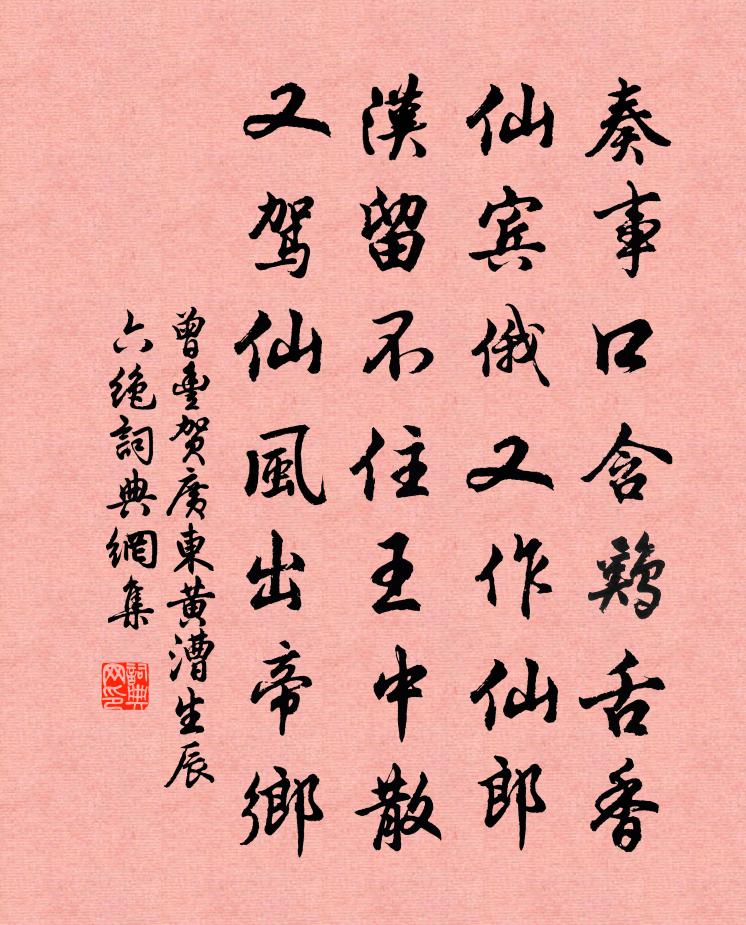 詩詞名句歷史字典書法欣賞書法字典國語詞典說文解字康熙字典古漢語字典標 題 作 者 詩 句 賀廣東黃漕生辰六絕作者:曾豐 朝代:宋代賀廣東黃漕生辰六絕原文奏事口含雞舌香,仙賓俄又作仙郎。漢留不住王中散,又駕仙風出帝鄉。詩詞問答問:賀廣東黃漕生辰六絕的作者是誰?答:曾豐問:賀廣東黃漕生辰六絕寫於哪個朝代?答:宋代曾豐賀廣東黃漕生辰六絕書法欣賞賀廣東黃漕生辰六絕書法作品詩詞推薦上亭北軒對月吹笛得才元舍人昭華引醉霜月草文同〔宋代〕涪江東岸有雲林,巒嶺索回澗谷深。何事遲留未歸去,強顏猶唱草堂吟。祀馬將軍竹枝辭馬之純〔宋代〕桑麻影里千餘戶,弦管聲中百許年。但見年華今日好,也須回首看岩前。成都楊億〔宋代〕五丁力盡蜀川通,千古成都綠酎醲。白帝倉空蛙在井,青天路險劍為峰。漫傳西漢祠神馬,已見南陽起臥龍。張載中秋無月分韻得狂字魏了翁〔宋代〕金低辟老火,月琯行仲商。是為陰之中,正與日相望。浮雲橫相掩,人謂妒且狂。彼雲初無心,此月亦何傷。水月題徐載叔雙桂樓楊萬里〔宋代〕遙憐天上桂華孤,月中何不種兩株。唐人此句真絕唱,後來詩人半語無。向來何人秋風起,吹脫廣寒雙桂子。落向山行方岳〔宋代〕老子浮沉田裡間,犢車轅許野人攀。飲中仙去東西玉,行處不傳大小山。天且莫教三月盡,我今無負一生閒。春寒絕句六十四首張伯端〔宋代〕華池飲罷月凝輝,跨個金龍訪紫微。從此眾仙相識後,海潮陵谷任遷移。雜體詩 孫廷尉綽雜述江淹〔南北朝〕太素既已分。吹萬著形兆。寂動茍有源。因謂殤子夭。道喪涉千載。津梁誰能了。思乘扶接受翰。卓然凌風矯。靜贈玉牒道人二首曾豐〔宋代〕過情君勿許遷除,屈指吾年六十餘。晚景固猶多假日,全工僅可了殘書。習懶徐集孫〔宋代〕風撼西窗夕照明,習成懶散澹無營。頗諳讀易深知命,卻怕吟詩浪得名。款對山僧開月酒,旋蒸湖蟹切秋橙。有來真珠髻佚名〔宋代〕重重山外,苒苒流光,又是殘冬時節。小圓幽徑,池邊樓畔,翠木嫩條春別。纖蕊輕苞,粉萼染、猩猩鮮血。乍幾思蜀陸游〔宋代〕一作劍關客,閒遊將十年。不嫌狂駭俗,自許醉知天。瑞草溪橋路,青衣野廟壖。霜天獵歸處,萬里入橫鞭。新秋夜寄諸弟韋應物〔唐代〕兩地俱秋夕,相望共星河。高梧一葉下,空齋歸思多。方用憂人瘼,況自抱微痾。無將別來近,顏鬢已蹉跎。郊居陸游〔宋代〕平生萬事不容求,惟有郊居志已酬。更漏遠城雞唱曉,歲時無歷葉知秋。潮生小舫行收荻,月落長歌起飯牛。已作朗上人見訪復謁不還留刺而還有詩見謝依韻和王禹偁〔宋代〕湯休訪我我重尋,獨叩松關絕好音。滿袖塵埃回俗步,一爐香火隔禪林。偶留刺字情非淺,忽枉詩章思更深。猶喜歲暮程珌〔宋代〕彩貼隃麋濕,屠蘇琥珀濃。夕陽猶獵日,午夜已春風。如夢令秦觀〔宋代〕幽夢匆匆破後。妝粉亂痕沾袖。遙想酒醒來,無奈玉銷花瘦。回首。回首。繞岸夕陽疏柳。謀隱林洪〔宋代〕篋書如葉半飄零,尚自浮家客帝京。每遇事添新感慨,怕逢人說舊昇平。山如有約青常在,發幸相饒白未生。便作和吳省副梅花半開招憑由張司封飲司馬光〔宋代〕帝鄉春色嶺頭梅,高壓年華犯雪開。正與嘉賓思共醉,不須芳物重相催。從車貯酒傳呼出,側弁簪花倒載回,風雨贈致政楊孟堅宣德楊時〔宋代〕廣文官冷竟誰憐,空負才名四十年。蕭散欲尋濠上侶,飛揚還作酒中仙。龍章繡紱榮何在,鶴氅綸巾靜自便。遙憶名句推薦閒立春塘煙淡淡,靜眠寒葦雨颼颼。鄭谷《鷺鷥》 丹砂成黃金,騎龍飛上太清家,雲愁海思令人嗟。李白《飛龍引二首·其一》 莎衫筠笠。正是村村農務急。盧炳《減字木蘭花·莎衫筠笠》 白梅懶賦賦紅梅,逞艷先迎醉眼開。曹雪芹《詠紅梅花得“梅”字》 尊前只恐傷郎意,閣淚汪汪不敢垂。夏竦《鷓鴣天·鎮日無心掃黛眉》 春路雨添花,花動一山春色。秦觀《好事近·夢中作》 暖風熏得遊人醉,直把杭州作汴州。林升《題臨安邸》 岸邊兩兩三三,浣沙游女。柳永《夜半樂·凍雲黯淡天氣》 君子坦蕩蕩,小人長戚戚。孔子弟子《論語·述而篇》 泥上偶然留指爪,鴻飛那復計東西。蘇軾《和子由澠池懷舊》