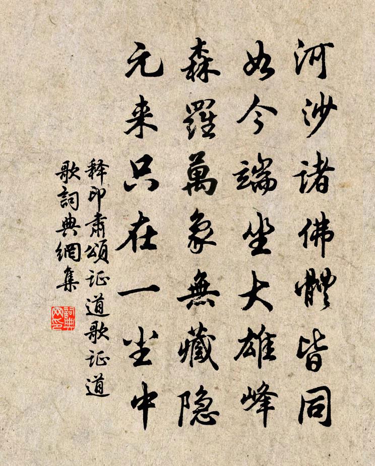 詩詞名句歷史字典書法欣賞書法字典國語詞典說文解字康熙字典古漢語字典標 題 作 者 詩 句 頌證道歌證道歌作者:釋印肅 朝代:宋代頌證道歌證道歌原文河沙諸佛體皆同,如今端坐大雄峰。森羅萬象無藏隱,元來只在一塵中。詩詞問答問:頌證道歌證道歌的作者是誰?答:釋印肅問:頌證道歌證道歌寫於哪個朝代?答:宋代釋印肅頌證道歌證道歌書法欣賞頌證道歌證道歌書法作品詩詞推薦同官皆和複次韻曾幾〔宋代〕華屋落山丘,悲歌詠曹植。故有主林神,百年依正直。再疊仇遠〔宋代〕雪溪漁隱者,郊島是前身。乍見猶疑傲,相逢不說貧。鶴招窮處士,梅伴老詩人。時共論文酒,衰顏少借春。淮海對雪贈傅靄 ( 一作淮南對雪贈孟浩然 )李白〔唐代〕朔雪落吳天,從風渡溟渤。海樹成陽春,江沙浩明月。興從剡溪起,思繞樑園發。寄君郢中歌,曲罷心斷絕。廣化寺陳桷〔宋代〕山高不受暑,秋到十分涼。望外去程遠,閒中度日長。寺林投宿鳥,山路自歸羊。物物各有適,羈愁逐異鄉。送韓六玉汝宰錢塘梅堯臣〔宋代〕頃尋高士廬,正值浸湖雪。雪中千萬峰,參差縣前列。僧居或隱見,岸樹隨曲折。驚鳧如避人,遠向寒煙滅。潛希酹江月(壽詹守生日在武夷設醮)卓田〔宋代〕武夷山字,日使君銜上,新來帶得。便覺閒中多勝事,滿眼煙霞泉石。雲卷塵勞,風生芒竹,去作山中客。曉壇朝十一月奉教作李嶠〔唐代〕凝陰結暮序,嚴氣肅長飆。霜犯狐裘夕,寒侵獸火朝。冰深遙架浦,雪凍近封條。平原已從獵,日暮整還鑣。游山陽十首陳造〔宋代〕邗溝帆席即長淮,鬢未霜時慣往回。絳縣老人今若此,此生更復幾番來。江城子·江景蘇軾〔宋代〕湖上與張先同賦,時聞彈箏鳳凰山下雨初晴,水風清,晚霞明。一朵芙蕖,開過尚盈盈。何處飛來雙白鷺,如有意峽中和卜彥才韻方逢振〔宋代〕尹躬樂不在耕莘,樂在明明以及民。貪看回頭多應錯,偶聞變色始知真。聖賢氣象心為大,天地根萌人是仁。認著一翦梅吳文英〔宋代〕遠目傷心樓上山。愁里長眉,別後峨鬟。暮雲低壓小闌乾。教問孤鴻,因甚先還。瘦倚溪橋梅夜寒。雪欲消時,淚和劉賓客玉蕣薛濤〔唐代〕瓊枝的皪露珊珊,欲折如披玉彩寒。閒拂朱房何所似,緣山偏映月輪殘。幽居吟金朋說〔宋代〕種竹為垣護草堂,面山臨水納幽芳。從容泉石無牽絆,不似從前志廟廊。拖肚黃賈似道〔宋代〕頭項焦黃身黑粗,更兼腿大及臀拖。若還牙齒尖而厚,日鬭數番也不多。霜後紀園中草木十二絕范成大〔宋代〕風倒酴醾架,長條頭搶地。趁渠未萌芽,政可相料理。王澤嶺遭洪水孔德紹〔唐代〕地籟風聲急,天津雲色愁。悠然萬頃滿,俄爾百川浮。還似金堤溢,翻如碧海流。驚濤遙起鷺,回岸不分牛。徒知端午帖子詞二十首五溫成皇后合四首歐陽修〔宋代〕依依節物舊年光,人去花開益可傷。聖主聰明無 * ,不須西風返魂香。頌古五首黃龍三闋釋文準〔宋代〕我手佛手,十八十九。雲散月明,痴人夜走。秀野園沈莊可〔宋代〕西京五畝園,花木秀而野。坡仙作此詩,感事記司馬。深夜獨樂堂,氣象極閒雅。晚芳相元佑,勛名動夷夏。小重山 述懷王丹桂〔元代〕猛悟塵勞跳出籠。胸襟多少事,盡成空。逍遙物外效愚蒙。真脫灑,端的好家風,啟戶對松峰。紅塵飛不到,白雲名句推薦自春來、慘綠愁紅,芳心是事可可。柳永《定風波·自春來》 寄治亂於法術,托是非於賞罰韓非及後人《韓非子·大體》 郎騎竹馬來,繞床弄青梅。李白《長干行二首》 人生一世,草長一春。佚名《增廣賢文·上集》 將贍才力,務在博見劉勰《文心雕龍·事類》 命將征西極,橫行陰山側。李白《塞上曲》 邯鄲驛里逢冬至,抱膝燈前影伴身。白居易《邯鄲冬至夜思家》 春未綠,鬢先絲。人間別久不成悲。姜夔《鷓鴣天·元夕有所夢》 為川者決之使導,為民者宣之使言。左丘明《國語·周語·邵公諫厲王弭謗》 無錢休入眾,遭難莫尋親。佚名《增廣賢文·上集》